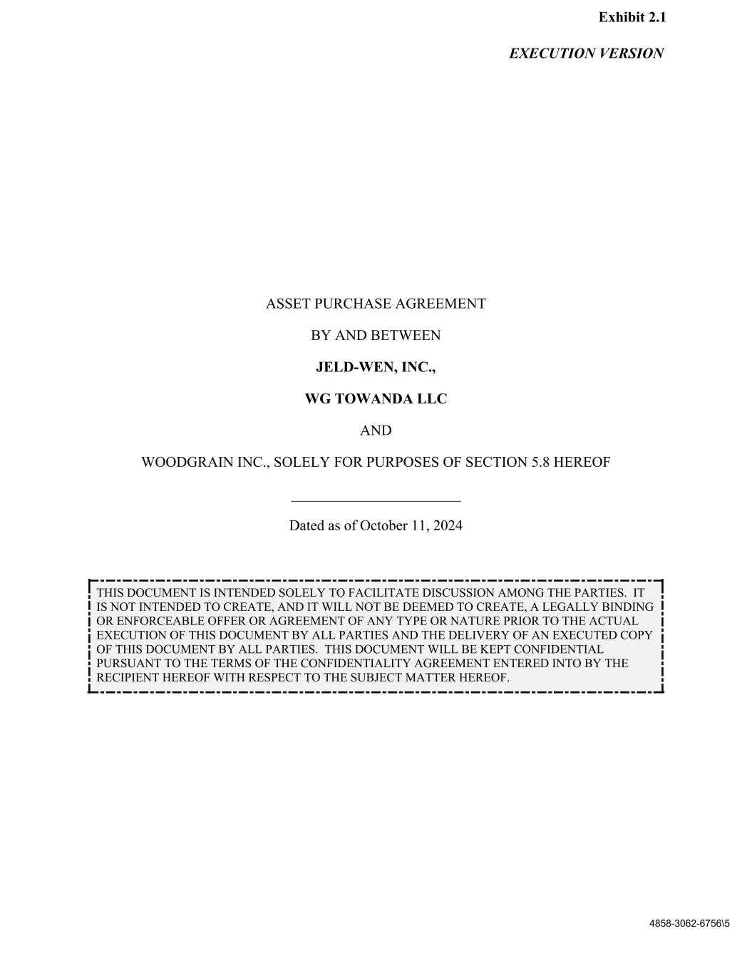 EXECUTION VERSION 4858-3062-6756\5 ASSET PURCHASE AGREEMENT BY AND BETWEEN JELD-WEN, INC., WG TOWANDA LLC AND WOODGRAIN INC., SOLELY FOR PURPOSES OF SECTION 5.8 HEREOF _______________________ Dated as of October 11, 2024 THIS DOCUMENT IS INTENDED SOLELY TO FACILITATE DISCUSSION AMONG THE PARTIES. IT IS NOT INTENDED TO CREATE, AND IT WILL NOT BE DEEMED TO CREATE, A LEGALLY BINDING OR ENFORCEABLE OFFER OR AGREEMENT OF ANY TYPE OR NATURE PRIOR TO THE ACTUAL EXECUTION OF THIS DOCUMENT BY ALL PARTIES AND THE DELIVERY OF AN EXECUTED COPY OF THIS DOCUMENT BY ALL PARTIES. THIS DOCUMENT WILL BE KEPT CONFIDENTIAL PURSUANT TO THE TERMS OF THE CONFIDENTIALITY AGREEMENT ENTERED INTO BY THE RECIPIENT HEREOF WITH RESPECT TO THE SUBJECT MATTER HEREOF. Exhibit 2.1