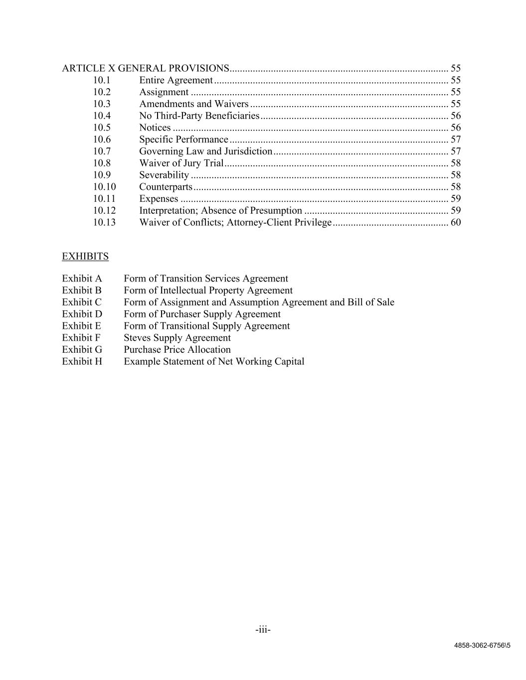 -iii- 4858-3062-6756\5 ARTICLE X GENERAL PROVISIONS ..................................................................................... 55 10.1 Entire Agreement ........................................................................................... 55 10.2 Assignment .................................................................................................... 55 10.3 Amendments and Waivers ............................................................................. 55 10.4 No Third-Party Beneficiaries ......................................................................... 56 10.5 Notices ........................................................................................................... 56 10.6 Specific Performance ..................................................................................... 57 10.7 Governing Law and Jurisdiction .................................................................... 57 10.8 Waiver of Jury Trial ....................................................................................... 58 10.9 Severability .................................................................................................... 58 10.10 Counterparts ................................................................................................... 58 10.11 Expenses ........................................................................................................ 59 10.12 Interpretation; Absence of Presumption ........................................................ 59 10.13 Waiver of Conflicts; Attorney-Client Privilege ............................................. 60 EXHIBITS Exhibit A Form of Transition Services Agreement Exhibit B Form of Intellectual Property Agreement Exhibit C Form of Assignment and Assumption Agreement and Bill of Sale Exhibit D Form of Purchaser Supply Agreement Exhibit E Form of Transitional Supply Agreement Exhibit F Steves Supply Agreement Exhibit G Purchase Price Allocation Exhibit H Example Statement of Net Working Capital