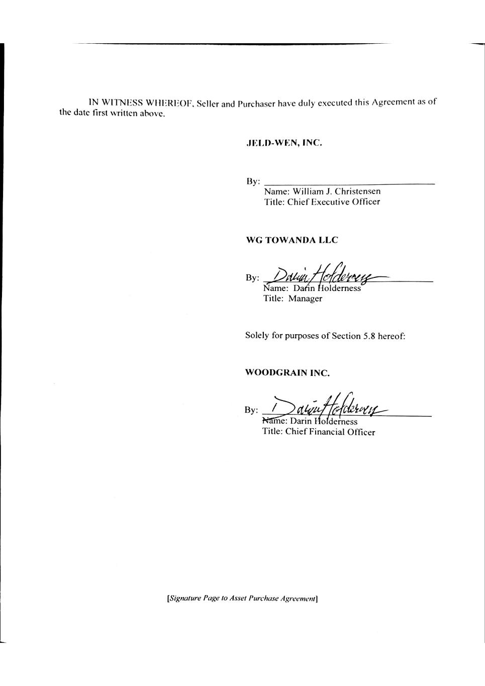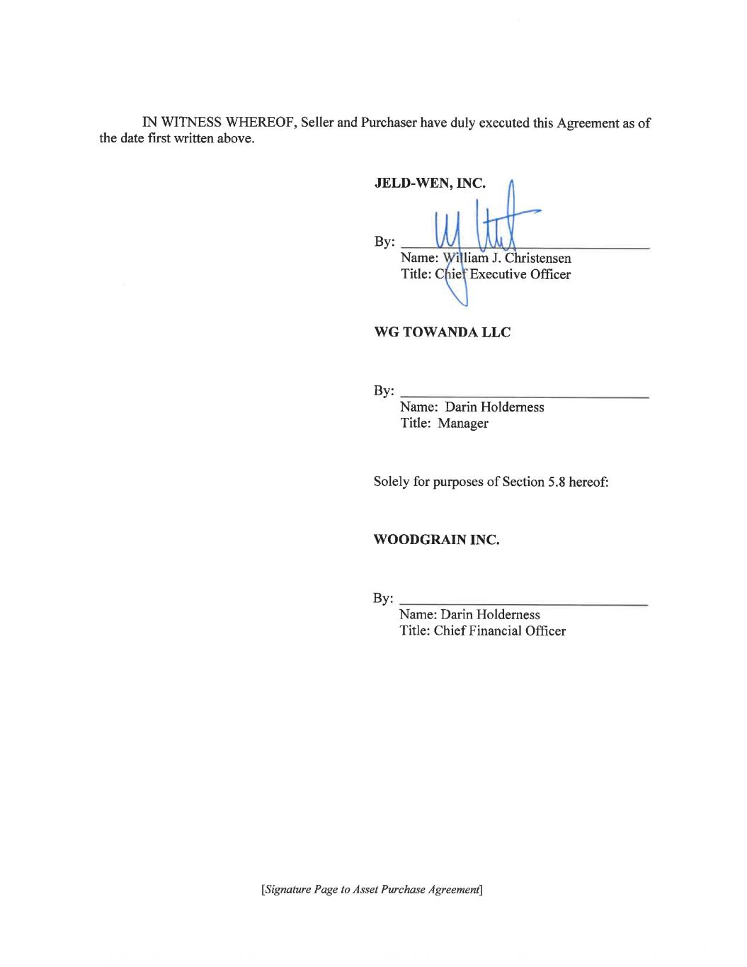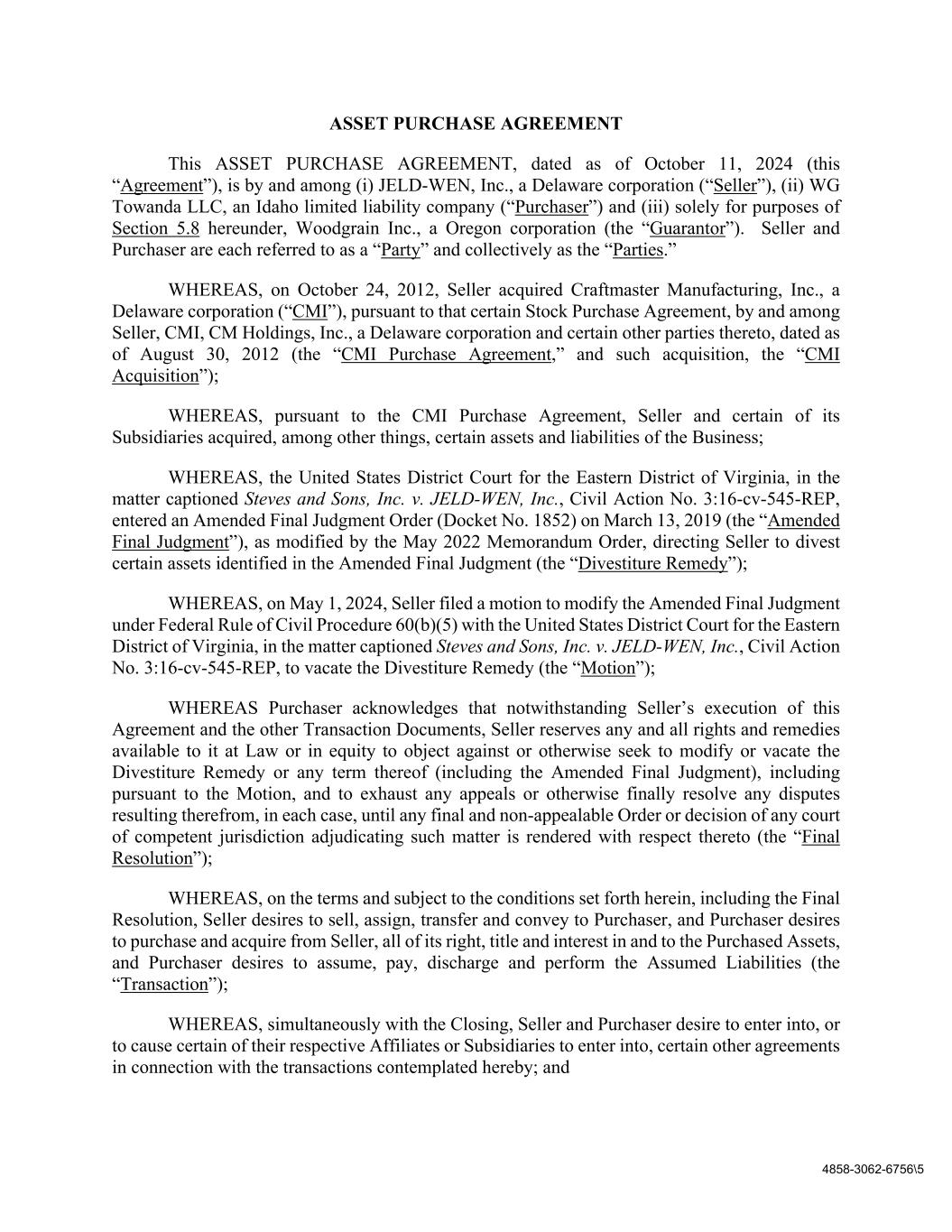4858-3062-6756\5 ASSET PURCHASE AGREEMENT This ASSET PURCHASE AGREEMENT, dated as of October 11, 2024 (this “Agreement”), is by and among (i) JELD-WEN, Inc., a Delaware corporation (“Seller”), (ii) WG Towanda LLC, an Idaho limited liability company (“Purchaser”) and (iii) solely for purposes of Section 5.8 hereunder, Woodgrain Inc., a Oregon corporation (the “Guarantor”). Seller and Purchaser are each referred to as a “Party” and collectively as the “Parties.” WHEREAS, on October 24, 2012, Seller acquired Craftmaster Manufacturing, Inc., a Delaware corporation (“CMI”), pursuant to that certain Stock Purchase Agreement, by and among Seller, CMI, CM Holdings, Inc., a Delaware corporation and certain other parties thereto, dated as of August 30, 2012 (the “CMI Purchase Agreement,” and such acquisition, the “CMI Acquisition”); WHEREAS, pursuant to the CMI Purchase Agreement, Seller and certain of its Subsidiaries acquired, among other things, certain assets and liabilities of the Business; WHEREAS, the United States District Court for the Eastern District of Virginia, in the matter captioned Steves and Sons, Inc. v. JELD-WEN, Inc., Civil Action No. 3:16-cv-545-REP, entered an Amended Final Judgment Order (Docket No. 1852) on March 13, 2019 (the “Amended Final Judgment”), as modified by the May 2022 Memorandum Order, directing Seller to divest certain assets identified in the Amended Final Judgment (the “Divestiture Remedy”); WHEREAS, on May 1, 2024, Seller filed a motion to modify the Amended Final Judgment under Federal Rule of Civil Procedure 60(b)(5) with the United States District Court for the Eastern District of Virginia, in the matter captioned Steves and Sons, Inc. v. JELD-WEN, Inc., Civil Action No. 3:16-cv-545-REP, to vacate the Divestiture Remedy (the “Motion”); WHEREAS Purchaser acknowledges that notwithstanding Seller’s execution of this Agreement and the other Transaction Documents, Seller reserves any and all rights and remedies available to it at Law or in equity to object against or otherwise seek to modify or vacate the Divestiture Remedy or any term thereof (including the Amended Final Judgment), including pursuant to the Motion, and to exhaust any appeals or otherwise finally resolve any disputes resulting therefrom, in each case, until any final and non-appealable Order or decision of any court of competent jurisdiction adjudicating such matter is rendered with respect thereto (the “Final Resolution”); WHEREAS, on the terms and subject to the conditions set forth herein, including the Final Resolution, Seller desires to sell, assign, transfer and convey to Purchaser, and Purchaser desires to purchase and acquire from Seller, all of its right, title and interest in and to the Purchased Assets, and Purchaser desires to assume, pay, discharge and perform the Assumed Liabilities (the “Transaction”); WHEREAS, simultaneously with the Closing, Seller and Purchaser desire to enter into, or to cause certain of their respective Affiliates or Subsidiaries to enter into, certain other agreements in connection with the transactions contemplated hereby; and