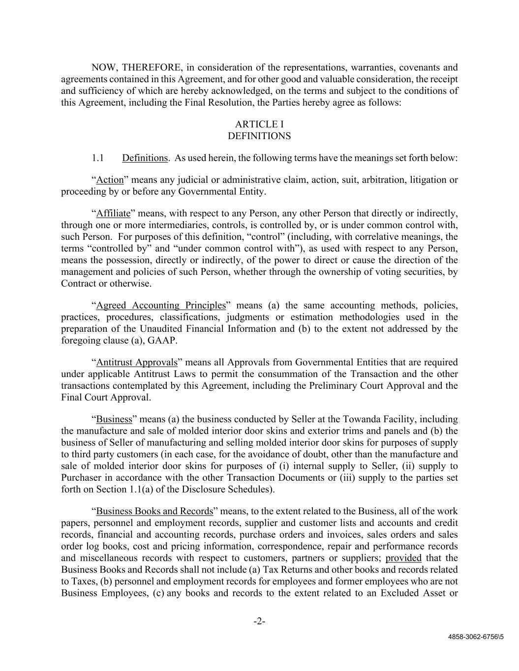 -2- 4858-3062-6756\5 NOW, THEREFORE, in consideration of the representations, warranties, covenants and agreements contained in this Agreement, and for other good and valuable consideration, the receipt and sufficiency of which are hereby acknowledged, on the terms and subject to the conditions of this Agreement, including the Final Resolution, the Parties hereby agree as follows: ARTICLE I DEFINITIONS 1.1 Definitions. As used herein, the following terms have the meanings set forth below: “Action” means any judicial or administrative claim, action, suit, arbitration, litigation or proceeding by or before any Governmental Entity. “Affiliate” means, with respect to any Person, any other Person that directly or indirectly, through one or more intermediaries, controls, is controlled by, or is under common control with, such Person. For purposes of this definition, “control” (including, with correlative meanings, the terms “controlled by” and “under common control with”), as used with respect to any Person, means the possession, directly or indirectly, of the power to direct or cause the direction of the management and policies of such Person, whether through the ownership of voting securities, by Contract or otherwise. “Agreed Accounting Principles” means (a) the same accounting methods, policies, practices, procedures, classifications, judgments or estimation methodologies used in the preparation of the Unaudited Financial Information and (b) to the extent not addressed by the foregoing clause (a), GAAP. “Antitrust Approvals” means all Approvals from Governmental Entities that are required under applicable Antitrust Laws to permit the consummation of the Transaction and the other transactions contemplated by this Agreement, including the Preliminary Court Approval and the Final Court Approval. “Business” means (a) the business conducted by Seller at the Towanda Facility, including the manufacture and sale of molded interior door skins and exterior trims and panels and (b) the business of Seller of manufacturing and selling molded interior door skins for purposes of supply to third party customers (in each case, for the avoidance of doubt, other than the manufacture and sale of molded interior door skins for purposes of (i) internal supply to Seller, (ii) supply to Purchaser in accordance with the other Transaction Documents or (iii) supply to the parties set forth on Section 1.1(a) of the Disclosure Schedules). “Business Books and Records” means, to the extent related to the Business, all of the work papers, personnel and employment records, supplier and customer lists and accounts and credit records, financial and accounting records, purchase orders and invoices, sales orders and sales order log books, cost and pricing information, correspondence, repair and performance records and miscellaneous records with respect to customers, partners or suppliers; provided that the Business Books and Records shall not include (a) Tax Returns and other books and records related to Taxes, (b) personnel and employment records for employees and former employees who are not Business Employees, (c) any books and records to the extent related to an Excluded Asset or