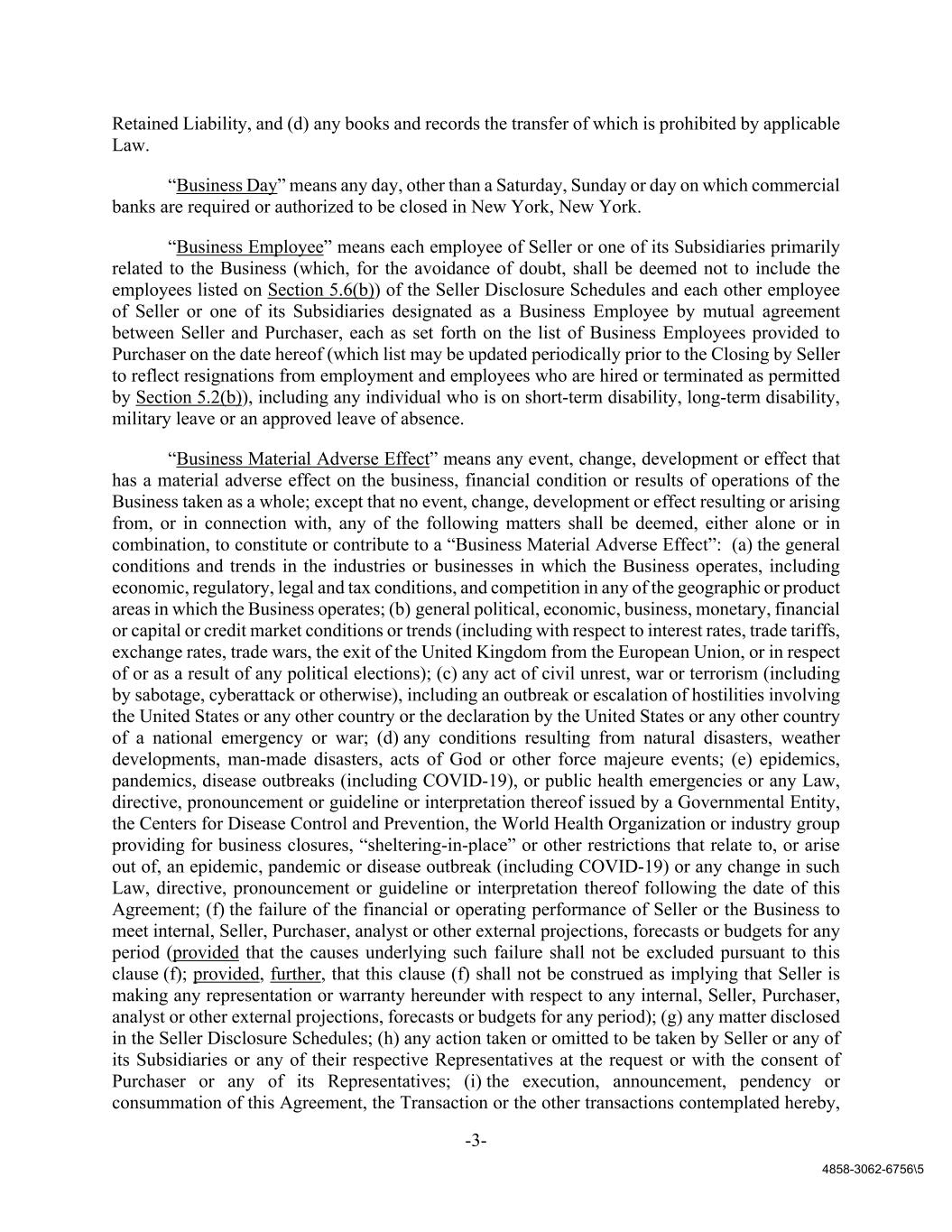 -3- 4858-3062-6756\5 Retained Liability, and (d) any books and records the transfer of which is prohibited by applicable Law. “Business Day” means any day, other than a Saturday, Sunday or day on which commercial banks are required or authorized to be closed in New York, New York. “Business Employee” means each employee of Seller or one of its Subsidiaries primarily related to the Business (which, for the avoidance of doubt, shall be deemed not to include the employees listed on Section 5.6(b)) of the Seller Disclosure Schedules and each other employee of Seller or one of its Subsidiaries designated as a Business Employee by mutual agreement between Seller and Purchaser, each as set forth on the list of Business Employees provided to Purchaser on the date hereof (which list may be updated periodically prior to the Closing by Seller to reflect resignations from employment and employees who are hired or terminated as permitted by Section 5.2(b)), including any individual who is on short-term disability, long-term disability, military leave or an approved leave of absence. “Business Material Adverse Effect” means any event, change, development or effect that has a material adverse effect on the business, financial condition or results of operations of the Business taken as a whole; except that no event, change, development or effect resulting or arising from, or in connection with, any of the following matters shall be deemed, either alone or in combination, to constitute or contribute to a “Business Material Adverse Effect”: (a) the general conditions and trends in the industries or businesses in which the Business operates, including economic, regulatory, legal and tax conditions, and competition in any of the geographic or product areas in which the Business operates; (b) general political, economic, business, monetary, financial or capital or credit market conditions or trends (including with respect to interest rates, trade tariffs, exchange rates, trade wars, the exit of the United Kingdom from the European Union, or in respect of or as a result of any political elections); (c) any act of civil unrest, war or terrorism (including by sabotage, cyberattack or otherwise), including an outbreak or escalation of hostilities involving the United States or any other country or the declaration by the United States or any other country of a national emergency or war; (d) any conditions resulting from natural disasters, weather developments, man-made disasters, acts of God or other force majeure events; (e) epidemics, pandemics, disease outbreaks (including COVID-19), or public health emergencies or any Law, directive, pronouncement or guideline or interpretation thereof issued by a Governmental Entity, the Centers for Disease Control and Prevention, the World Health Organization or industry group providing for business closures, “sheltering-in-place” or other restrictions that relate to, or arise out of, an epidemic, pandemic or disease outbreak (including COVID-19) or any change in such Law, directive, pronouncement or guideline or interpretation thereof following the date of this Agreement; (f) the failure of the financial or operating performance of Seller or the Business to meet internal, Seller, Purchaser, analyst or other external projections, forecasts or budgets for any period (provided that the causes underlying such failure shall not be excluded pursuant to this clause (f); provided, further, that this clause (f) shall not be construed as implying that Seller is making any representation or warranty hereunder with respect to any internal, Seller, Purchaser, analyst or other external projections, forecasts or budgets for any period); (g) any matter disclosed in the Seller Disclosure Schedules; (h) any action taken or omitted to be taken by Seller or any of its Subsidiaries or any of their respective Representatives at the request or with the consent of Purchaser or any of its Representatives; (i) the execution, announcement, pendency or consummation of this Agreement, the Transaction or the other transactions contemplated hereby,