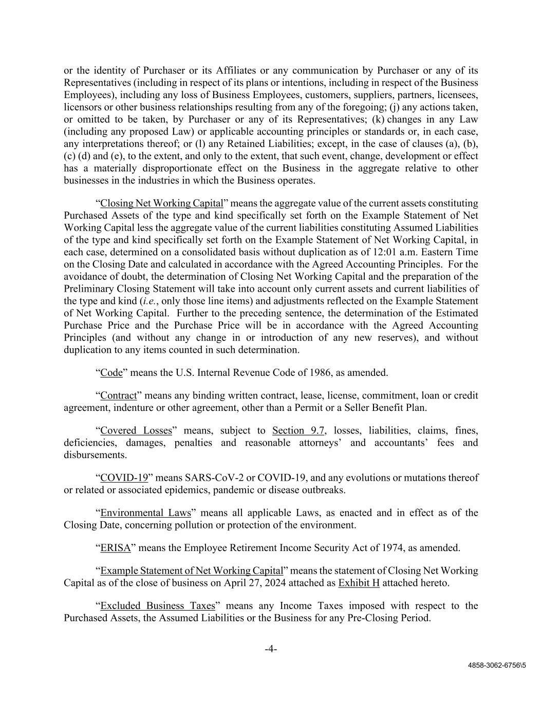 -4- 4858-3062-6756\5 or the identity of Purchaser or its Affiliates or any communication by Purchaser or any of its Representatives (including in respect of its plans or intentions, including in respect of the Business Employees), including any loss of Business Employees, customers, suppliers, partners, licensees, licensors or other business relationships resulting from any of the foregoing; (j) any actions taken, or omitted to be taken, by Purchaser or any of its Representatives; (k) changes in any Law (including any proposed Law) or applicable accounting principles or standards or, in each case, any interpretations thereof; or (l) any Retained Liabilities; except, in the case of clauses (a), (b), (c) (d) and (e), to the extent, and only to the extent, that such event, change, development or effect has a materially disproportionate effect on the Business in the aggregate relative to other businesses in the industries in which the Business operates. “Closing Net Working Capital” means the aggregate value of the current assets constituting Purchased Assets of the type and kind specifically set forth on the Example Statement of Net Working Capital less the aggregate value of the current liabilities constituting Assumed Liabilities of the type and kind specifically set forth on the Example Statement of Net Working Capital, in each case, determined on a consolidated basis without duplication as of 12:01 a.m. Eastern Time on the Closing Date and calculated in accordance with the Agreed Accounting Principles. For the avoidance of doubt, the determination of Closing Net Working Capital and the preparation of the Preliminary Closing Statement will take into account only current assets and current liabilities of the type and kind (i.e., only those line items) and adjustments reflected on the Example Statement of Net Working Capital. Further to the preceding sentence, the determination of the Estimated Purchase Price and the Purchase Price will be in accordance with the Agreed Accounting Principles (and without any change in or introduction of any new reserves), and without duplication to any items counted in such determination. “Code” means the U.S. Internal Revenue Code of 1986, as amended. “Contract” means any binding written contract, lease, license, commitment, loan or credit agreement, indenture or other agreement, other than a Permit or a Seller Benefit Plan. “Covered Losses” means, subject to Section 9.7, losses, liabilities, claims, fines, deficiencies, damages, penalties and reasonable attorneys’ and accountants’ fees and disbursements. “COVID-19” means SARS-CoV-2 or COVID-19, and any evolutions or mutations thereof or related or associated epidemics, pandemic or disease outbreaks. “Environmental Laws” means all applicable Laws, as enacted and in effect as of the Closing Date, concerning pollution or protection of the environment. “ERISA” means the Employee Retirement Income Security Act of 1974, as amended. “Example Statement of Net Working Capital” means the statement of Closing Net Working Capital as of the close of business on April 27, 2024 attached as Exhibit H attached hereto. “Excluded Business Taxes” means any Income Taxes imposed with respect to the Purchased Assets, the Assumed Liabilities or the Business for any Pre-Closing Period.
