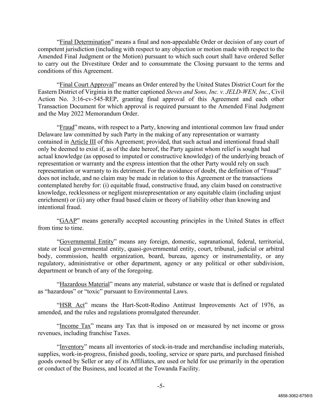 -5- 4858-3062-6756\5 “Final Determination” means a final and non-appealable Order or decision of any court of competent jurisdiction (including with respect to any objection or motion made with respect to the Amended Final Judgment or the Motion) pursuant to which such court shall have ordered Seller to carry out the Divestiture Order and to consummate the Closing pursuant to the terms and conditions of this Agreement. “Final Court Approval” means an Order entered by the United States District Court for the Eastern District of Virginia in the matter captioned Steves and Sons, Inc. v. JELD-WEN, Inc., Civil Action No. 3:16-cv-545-REP, granting final approval of this Agreement and each other Transaction Document for which approval is required pursuant to the Amended Final Judgment and the May 2022 Memorandum Order. “Fraud” means, with respect to a Party, knowing and intentional common law fraud under Delaware law committed by such Party in the making of any representation or warranty contained in Article III of this Agreement; provided, that such actual and intentional fraud shall only be deemed to exist if, as of the date hereof, the Party against whom relief is sought had actual knowledge (as opposed to imputed or constructive knowledge) of the underlying breach of representation or warranty and the express intention that the other Party would rely on such representation or warranty to its detriment. For the avoidance of doubt, the definition of “Fraud” does not include, and no claim may be made in relation to this Agreement or the transactions contemplated hereby for: (i) equitable fraud, constructive fraud, any claim based on constructive knowledge, recklessness or negligent misrepresentation or any equitable claim (including unjust enrichment) or (ii) any other fraud based claim or theory of liability other than knowing and intentional fraud. “GAAP” means generally accepted accounting principles in the United States in effect from time to time. “Governmental Entity” means any foreign, domestic, supranational, federal, territorial, state or local governmental entity, quasi-governmental entity, court, tribunal, judicial or arbitral body, commission, health organization, board, bureau, agency or instrumentality, or any regulatory, administrative or other department, agency or any political or other subdivision, department or branch of any of the foregoing. “Hazardous Material” means any material, substance or waste that is defined or regulated as “hazardous” or “toxic” pursuant to Environmental Laws. “HSR Act” means the Hart-Scott-Rodino Antitrust Improvements Act of 1976, as amended, and the rules and regulations promulgated thereunder. “Income Tax” means any Tax that is imposed on or measured by net income or gross revenues, including franchise Taxes. “Inventory” means all inventories of stock-in-trade and merchandise including materials, supplies, work-in-progress, finished goods, tooling, service or spare parts, and purchased finished goods owned by Seller or any of its Affiliates, are used or held for use primarily in the operation or conduct of the Business, and located at the Towanda Facility.