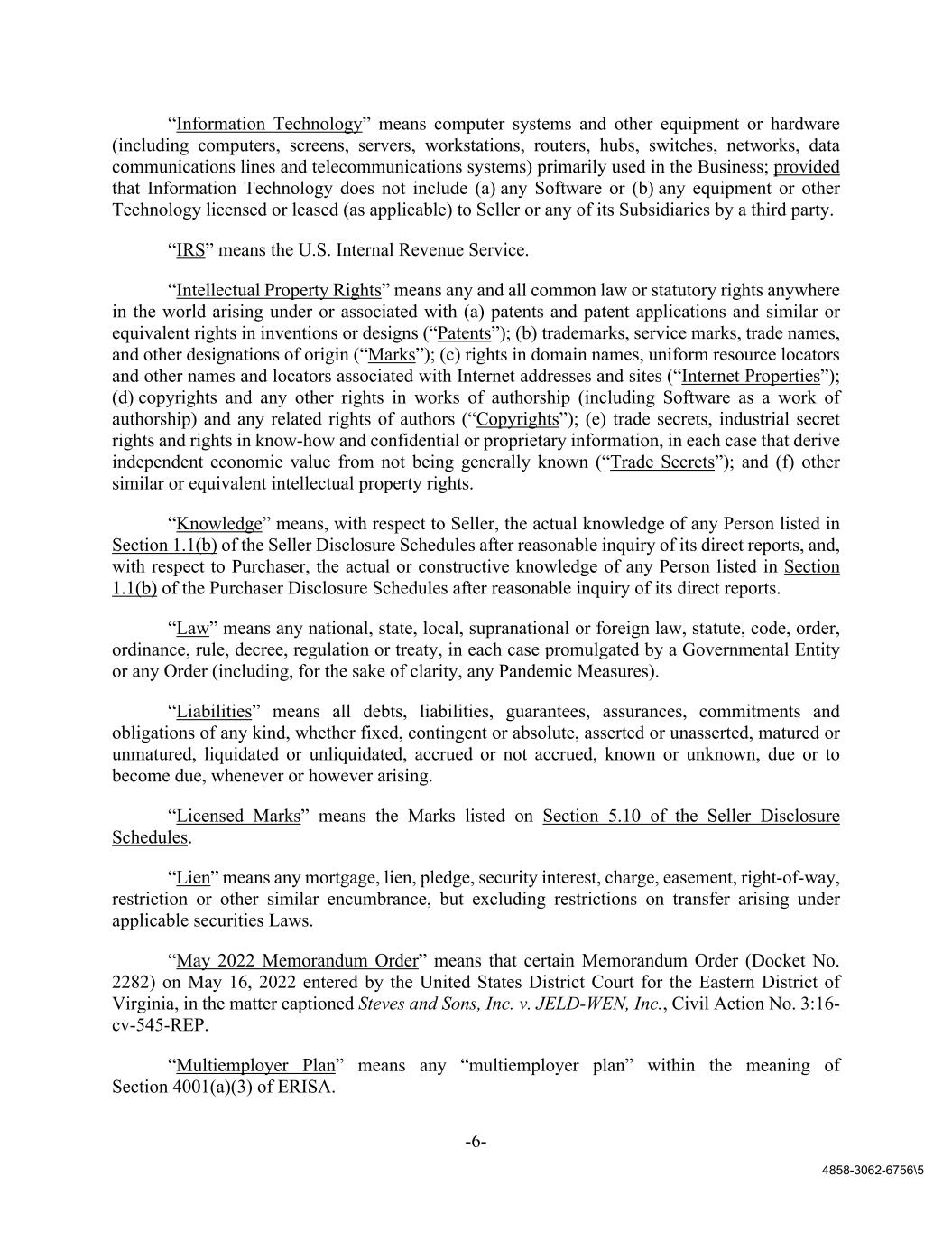 -6- 4858-3062-6756\5 “Information Technology” means computer systems and other equipment or hardware (including computers, screens, servers, workstations, routers, hubs, switches, networks, data communications lines and telecommunications systems) primarily used in the Business; provided that Information Technology does not include (a) any Software or (b) any equipment or other Technology licensed or leased (as applicable) to Seller or any of its Subsidiaries by a third party. “IRS” means the U.S. Internal Revenue Service. “Intellectual Property Rights” means any and all common law or statutory rights anywhere in the world arising under or associated with (a) patents and patent applications and similar or equivalent rights in inventions or designs (“Patents”); (b) trademarks, service marks, trade names, and other designations of origin (“Marks”); (c) rights in domain names, uniform resource locators and other names and locators associated with Internet addresses and sites (“Internet Properties”); (d) copyrights and any other rights in works of authorship (including Software as a work of authorship) and any related rights of authors (“Copyrights”); (e) trade secrets, industrial secret rights and rights in know-how and confidential or proprietary information, in each case that derive independent economic value from not being generally known (“Trade Secrets”); and (f) other similar or equivalent intellectual property rights. “Knowledge” means, with respect to Seller, the actual knowledge of any Person listed in Section 1.1(b) of the Seller Disclosure Schedules after reasonable inquiry of its direct reports, and, with respect to Purchaser, the actual or constructive knowledge of any Person listed in Section 1.1(b) of the Purchaser Disclosure Schedules after reasonable inquiry of its direct reports. “Law” means any national, state, local, supranational or foreign law, statute, code, order, ordinance, rule, decree, regulation or treaty, in each case promulgated by a Governmental Entity or any Order (including, for the sake of clarity, any Pandemic Measures). “Liabilities” means all debts, liabilities, guarantees, assurances, commitments and obligations of any kind, whether fixed, contingent or absolute, asserted or unasserted, matured or unmatured, liquidated or unliquidated, accrued or not accrued, known or unknown, due or to become due, whenever or however arising. “Licensed Marks” means the Marks listed on Section 5.10 of the Seller Disclosure Schedules. “Lien” means any mortgage, lien, pledge, security interest, charge, easement, right-of-way, restriction or other similar encumbrance, but excluding restrictions on transfer arising under applicable securities Laws. “May 2022 Memorandum Order” means that certain Memorandum Order (Docket No. 2282) on May 16, 2022 entered by the United States District Court for the Eastern District of Virginia, in the matter captioned Steves and Sons, Inc. v. JELD-WEN, Inc., Civil Action No. 3:16- cv-545-REP. “Multiemployer Plan” means any “multiemployer plan” within the meaning of Section 4001(a)(3) of ERISA.