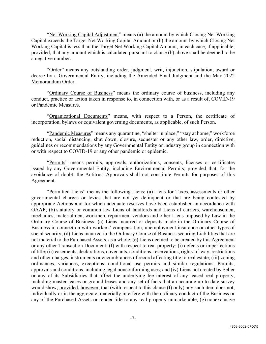 -7- 4858-3062-6756\5 “Net Working Capital Adjustment” means (a) the amount by which Closing Net Working Capital exceeds the Target Net Working Capital Amount or (b) the amount by which Closing Net Working Capital is less than the Target Net Working Capital Amount, in each case, if applicable; provided, that any amount which is calculated pursuant to clause (b) above shall be deemed to be a negative number. “Order” means any outstanding order, judgment, writ, injunction, stipulation, award or decree by a Governmental Entity, including the Amended Final Judgment and the May 2022 Memorandum Order. “Ordinary Course of Business” means the ordinary course of business, including any conduct, practice or action taken in response to, in connection with, or as a result of, COVID-19 or Pandemic Measures. “Organizational Documents” means, with respect to a Person, the certificate of incorporation, bylaws or equivalent governing documents, as applicable, of such Person. “Pandemic Measures” means any quarantine, “shelter in place,” “stay at home,” workforce reduction, social distancing, shut down, closure, sequester or any other law, order, directive, guidelines or recommendations by any Governmental Entity or industry group in connection with or with respect to COVID-19 or any other pandemic or epidemic. “Permits” means permits, approvals, authorizations, consents, licenses or certificates issued by any Governmental Entity, including Environmental Permits; provided that, for the avoidance of doubt, the Antitrust Approvals shall not constitute Permits for purposes of this Agreement. “Permitted Liens” means the following Liens: (a) Liens for Taxes, assessments or other governmental charges or levies that are not yet delinquent or that are being contested by appropriate Actions and for which adequate reserves have been established in accordance with GAAP; (b) statutory or common law Liens of landlords and Liens of carriers, warehousemen, mechanics, materialmen, workmen, repairmen, vendors and other Liens imposed by Law in the Ordinary Course of Business; (c) Liens incurred or deposits made in the Ordinary Course of Business in connection with workers’ compensation, unemployment insurance or other types of social security; (d) Liens incurred in the Ordinary Course of Business securing Liabilities that are not material to the Purchased Assets, as a whole; (e) Liens deemed to be created by this Agreement or any other Transaction Document; (f) with respect to real property: (i) defects or imperfections of title; (ii) easements, declarations, covenants, conditions, reservations, rights-of-way, restrictions and other charges, instruments or encumbrances of record affecting title to real estate; (iii) zoning ordinances, variances, exceptions, conditional use permits and similar regulations, Permits, approvals and conditions, including legal nonconforming uses; and (iv) Liens not created by Seller or any of its Subsidiaries that affect the underlying fee interest of any leased real property, including master leases or ground leases and any set of facts that an accurate up-to-date survey would show; provided, however, that (with respect to this clause (f) only) any such item does not, individually or in the aggregate, materially interfere with the ordinary conduct of the Business or any of the Purchased Assets or render title to any real property unmarketable; (g) nonexclusive