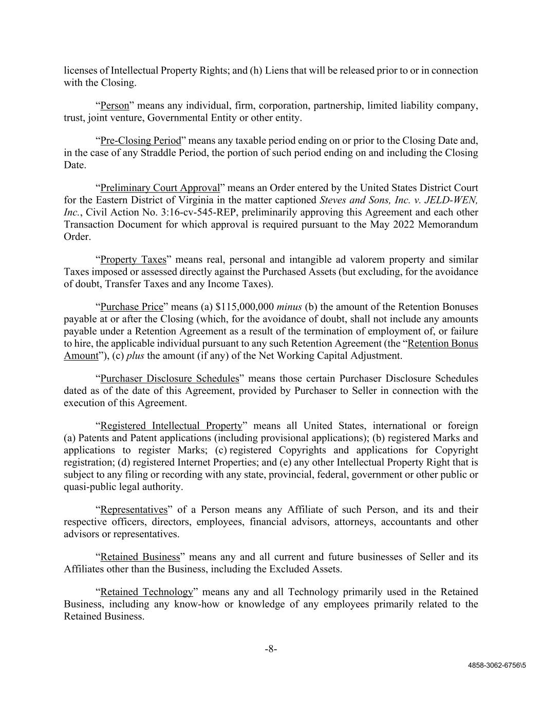 -8- 4858-3062-6756\5 licenses of Intellectual Property Rights; and (h) Liens that will be released prior to or in connection with the Closing. “Person” means any individual, firm, corporation, partnership, limited liability company, trust, joint venture, Governmental Entity or other entity. “Pre-Closing Period” means any taxable period ending on or prior to the Closing Date and, in the case of any Straddle Period, the portion of such period ending on and including the Closing Date. “Preliminary Court Approval” means an Order entered by the United States District Court for the Eastern District of Virginia in the matter captioned Steves and Sons, Inc. v. JELD-WEN, Inc., Civil Action No. 3:16-cv-545-REP, preliminarily approving this Agreement and each other Transaction Document for which approval is required pursuant to the May 2022 Memorandum Order. “Property Taxes” means real, personal and intangible ad valorem property and similar Taxes imposed or assessed directly against the Purchased Assets (but excluding, for the avoidance of doubt, Transfer Taxes and any Income Taxes). “Purchase Price” means (a) $115,000,000 minus (b) the amount of the Retention Bonuses payable at or after the Closing (which, for the avoidance of doubt, shall not include any amounts payable under a Retention Agreement as a result of the termination of employment of, or failure to hire, the applicable individual pursuant to any such Retention Agreement (the “Retention Bonus Amount”), (c) plus the amount (if any) of the Net Working Capital Adjustment. “Purchaser Disclosure Schedules” means those certain Purchaser Disclosure Schedules dated as of the date of this Agreement, provided by Purchaser to Seller in connection with the execution of this Agreement. “Registered Intellectual Property” means all United States, international or foreign (a) Patents and Patent applications (including provisional applications); (b) registered Marks and applications to register Marks; (c) registered Copyrights and applications for Copyright registration; (d) registered Internet Properties; and (e) any other Intellectual Property Right that is subject to any filing or recording with any state, provincial, federal, government or other public or quasi-public legal authority. “Representatives” of a Person means any Affiliate of such Person, and its and their respective officers, directors, employees, financial advisors, attorneys, accountants and other advisors or representatives. “Retained Business” means any and all current and future businesses of Seller and its Affiliates other than the Business, including the Excluded Assets. “Retained Technology” means any and all Technology primarily used in the Retained Business, including any know-how or knowledge of any employees primarily related to the Retained Business.