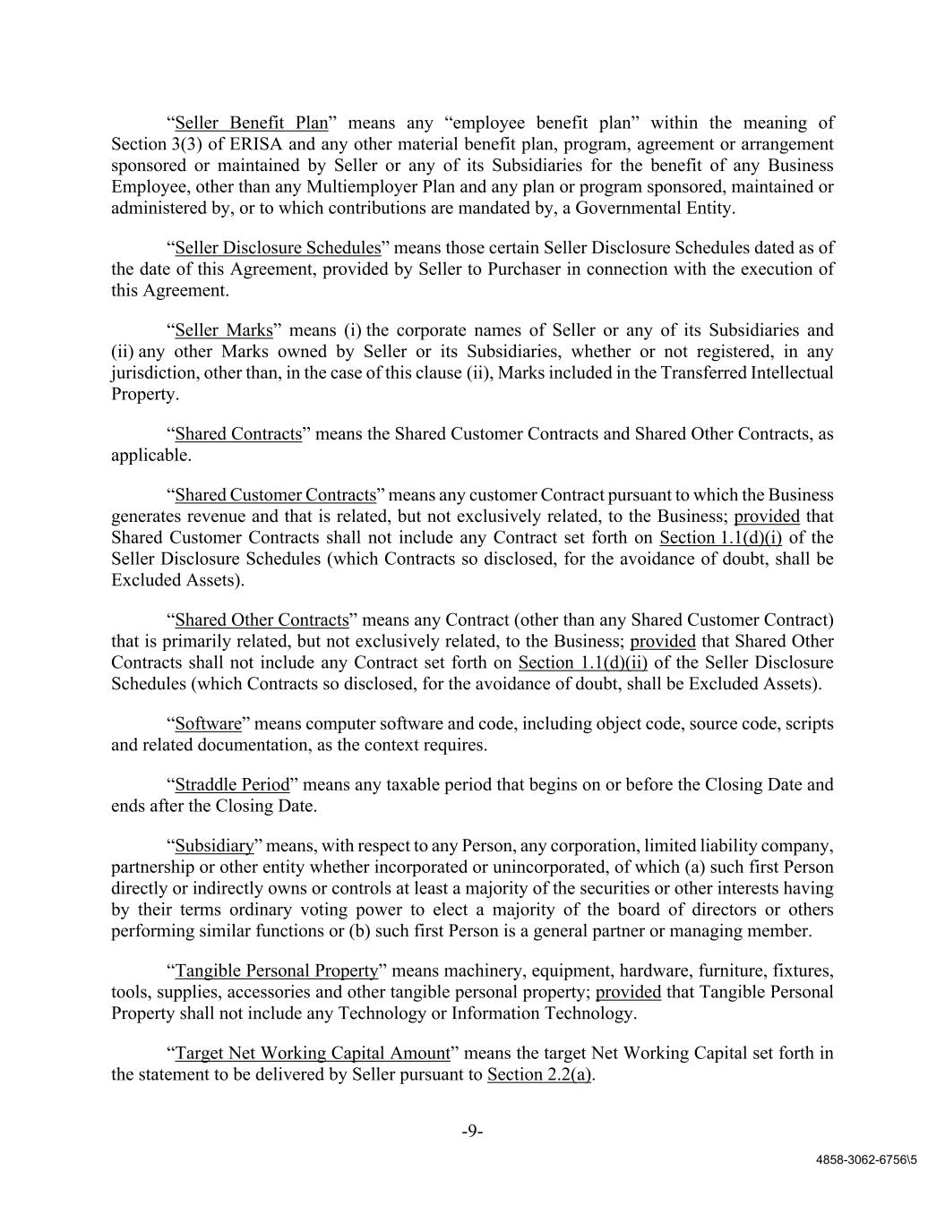 -9- 4858-3062-6756\5 “Seller Benefit Plan” means any “employee benefit plan” within the meaning of Section 3(3) of ERISA and any other material benefit plan, program, agreement or arrangement sponsored or maintained by Seller or any of its Subsidiaries for the benefit of any Business Employee, other than any Multiemployer Plan and any plan or program sponsored, maintained or administered by, or to which contributions are mandated by, a Governmental Entity. “Seller Disclosure Schedules” means those certain Seller Disclosure Schedules dated as of the date of this Agreement, provided by Seller to Purchaser in connection with the execution of this Agreement. “Seller Marks” means (i) the corporate names of Seller or any of its Subsidiaries and (ii) any other Marks owned by Seller or its Subsidiaries, whether or not registered, in any jurisdiction, other than, in the case of this clause (ii), Marks included in the Transferred Intellectual Property. “Shared Contracts” means the Shared Customer Contracts and Shared Other Contracts, as applicable. “Shared Customer Contracts” means any customer Contract pursuant to which the Business generates revenue and that is related, but not exclusively related, to the Business; provided that Shared Customer Contracts shall not include any Contract set forth on Section 1.1(d)(i) of the Seller Disclosure Schedules (which Contracts so disclosed, for the avoidance of doubt, shall be Excluded Assets). “Shared Other Contracts” means any Contract (other than any Shared Customer Contract) that is primarily related, but not exclusively related, to the Business; provided that Shared Other Contracts shall not include any Contract set forth on Section 1.1(d)(ii) of the Seller Disclosure Schedules (which Contracts so disclosed, for the avoidance of doubt, shall be Excluded Assets). “Software” means computer software and code, including object code, source code, scripts and related documentation, as the context requires. “Straddle Period” means any taxable period that begins on or before the Closing Date and ends after the Closing Date. “Subsidiary” means, with respect to any Person, any corporation, limited liability company, partnership or other entity whether incorporated or unincorporated, of which (a) such first Person directly or indirectly owns or controls at least a majority of the securities or other interests having by their terms ordinary voting power to elect a majority of the board of directors or others performing similar functions or (b) such first Person is a general partner or managing member. “Tangible Personal Property” means machinery, equipment, hardware, furniture, fixtures, tools, supplies, accessories and other tangible personal property; provided that Tangible Personal Property shall not include any Technology or Information Technology. “Target Net Working Capital Amount” means the target Net Working Capital set forth in the statement to be delivered by Seller pursuant to Section 2.2(a).