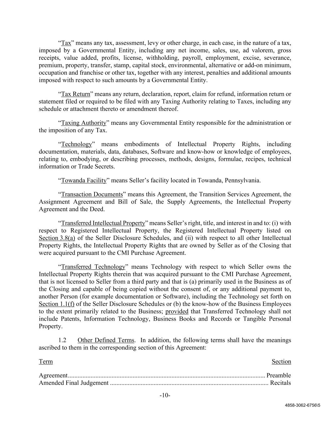 -10- 4858-3062-6756\5 “Tax” means any tax, assessment, levy or other charge, in each case, in the nature of a tax, imposed by a Governmental Entity, including any net income, sales, use, ad valorem, gross receipts, value added, profits, license, withholding, payroll, employment, excise, severance, premium, property, transfer, stamp, capital stock, environmental, alternative or add-on minimum, occupation and franchise or other tax, together with any interest, penalties and additional amounts imposed with respect to such amounts by a Governmental Entity. “Tax Return” means any return, declaration, report, claim for refund, information return or statement filed or required to be filed with any Taxing Authority relating to Taxes, including any schedule or attachment thereto or amendment thereof. “Taxing Authority” means any Governmental Entity responsible for the administration or the imposition of any Tax. “Technology” means embodiments of Intellectual Property Rights, including documentation, materials, data, databases, Software and know-how or knowledge of employees, relating to, embodying, or describing processes, methods, designs, formulae, recipes, technical information or Trade Secrets. “Towanda Facility” means Seller’s facility located in Towanda, Pennsylvania. “Transaction Documents” means this Agreement, the Transition Services Agreement, the Assignment Agreement and Bill of Sale, the Supply Agreements, the Intellectual Property Agreement and the Deed. “Transferred Intellectual Property” means Seller’s right, title, and interest in and to: (i) with respect to Registered Intellectual Property, the Registered Intellectual Property listed on Section 3.8(a) of the Seller Disclosure Schedules, and (ii) with respect to all other Intellectual Property Rights, the Intellectual Property Rights that are owned by Seller as of the Closing that were acquired pursuant to the CMI Purchase Agreement. “Transferred Technology” means Technology with respect to which Seller owns the Intellectual Property Rights therein that was acquired pursuant to the CMI Purchase Agreement, that is not licensed to Seller from a third party and that is (a) primarily used in the Business as of the Closing and capable of being copied without the consent of, or any additional payment to, another Person (for example documentation or Software), including the Technology set forth on Section 1.1(f) of the Seller Disclosure Schedules or (b) the know-how of the Business Employees to the extent primarily related to the Business; provided that Transferred Technology shall not include Patents, Information Technology, Business Books and Records or Tangible Personal Property. 1.2 Other Defined Terms. In addition, the following terms shall have the meanings ascribed to them in the corresponding section of this Agreement: Term Section Agreement .......................................................................................................................... Preamble Amended Final Judgement .................................................................................................. Recitals