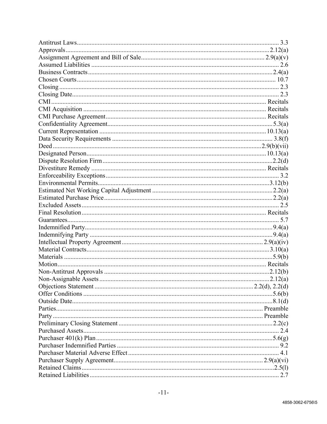 -11- 4858-3062-6756\5 Antitrust Laws .............................................................................................................................. 3.3 Approvals ............................................................................................................................... 2.12(a) Assignment Agreement and Bill of Sale ............................................................................. 2.9(a)(v) Assumed Liabilities ..................................................................................................................... 2.6 Business Contracts ................................................................................................................... 2.4(a) Chosen Courts ............................................................................................................................ 10.7 Closing ......................................................................................................................................... 2.3 Closing Date................................................................................................................................. 2.3 CMI ...................................................................................................................................... Recitals CMI Acquisition .................................................................................................................. Recitals CMI Purchase Agreement .................................................................................................... Recitals Confidentiality Agreement....................................................................................................... 5.3(a) Current Representation ........................................................................................................ 10.13(a) Data Security Requirements .................................................................................................... 3.8(f) Deed .................................................................................................................................. 2.9(b)(vii) Designated Person ................................................................................................................ 10.13(a) Dispute Resolution Firm .......................................................................................................... 2.2(d) Divestiture Remedy ............................................................................................................. Recitals Enforceability Exceptions ............................................................................................................ 3.2 Environmental Permits........................................................................................................... 3.12(b) Estimated Net Working Capital Adjustment ........................................................................... 2.2(a) Estimated Purchase Price ......................................................................................................... 2.2(a) Excluded Assets ........................................................................................................................... 2.5 Final Resolution ................................................................................................................... Recitals Guarantees .................................................................................................................................... 5.7 Indemnified Party ..................................................................................................................... 9.4(a) Indemnifying Party .................................................................................................................. 9.4(a) Intellectual Property Agreement ........................................................................................ 2.9(a)(iv) Material Contracts .................................................................................................................. 3.10(a) Materials .................................................................................................................................. 5.9(b) Motion .................................................................................................................................. Recitals Non-Antitrust Approvals ....................................................................................................... 2.12(b) Non-Assignable Assets .......................................................................................................... 2.12(a) Objections Statement ................................................................................................... 2.2(d), 2.2(d) Offer Conditions ...................................................................................................................... 5.6(b) Outside Date............................................................................................................................. 8.1(d) Parties ................................................................................................................................. Preamble Party ................................................................................................................................... Preamble Preliminary Closing Statement ................................................................................................ 2.2(c) Purchased Assets .......................................................................................................................... 2.4 Purchaser 401(k) Plan .............................................................................................................. 5.6(g) Purchaser Indemnified Parties ..................................................................................................... 9.2 Purchaser Material Adverse Effect .......................................