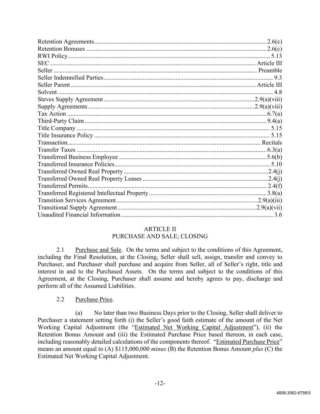 -12- 4858-3062-6756\5 Retention Agreements .............................................................................................................. 2.6(c) Retention Bonuses ................................................................................................................... 2.6(c) RWI Policy................................................................................................................................. 5.13 SEC ................................................................................................................................... Article III Seller .................................................................................................................................. Preamble Seller Indemnified Parties ............................................................................................................ 9.3 Seller Parent ...................................................................................................................... Article III Solvent ......................................................................................................................................... 4.8 Steves Supply Agreement ................................................................................................ 2.9(a)(viii) Supply Agreements .......................................................................................................... 2.9(a)(viii) Tax Action ............................................................................................................................... 6.7(a) Third-Party Claim .................................................................................................................... 9.4(a) Title Company ........................................................................................................................... 5.15 Title Insurance Policy ................................................................................................................ 5.15 Transaction ........................................................................................................................... Recitals Transfer Taxes ......................................................................................................................... 6.3(a) Transferred Business Employee .............................................................................................. 5.6(b) Transferred Insurance Policies ................................................................................................... 5.10 Transferred Owned Real Property ............................................................................................ 2.4(j) Transferred Owned Real Property Leases ................................................................................ 2.4(j) Transferred Permits .................................................................................................................. 2.4(f) Transferred Registered Intellectual Property ........................................................................... 3.8(a) Transition Services Agreement .......................................................................................... 2.9(a)(iii) Transitional Supply Agreement ........................................................................................ 2.9(a)(vii) Unaudited Financial Information ................................................................................................. 3.6 ARTICLE II PURCHASE AND SALE; CLOSING 2.1 Purchase and Sale. On the terms and subject to the conditions of this Agreement, including the Final Resolution, at the Closing, Seller shall sell, assign, transfer and convey to Purchaser, and Purchaser shall purchase and acquire from Seller, all of Seller’s right, title and interest in and to the Purchased Assets. On the terms and subject to the conditions of this Agreement, at the Closing, Purchaser shall assume and hereby agrees to pay, discharge and perform all of the Assumed Liabilities. 2.2 Purchase Price. (a) No later than two Business Days prior to the Closing, Seller shall deliver to Purchaser a statement setting forth (i) the Seller’s good faith estimate of the amount of the Net Working Capital Adjustment (the “Estimated Net Working Capital Adjustment”), (ii) the Retention Bonus Amount and (iii) the Estimated Purchase Price based thereon, in each case, including reasonably detailed calculations of the components thereof. “Estimated Purchase Price” means an amount equal to (A) $115,000,000 minus (B) the Retention Bonus Amount plus (C) the Estimated Net Working Capital Adjustment.