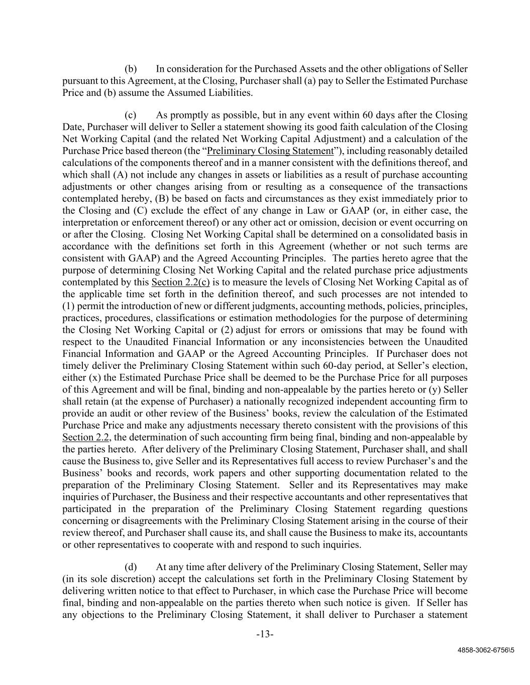 -13- 4858-3062-6756\5 (b) In consideration for the Purchased Assets and the other obligations of Seller pursuant to this Agreement, at the Closing, Purchaser shall (a) pay to Seller the Estimated Purchase Price and (b) assume the Assumed Liabilities. (c) As promptly as possible, but in any event within 60 days after the Closing Date, Purchaser will deliver to Seller a statement showing its good faith calculation of the Closing Net Working Capital (and the related Net Working Capital Adjustment) and a calculation of the Purchase Price based thereon (the “Preliminary Closing Statement”), including reasonably detailed calculations of the components thereof and in a manner consistent with the definitions thereof, and which shall (A) not include any changes in assets or liabilities as a result of purchase accounting adjustments or other changes arising from or resulting as a consequence of the transactions contemplated hereby, (B) be based on facts and circumstances as they exist immediately prior to the Closing and (C) exclude the effect of any change in Law or GAAP (or, in either case, the interpretation or enforcement thereof) or any other act or omission, decision or event occurring on or after the Closing. Closing Net Working Capital shall be determined on a consolidated basis in accordance with the definitions set forth in this Agreement (whether or not such terms are consistent with GAAP) and the Agreed Accounting Principles. The parties hereto agree that the purpose of determining Closing Net Working Capital and the related purchase price adjustments contemplated by this Section 2.2(c) is to measure the levels of Closing Net Working Capital as of the applicable time set forth in the definition thereof, and such processes are not intended to (1) permit the introduction of new or different judgments, accounting methods, policies, principles, practices, procedures, classifications or estimation methodologies for the purpose of determining the Closing Net Working Capital or (2) adjust for errors or omissions that may be found with respect to the Unaudited Financial Information or any inconsistencies between the Unaudited Financial Information and GAAP or the Agreed Accounting Principles. If Purchaser does not timely deliver the Preliminary Closing Statement within such 60-day period, at Seller’s election, either (x) the Estimated Purchase Price shall be deemed to be the Purchase Price for all purposes of this Agreement and will be final, binding and non-appealable by the parties hereto or (y) Seller shall retain (at the expense of Purchaser) a nationally recognized independent accounting firm to provide an audit or other review of the Business’ books, review the calculation of the Estimated Purchase Price and make any adjustments necessary thereto consistent with the provisions of this Section 2.2, the determination of such accounting firm being final, binding and non-appealable by the parties hereto. After delivery of the Preliminary Closing Statement, Purchaser shall, and shall cause the Business to, give Seller and its Representatives full access to review Purchaser’s and the Business’ books and records, work papers and other supporting documentation related to the preparation of the Preliminary Closing Statement. Seller and its Representatives may make inquiries of Purchaser, the Business and their respective accountants and other representatives that participated in the preparation of the Preliminary Closing Statement regarding questions concerning or disagreements with the Preliminary Closing Statement arising in the course of their review thereof, and Purchaser shall cause its, and shall cause the Business to make its, accountants or other representatives to cooperate with and respond to such inquiries. (d) At any time after delivery of the Preliminary Closing Statement, Seller may (in its sole discretion) accept the calculations set forth in the Preliminary Closing Statement by delivering written notice to that effect to Purchaser, in which case the Purchase Price will become final, binding and non-appealable on the parties thereto when such notice is given. If Seller has any objections to the Preliminary Closing Statement, it shall deliver to Purchaser a statement