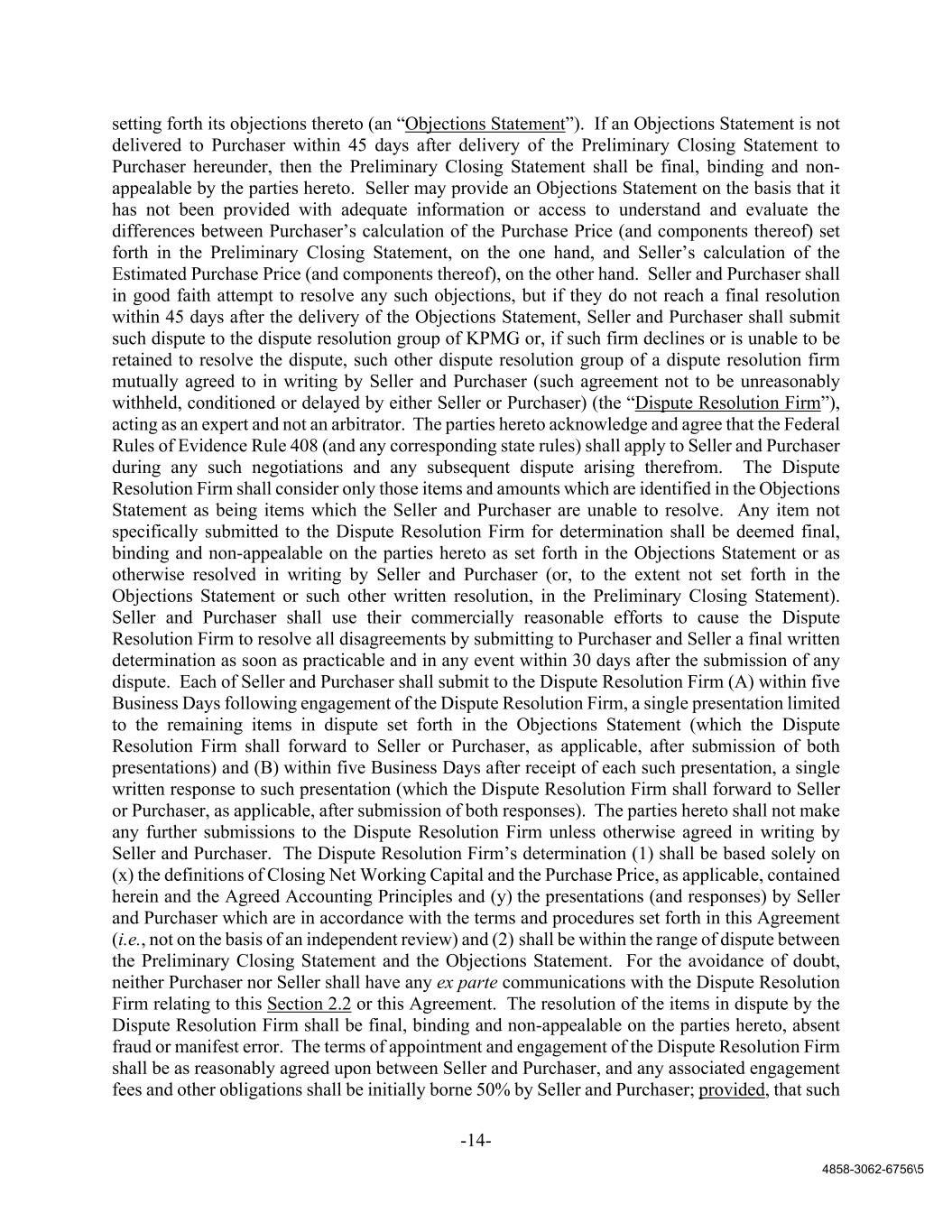 -14- 4858-3062-6756\5 setting forth its objections thereto (an “Objections Statement”). If an Objections Statement is not delivered to Purchaser within 45 days after delivery of the Preliminary Closing Statement to Purchaser hereunder, then the Preliminary Closing Statement shall be final, binding and non- appealable by the parties hereto. Seller may provide an Objections Statement on the basis that it has not been provided with adequate information or access to understand and evaluate the differences between Purchaser’s calculation of the Purchase Price (and components thereof) set forth in the Preliminary Closing Statement, on the one hand, and Seller’s calculation of the Estimated Purchase Price (and components thereof), on the other hand. Seller and Purchaser shall in good faith attempt to resolve any such objections, but if they do not reach a final resolution within 45 days after the delivery of the Objections Statement, Seller and Purchaser shall submit such dispute to the dispute resolution group of KPMG or, if such firm declines or is unable to be retained to resolve the dispute, such other dispute resolution group of a dispute resolution firm mutually agreed to in writing by Seller and Purchaser (such agreement not to be unreasonably withheld, conditioned or delayed by either Seller or Purchaser) (the “Dispute Resolution Firm”), acting as an expert and not an arbitrator. The parties hereto acknowledge and agree that the Federal Rules of Evidence Rule 408 (and any corresponding state rules) shall apply to Seller and Purchaser during any such negotiations and any subsequent dispute arising therefrom. The Dispute Resolution Firm shall consider only those items and amounts which are identified in the Objections Statement as being items which the Seller and Purchaser are unable to resolve. Any item not specifically submitted to the Dispute Resolution Firm for determination shall be deemed final, binding and non-appealable on the parties hereto as set forth in the Objections Statement or as otherwise resolved in writing by Seller and Purchaser (or, to the extent not set forth in the Objections Statement or such other written resolution, in the Preliminary Closing Statement). Seller and Purchaser shall use their commercially reasonable efforts to cause the Dispute Resolution Firm to resolve all disagreements by submitting to Purchaser and Seller a final written determination as soon as practicable and in any event within 30 days after the submission of any dispute. Each of Seller and Purchaser shall submit to the Dispute Resolution Firm (A) within five Business Days following engagement of the Dispute Resolution Firm, a single presentation limited to the remaining items in dispute set forth in the Objections Statement (which the Dispute Resolution Firm shall forward to Seller or Purchaser, as applicable, after submission of both presentations) and (B) within five Business Days after receipt of each such presentation, a single written response to such presentation (which the Dispute Resolution Firm shall forward to Seller or Purchaser, as applicable, after submission of both responses). The parties hereto shall not make any further submissions to the Dispute Resolution Firm unless otherwise agreed in writing by Seller and Purchaser. The Dispute Resolution Firm’s determination (1) shall be based solely on (x) the definitions of Closing Net Working Capital and the Purchase Price, as applicable, contained herein and the Agreed Accounting Principles and (y) the presentations (and responses) by Seller and Purchaser which are in accordance with the terms and procedures set forth in this Agreement (i.e., not on the basis of an independent review) and (2) shall be within the range of dispute between the Preliminary Closing Statement and the Objections Statement. For the avoidance of doubt, neither Purchaser nor Seller shall have any ex parte communications with the Dispute Resolution Firm relating to this Section 2.2 or this Agreement. The resolution of the items in dispute by the Dispute Resolution Firm shall be final, binding and non-appealable on the parties hereto, absent fraud or manifest error. The terms of appointment and engagement of the Dispute Resolution Firm shall be as reasonably agreed upon between Seller and Purchaser, and any associated engagement fees and other obligations shall be initially borne 50% by Seller and Purchaser; provided, that such
