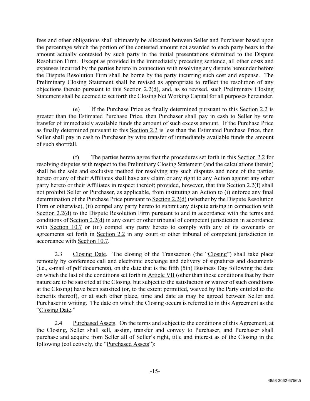 -15- 4858-3062-6756\5 fees and other obligations shall ultimately be allocated between Seller and Purchaser based upon the percentage which the portion of the contested amount not awarded to each party bears to the amount actually contested by such party in the initial presentations submitted to the Dispute Resolution Firm. Except as provided in the immediately preceding sentence, all other costs and expenses incurred by the parties hereto in connection with resolving any dispute hereunder before the Dispute Resolution Firm shall be borne by the party incurring such cost and expense. The Preliminary Closing Statement shall be revised as appropriate to reflect the resolution of any objections thereto pursuant to this Section 2.2(d), and, as so revised, such Preliminary Closing Statement shall be deemed to set forth the Closing Net Working Capital for all purposes hereunder. (e) If the Purchase Price as finally determined pursuant to this Section 2.2 is greater than the Estimated Purchase Price, then Purchaser shall pay in cash to Seller by wire transfer of immediately available funds the amount of such excess amount. If the Purchase Price as finally determined pursuant to this Section 2.2 is less than the Estimated Purchase Price, then Seller shall pay in cash to Purchaser by wire transfer of immediately available funds the amount of such shortfall. (f) The parties hereto agree that the procedures set forth in this Section 2.2 for resolving disputes with respect to the Preliminary Closing Statement (and the calculations therein) shall be the sole and exclusive method for resolving any such disputes and none of the parties hereto or any of their Affiliates shall have any claim or any right to any Action against any other party hereto or their Affiliates in respect thereof; provided, however, that this Section 2.2(f) shall not prohibit Seller or Purchaser, as applicable, from instituting an Action to (i) enforce any final determination of the Purchase Price pursuant to Section 2.2(d) (whether by the Dispute Resolution Firm or otherwise), (ii) compel any party hereto to submit any dispute arising in connection with Section 2.2(d) to the Dispute Resolution Firm pursuant to and in accordance with the terms and conditions of Section 2.2(d) in any court or other tribunal of competent jurisdiction in accordance with Section 10.7 or (iii) compel any party hereto to comply with any of its covenants or agreements set forth in Section 2.2 in any court or other tribunal of competent jurisdiction in accordance with Section 10.7. 2.3 Closing Date. The closing of the Transaction (the “Closing”) shall take place remotely by conference call and electronic exchange and delivery of signatures and documents (i.e., e-mail of pdf documents), on the date that is the fifth (5th) Business Day following the date on which the last of the conditions set forth in Article VII (other than those conditions that by their nature are to be satisfied at the Closing, but subject to the satisfaction or waiver of such conditions at the Closing) have been satisfied (or, to the extent permitted, waived by the Party entitled to the benefits thereof), or at such other place, time and date as may be agreed between Seller and Purchaser in writing. The date on which the Closing occurs is referred to in this Agreement as the “Closing Date.” 2.4 Purchased Assets. On the terms and subject to the conditions of this Agreement, at the Closing, Seller shall sell, assign, transfer and convey to Purchaser, and Purchaser shall purchase and acquire from Seller all of Seller’s right, title and interest as of the Closing in the following (collectively, the “Purchased Assets”):