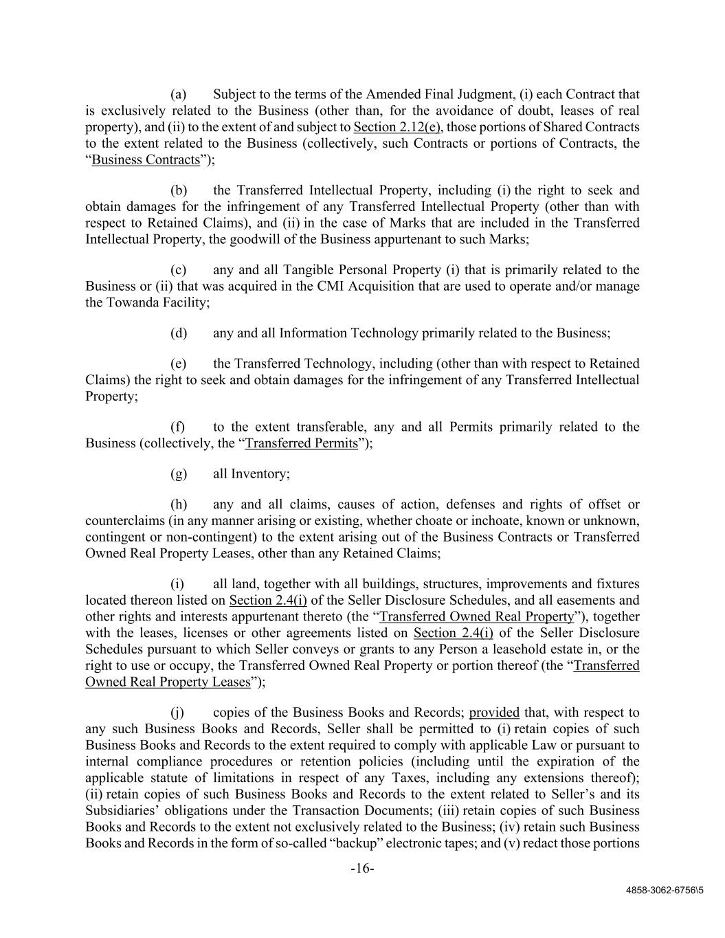 -16- 4858-3062-6756\5 (a) Subject to the terms of the Amended Final Judgment, (i) each Contract that is exclusively related to the Business (other than, for the avoidance of doubt, leases of real property), and (ii) to the extent of and subject to Section 2.12(e), those portions of Shared Contracts to the extent related to the Business (collectively, such Contracts or portions of Contracts, the “Business Contracts”); (b) the Transferred Intellectual Property, including (i) the right to seek and obtain damages for the infringement of any Transferred Intellectual Property (other than with respect to Retained Claims), and (ii) in the case of Marks that are included in the Transferred Intellectual Property, the goodwill of the Business appurtenant to such Marks; (c) any and all Tangible Personal Property (i) that is primarily related to the Business or (ii) that was acquired in the CMI Acquisition that are used to operate and/or manage the Towanda Facility; (d) any and all Information Technology primarily related to the Business; (e) the Transferred Technology, including (other than with respect to Retained Claims) the right to seek and obtain damages for the infringement of any Transferred Intellectual Property; (f) to the extent transferable, any and all Permits primarily related to the Business (collectively, the “Transferred Permits”); (g) all Inventory; (h) any and all claims, causes of action, defenses and rights of offset or counterclaims (in any manner arising or existing, whether choate or inchoate, known or unknown, contingent or non-contingent) to the extent arising out of the Business Contracts or Transferred Owned Real Property Leases, other than any Retained Claims; (i) all land, together with all buildings, structures, improvements and fixtures located thereon listed on Section 2.4(i) of the Seller Disclosure Schedules, and all easements and other rights and interests appurtenant thereto (the “Transferred Owned Real Property”), together with the leases, licenses or other agreements listed on Section 2.4(i) of the Seller Disclosure Schedules pursuant to which Seller conveys or grants to any Person a leasehold estate in, or the right to use or occupy, the Transferred Owned Real Property or portion thereof (the “Transferred Owned Real Property Leases”); (j) copies of the Business Books and Records; provided that, with respect to any such Business Books and Records, Seller shall be permitted to (i) retain copies of such Business Books and Records to the extent required to comply with applicable Law or pursuant to internal compliance procedures or retention policies (including until the expiration of the applicable statute of limitations in respect of any Taxes, including any extensions thereof); (ii) retain copies of such Business Books and Records to the extent related to Seller’s and its Subsidiaries’ obligations under the Transaction Documents; (iii) retain copies of such Business Books and Records to the extent not exclusively related to the Business; (iv) retain such Business Books and Records in the form of so-called “backup” electronic tapes; and (v) redact those portions