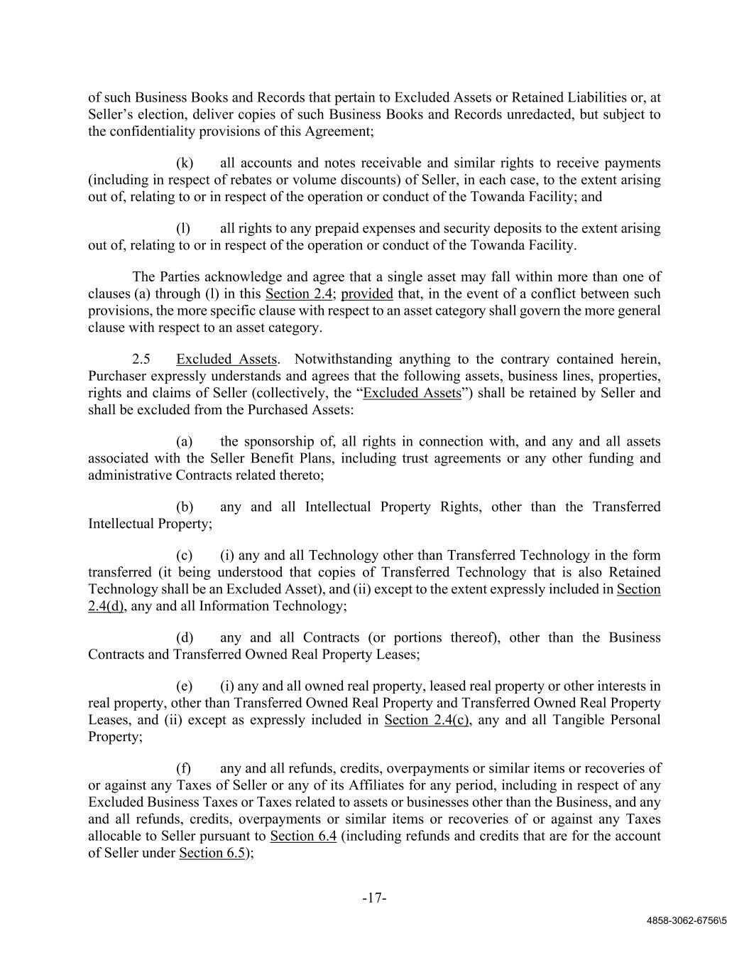 -17- 4858-3062-6756\5 of such Business Books and Records that pertain to Excluded Assets or Retained Liabilities or, at Seller’s election, deliver copies of such Business Books and Records unredacted, but subject to the confidentiality provisions of this Agreement; (k) all accounts and notes receivable and similar rights to receive payments (including in respect of rebates or volume discounts) of Seller, in each case, to the extent arising out of, relating to or in respect of the operation or conduct of the Towanda Facility; and (l) all rights to any prepaid expenses and security deposits to the extent arising out of, relating to or in respect of the operation or conduct of the Towanda Facility. The Parties acknowledge and agree that a single asset may fall within more than one of clauses (a) through (l) in this Section 2.4; provided that, in the event of a conflict between such provisions, the more specific clause with respect to an asset category shall govern the more general clause with respect to an asset category. 2.5 Excluded Assets. Notwithstanding anything to the contrary contained herein, Purchaser expressly understands and agrees that the following assets, business lines, properties, rights and claims of Seller (collectively, the “Excluded Assets”) shall be retained by Seller and shall be excluded from the Purchased Assets: (a) the sponsorship of, all rights in connection with, and any and all assets associated with the Seller Benefit Plans, including trust agreements or any other funding and administrative Contracts related thereto; (b) any and all Intellectual Property Rights, other than the Transferred Intellectual Property; (c) (i) any and all Technology other than Transferred Technology in the form transferred (it being understood that copies of Transferred Technology that is also Retained Technology shall be an Excluded Asset), and (ii) except to the extent expressly included in Section 2.4(d), any and all Information Technology; (d) any and all Contracts (or portions thereof), other than the Business Contracts and Transferred Owned Real Property Leases; (e) (i) any and all owned real property, leased real property or other interests in real property, other than Transferred Owned Real Property and Transferred Owned Real Property Leases, and (ii) except as expressly included in Section 2.4(c), any and all Tangible Personal Property; (f) any and all refunds, credits, overpayments or similar items or recoveries of or against any Taxes of Seller or any of its Affiliates for any period, including in respect of any Excluded Business Taxes or Taxes related to assets or businesses other than the Business, and any and all refunds, credits, overpayments or similar items or recoveries of or against any Taxes allocable to Seller pursuant to Section 6.4 (including refunds and credits that are for the account of Seller under Section 6.5);