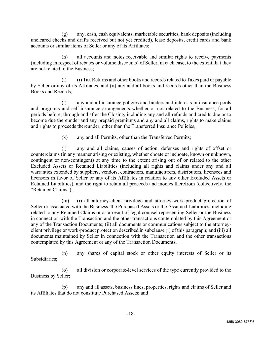 -18- 4858-3062-6756\5 (g) any, cash, cash equivalents, marketable securities, bank deposits (including uncleared checks and drafts received but not yet credited), lease deposits, credit cards and bank accounts or similar items of Seller or any of its Affiliates; (h) all accounts and notes receivable and similar rights to receive payments (including in respect of rebates or volume discounts) of Seller, in each case, to the extent that they are not related to the Business; (i) (i) Tax Returns and other books and records related to Taxes paid or payable by Seller or any of its Affiliates, and (ii) any and all books and records other than the Business Books and Records; (j) any and all insurance policies and binders and interests in insurance pools and programs and self-insurance arrangements whether or not related to the Business, for all periods before, through and after the Closing, including any and all refunds and credits due or to become due thereunder and any prepaid premiums and any and all claims, rights to make claims and rights to proceeds thereunder, other than the Transferred Insurance Policies; (k) any and all Permits, other than the Transferred Permits; (l) any and all claims, causes of action, defenses and rights of offset or counterclaims (in any manner arising or existing, whether choate or inchoate, known or unknown, contingent or non-contingent) at any time to the extent arising out of or related to the other Excluded Assets or Retained Liabilities (including all rights and claims under any and all warranties extended by suppliers, vendors, contractors, manufacturers, distributors, licensees and licensors in favor of Seller or any of its Affiliates in relation to any other Excluded Assets or Retained Liabilities), and the right to retain all proceeds and monies therefrom (collectively, the “Retained Claims”); (m) (i) all attorney-client privilege and attorney-work-product protection of Seller or associated with the Business, the Purchased Assets or the Assumed Liabilities, including related to any Retained Claims or as a result of legal counsel representing Seller or the Business in connection with the Transaction and the other transactions contemplated by this Agreement or any of the Transaction Documents; (ii) all documents or communications subject to the attorney- client privilege or work-product protection described in subclause (i) of this paragraph; and (iii) all documents maintained by Seller in connection with the Transaction and the other transactions contemplated by this Agreement or any of the Transaction Documents; (n) any shares of capital stock or other equity interests of Seller or its Subsidiaries; (o) all division or corporate-level services of the type currently provided to the Business by Seller; (p) any and all assets, business lines, properties, rights and claims of Seller and its Affiliates that do not constitute Purchased Assets; and