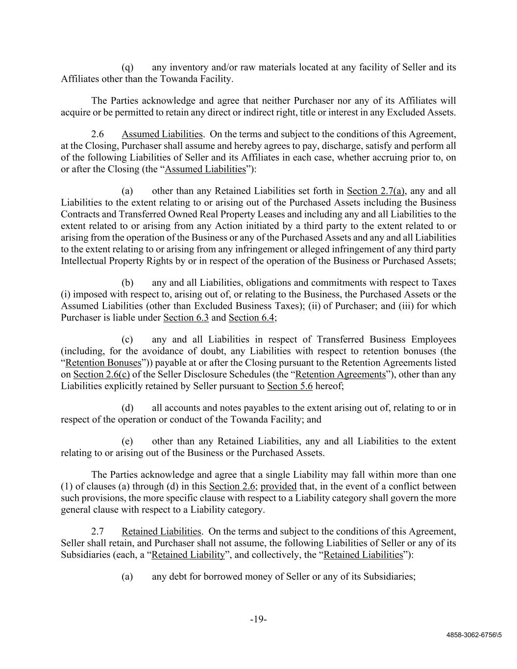 -19- 4858-3062-6756\5 (q) any inventory and/or raw materials located at any facility of Seller and its Affiliates other than the Towanda Facility. The Parties acknowledge and agree that neither Purchaser nor any of its Affiliates will acquire or be permitted to retain any direct or indirect right, title or interest in any Excluded Assets. 2.6 Assumed Liabilities. On the terms and subject to the conditions of this Agreement, at the Closing, Purchaser shall assume and hereby agrees to pay, discharge, satisfy and perform all of the following Liabilities of Seller and its Affiliates in each case, whether accruing prior to, on or after the Closing (the “Assumed Liabilities”): (a) other than any Retained Liabilities set forth in Section 2.7(a), any and all Liabilities to the extent relating to or arising out of the Purchased Assets including the Business Contracts and Transferred Owned Real Property Leases and including any and all Liabilities to the extent related to or arising from any Action initiated by a third party to the extent related to or arising from the operation of the Business or any of the Purchased Assets and any and all Liabilities to the extent relating to or arising from any infringement or alleged infringement of any third party Intellectual Property Rights by or in respect of the operation of the Business or Purchased Assets; (b) any and all Liabilities, obligations and commitments with respect to Taxes (i) imposed with respect to, arising out of, or relating to the Business, the Purchased Assets or the Assumed Liabilities (other than Excluded Business Taxes); (ii) of Purchaser; and (iii) for which Purchaser is liable under Section 6.3 and Section 6.4; (c) any and all Liabilities in respect of Transferred Business Employees (including, for the avoidance of doubt, any Liabilities with respect to retention bonuses (the “Retention Bonuses”)) payable at or after the Closing pursuant to the Retention Agreements listed on Section 2.6(c) of the Seller Disclosure Schedules (the “Retention Agreements”), other than any Liabilities explicitly retained by Seller pursuant to Section 5.6 hereof; (d) all accounts and notes payables to the extent arising out of, relating to or in respect of the operation or conduct of the Towanda Facility; and (e) other than any Retained Liabilities, any and all Liabilities to the extent relating to or arising out of the Business or the Purchased Assets. The Parties acknowledge and agree that a single Liability may fall within more than one (1) of clauses (a) through (d) in this Section 2.6; provided that, in the event of a conflict between such provisions, the more specific clause with respect to a Liability category shall govern the more general clause with respect to a Liability category. 2.7 Retained Liabilities. On the terms and subject to the conditions of this Agreement, Seller shall retain, and Purchaser shall not assume, the following Liabilities of Seller or any of its Subsidiaries (each, a “Retained Liability”, and collectively, the “Retained Liabilities”): (a) any debt for borrowed money of Seller or any of its Subsidiaries;