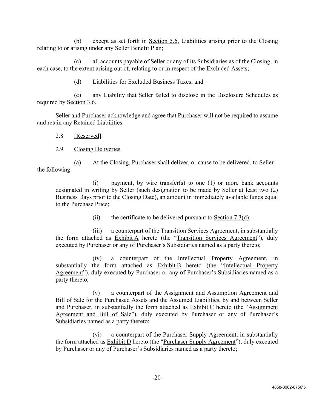 -20- 4858-3062-6756\5 (b) except as set forth in Section 5.6, Liabilities arising prior to the Closing relating to or arising under any Seller Benefit Plan; (c) all accounts payable of Seller or any of its Subsidiaries as of the Closing, in each case, to the extent arising out of, relating to or in respect of the Excluded Assets; (d) Liabilities for Excluded Business Taxes; and (e) any Liability that Seller failed to disclose in the Disclosure Schedules as required by Section 3.6. Seller and Purchaser acknowledge and agree that Purchaser will not be required to assume and retain any Retained Liabilities. 2.8 [Reserved]. 2.9 Closing Deliveries. (a) At the Closing, Purchaser shall deliver, or cause to be delivered, to Seller the following: (i) payment, by wire transfer(s) to one (1) or more bank accounts designated in writing by Seller (such designation to be made by Seller at least two (2) Business Days prior to the Closing Date), an amount in immediately available funds equal to the Purchase Price; (ii) the certificate to be delivered pursuant to Section 7.3(d); (iii) a counterpart of the Transition Services Agreement, in substantially the form attached as Exhibit A hereto (the “Transition Services Agreement”), duly executed by Purchaser or any of Purchaser’s Subsidiaries named as a party thereto; (iv) a counterpart of the Intellectual Property Agreement, in substantially the form attached as Exhibit B hereto (the “Intellectual Property Agreement”), duly executed by Purchaser or any of Purchaser’s Subsidiaries named as a party thereto; (v) a counterpart of the Assignment and Assumption Agreement and Bill of Sale for the Purchased Assets and the Assumed Liabilities, by and between Seller and Purchaser, in substantially the form attached as Exhibit C hereto (the “Assignment Agreement and Bill of Sale”), duly executed by Purchaser or any of Purchaser’s Subsidiaries named as a party thereto; (vi) a counterpart of the Purchaser Supply Agreement, in substantially the form attached as Exhibit D hereto (the “Purchaser Supply Agreement”), duly executed by Purchaser or any of Purchaser’s Subsidiaries named as a party thereto;