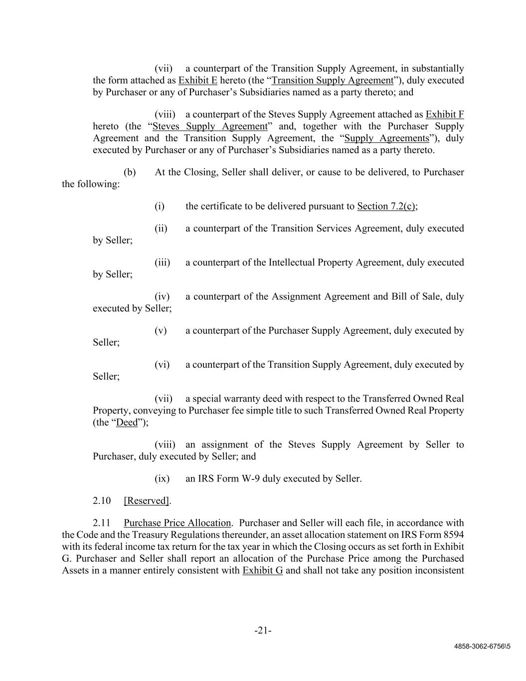 -21- 4858-3062-6756\5 (vii) a counterpart of the Transition Supply Agreement, in substantially the form attached as Exhibit E hereto (the “Transition Supply Agreement”), duly executed by Purchaser or any of Purchaser’s Subsidiaries named as a party thereto; and (viii) a counterpart of the Steves Supply Agreement attached as Exhibit F hereto (the “Steves Supply Agreement” and, together with the Purchaser Supply Agreement and the Transition Supply Agreement, the “Supply Agreements”), duly executed by Purchaser or any of Purchaser’s Subsidiaries named as a party thereto. (b) At the Closing, Seller shall deliver, or cause to be delivered, to Purchaser the following: (i) the certificate to be delivered pursuant to Section 7.2(c); (ii) a counterpart of the Transition Services Agreement, duly executed by Seller; (iii) a counterpart of the Intellectual Property Agreement, duly executed by Seller; (iv) a counterpart of the Assignment Agreement and Bill of Sale, duly executed by Seller; (v) a counterpart of the Purchaser Supply Agreement, duly executed by Seller; (vi) a counterpart of the Transition Supply Agreement, duly executed by Seller; (vii) a special warranty deed with respect to the Transferred Owned Real Property, conveying to Purchaser fee simple title to such Transferred Owned Real Property (the “Deed”); (viii) an assignment of the Steves Supply Agreement by Seller to Purchaser, duly executed by Seller; and (ix) an IRS Form W-9 duly executed by Seller. 2.10 [Reserved]. 2.11 Purchase Price Allocation. Purchaser and Seller will each file, in accordance with the Code and the Treasury Regulations thereunder, an asset allocation statement on IRS Form 8594 with its federal income tax return for the tax year in which the Closing occurs as set forth in Exhibit G. Purchaser and Seller shall report an allocation of the Purchase Price among the Purchased Assets in a manner entirely consistent with Exhibit G and shall not take any position inconsistent