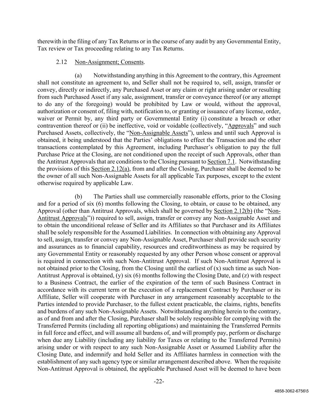 -22- 4858-3062-6756\5 therewith in the filing of any Tax Returns or in the course of any audit by any Governmental Entity, Tax review or Tax proceeding relating to any Tax Returns. 2.12 Non-Assignment; Consents. (a) Notwithstanding anything in this Agreement to the contrary, this Agreement shall not constitute an agreement to, and Seller shall not be required to, sell, assign, transfer or convey, directly or indirectly, any Purchased Asset or any claim or right arising under or resulting from such Purchased Asset if any sale, assignment, transfer or conveyance thereof (or any attempt to do any of the foregoing) would be prohibited by Law or would, without the approval, authorization or consent of, filing with, notification to, or granting or issuance of any license, order, waiver or Permit by, any third party or Governmental Entity (i) constitute a breach or other contravention thereof or (ii) be ineffective, void or voidable (collectively, “Approvals” and such Purchased Assets, collectively, the “Non-Assignable Assets”), unless and until such Approval is obtained, it being understood that the Parties’ obligations to effect the Transaction and the other transactions contemplated by this Agreement, including Purchaser’s obligation to pay the full Purchase Price at the Closing, are not conditioned upon the receipt of such Approvals, other than the Antitrust Approvals that are conditions to the Closing pursuant to Section 7.1. Notwithstanding the provisions of this Section 2.12(a), from and after the Closing, Purchaser shall be deemed to be the owner of all such Non-Assignable Assets for all applicable Tax purposes, except to the extent otherwise required by applicable Law. (b) The Parties shall use commercially reasonable efforts, prior to the Closing and for a period of six (6) months following the Closing, to obtain, or cause to be obtained, any Approval (other than Antitrust Approvals, which shall be governed by Section 2.12(b) (the “Non- Antitrust Approvals”)) required to sell, assign, transfer or convey any Non-Assignable Asset and to obtain the unconditional release of Seller and its Affiliates so that Purchaser and its Affiliates shall be solely responsible for the Assumed Liabilities. In connection with obtaining any Approval to sell, assign, transfer or convey any Non-Assignable Asset, Purchaser shall provide such security and assurances as to financial capability, resources and creditworthiness as may be required by any Governmental Entity or reasonably requested by any other Person whose consent or approval is required in connection with such Non-Antitrust Approval. If such Non-Antitrust Approval is not obtained prior to the Closing, from the Closing until the earliest of (x) such time as such Non- Antitrust Approval is obtained, (y) six (6) months following the Closing Date, and (z) with respect to a Business Contract, the earlier of the expiration of the term of such Business Contract in accordance with its current term or the execution of a replacement Contract by Purchaser or its Affiliate, Seller will cooperate with Purchaser in any arrangement reasonably acceptable to the Parties intended to provide Purchaser, to the fullest extent practicable, the claims, rights, benefits and burdens of any such Non-Assignable Assets. Notwithstanding anything herein to the contrary, as of and from and after the Closing, Purchaser shall be solely responsible for complying with the Transferred Permits (including all reporting obligations) and maintaining the Transferred Permits in full force and effect, and will assume all burdens of, and will promptly pay, perform or discharge when due any Liability (including any liability for Taxes or relating to the Transferred Permits) arising under or with respect to any such Non-Assignable Asset or Assumed Liability after the Closing Date, and indemnify and hold Seller and its Affiliates harmless in connection with the establishment of any such agency type or similar arrangement described above. When the requisite Non-Antitrust Approval is obtained, the applicable Purchased Asset will be deemed to have been
