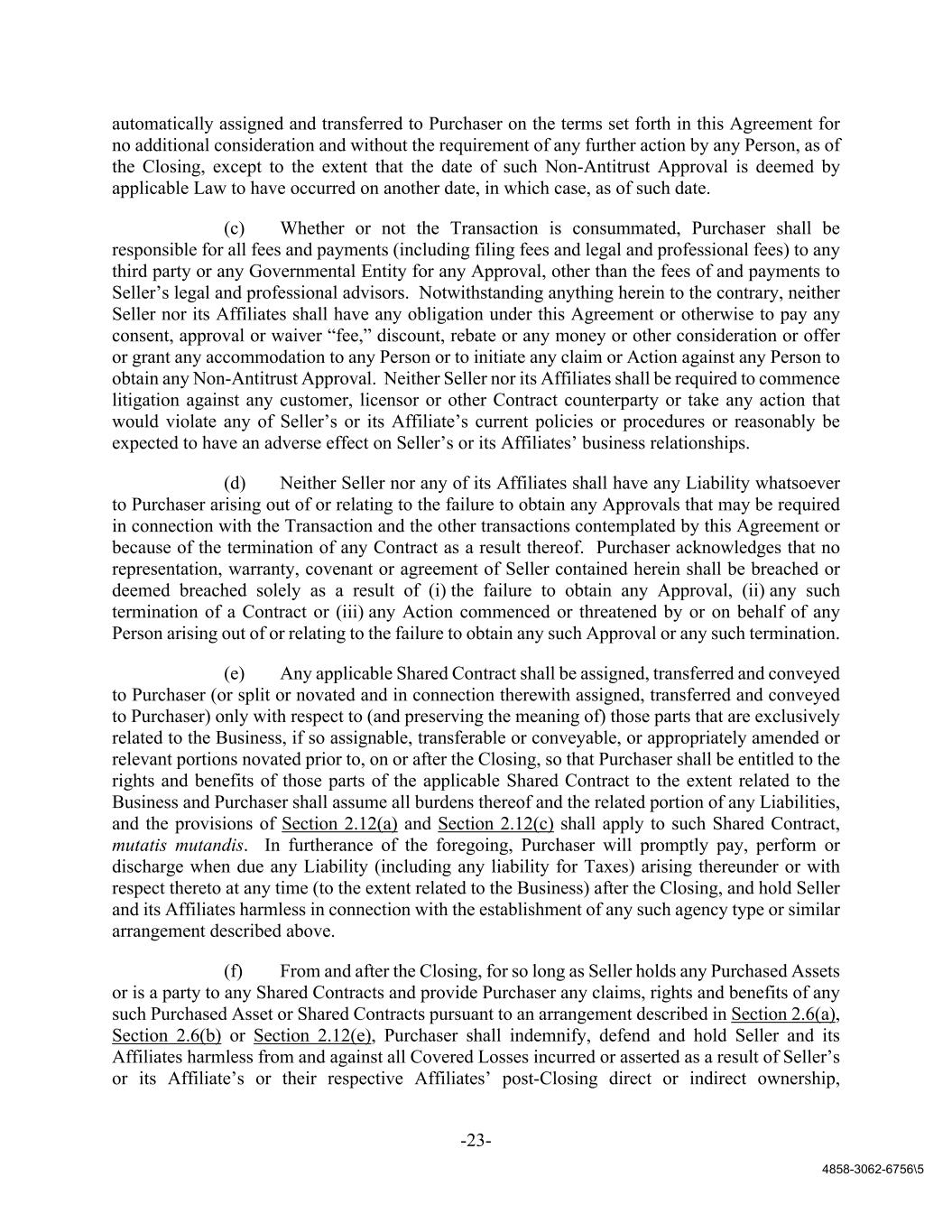 -23- 4858-3062-6756\5 automatically assigned and transferred to Purchaser on the terms set forth in this Agreement for no additional consideration and without the requirement of any further action by any Person, as of the Closing, except to the extent that the date of such Non-Antitrust Approval is deemed by applicable Law to have occurred on another date, in which case, as of such date. (c) Whether or not the Transaction is consummated, Purchaser shall be responsible for all fees and payments (including filing fees and legal and professional fees) to any third party or any Governmental Entity for any Approval, other than the fees of and payments to Seller’s legal and professional advisors. Notwithstanding anything herein to the contrary, neither Seller nor its Affiliates shall have any obligation under this Agreement or otherwise to pay any consent, approval or waiver “fee,” discount, rebate or any money or other consideration or offer or grant any accommodation to any Person or to initiate any claim or Action against any Person to obtain any Non-Antitrust Approval. Neither Seller nor its Affiliates shall be required to commence litigation against any customer, licensor or other Contract counterparty or take any action that would violate any of Seller’s or its Affiliate’s current policies or procedures or reasonably be expected to have an adverse effect on Seller’s or its Affiliates’ business relationships. (d) Neither Seller nor any of its Affiliates shall have any Liability whatsoever to Purchaser arising out of or relating to the failure to obtain any Approvals that may be required in connection with the Transaction and the other transactions contemplated by this Agreement or because of the termination of any Contract as a result thereof. Purchaser acknowledges that no representation, warranty, covenant or agreement of Seller contained herein shall be breached or deemed breached solely as a result of (i) the failure to obtain any Approval, (ii) any such termination of a Contract or (iii) any Action commenced or threatened by or on behalf of any Person arising out of or relating to the failure to obtain any such Approval or any such termination. (e) Any applicable Shared Contract shall be assigned, transferred and conveyed to Purchaser (or split or novated and in connection therewith assigned, transferred and conveyed to Purchaser) only with respect to (and preserving the meaning of) those parts that are exclusively related to the Business, if so assignable, transferable or conveyable, or appropriately amended or relevant portions novated prior to, on or after the Closing, so that Purchaser shall be entitled to the rights and benefits of those parts of the applicable Shared Contract to the extent related to the Business and Purchaser shall assume all burdens thereof and the related portion of any Liabilities, and the provisions of Section 2.12(a) and Section 2.12(c) shall apply to such Shared Contract, mutatis mutandis. In furtherance of the foregoing, Purchaser will promptly pay, perform or discharge when due any Liability (including any liability for Taxes) arising thereunder or with respect thereto at any time (to the extent related to the Business) after the Closing, and hold Seller and its Affiliates harmless in connection with the establishment of any such agency type or similar arrangement described above. (f) From and after the Closing, for so long as Seller holds any Purchased Assets or is a party to any Shared Contracts and provide Purchaser any claims, rights and benefits of any such Purchased Asset or Shared Contracts pursuant to an arrangement described in Section 2.6(a), Section 2.6(b) or Section 2.12(e), Purchaser shall indemnify, defend and hold Seller and its Affiliates harmless from and against all Covered Losses incurred or asserted as a result of Seller’s or its Affiliate’s or their respective Affiliates’ post-Closing direct or indirect ownership,