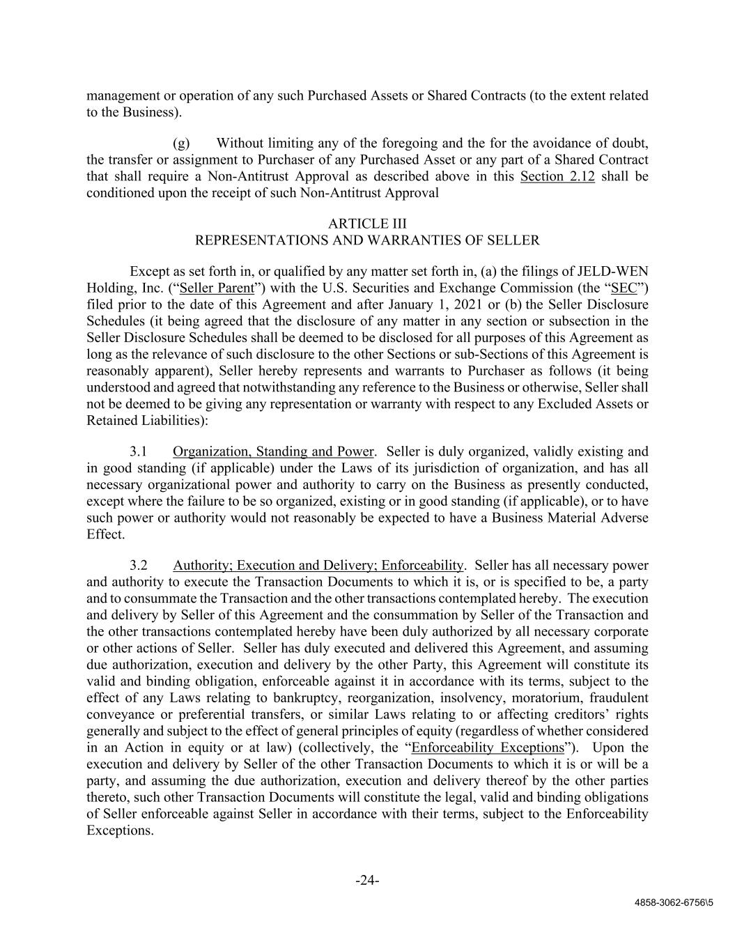 -24- 4858-3062-6756\5 management or operation of any such Purchased Assets or Shared Contracts (to the extent related to the Business). (g) Without limiting any of the foregoing and the for the avoidance of doubt, the transfer or assignment to Purchaser of any Purchased Asset or any part of a Shared Contract that shall require a Non-Antitrust Approval as described above in this Section 2.12 shall be conditioned upon the receipt of such Non-Antitrust Approval ARTICLE III REPRESENTATIONS AND WARRANTIES OF SELLER Except as set forth in, or qualified by any matter set forth in, (a) the filings of JELD-WEN Holding, Inc. (“Seller Parent”) with the U.S. Securities and Exchange Commission (the “SEC”) filed prior to the date of this Agreement and after January 1, 2021 or (b) the Seller Disclosure Schedules (it being agreed that the disclosure of any matter in any section or subsection in the Seller Disclosure Schedules shall be deemed to be disclosed for all purposes of this Agreement as long as the relevance of such disclosure to the other Sections or sub-Sections of this Agreement is reasonably apparent), Seller hereby represents and warrants to Purchaser as follows (it being understood and agreed that notwithstanding any reference to the Business or otherwise, Seller shall not be deemed to be giving any representation or warranty with respect to any Excluded Assets or Retained Liabilities): 3.1 Organization, Standing and Power. Seller is duly organized, validly existing and in good standing (if applicable) under the Laws of its jurisdiction of organization, and has all necessary organizational power and authority to carry on the Business as presently conducted, except where the failure to be so organized, existing or in good standing (if applicable), or to have such power or authority would not reasonably be expected to have a Business Material Adverse Effect. 3.2 Authority; Execution and Delivery; Enforceability. Seller has all necessary power and authority to execute the Transaction Documents to which it is, or is specified to be, a party and to consummate the Transaction and the other transactions contemplated hereby. The execution and delivery by Seller of this Agreement and the consummation by Seller of the Transaction and the other transactions contemplated hereby have been duly authorized by all necessary corporate or other actions of Seller. Seller has duly executed and delivered this Agreement, and assuming due authorization, execution and delivery by the other Party, this Agreement will constitute its valid and binding obligation, enforceable against it in accordance with its terms, subject to the effect of any Laws relating to bankruptcy, reorganization, insolvency, moratorium, fraudulent conveyance or preferential transfers, or similar Laws relating to or affecting creditors’ rights generally and subject to the effect of general principles of equity (regardless of whether considered in an Action in equity or at law) (collectively, the “Enforceability Exceptions”). Upon the execution and delivery by Seller of the other Transaction Documents to which it is or will be a party, and assuming the due authorization, execution and delivery thereof by the other parties thereto, such other Transaction Documents will constitute the legal, valid and binding obligations of Seller enforceable against Seller in accordance with their terms, subject to the Enforceability Exceptions.