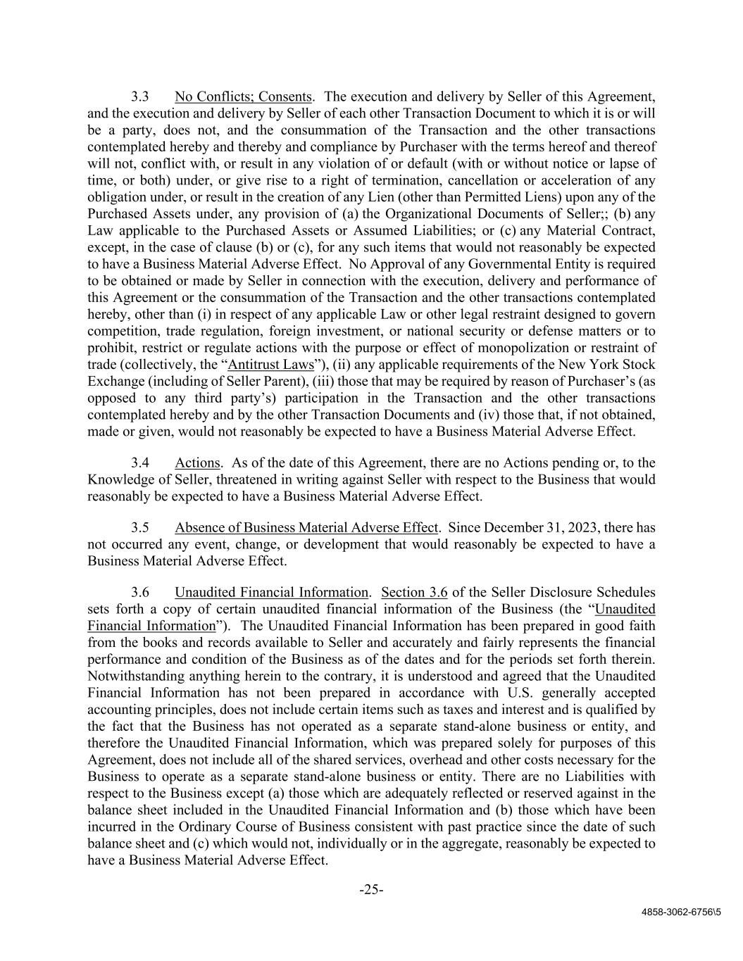 -25- 4858-3062-6756\5 3.3 No Conflicts; Consents. The execution and delivery by Seller of this Agreement, and the execution and delivery by Seller of each other Transaction Document to which it is or will be a party, does not, and the consummation of the Transaction and the other transactions contemplated hereby and thereby and compliance by Purchaser with the terms hereof and thereof will not, conflict with, or result in any violation of or default (with or without notice or lapse of time, or both) under, or give rise to a right of termination, cancellation or acceleration of any obligation under, or result in the creation of any Lien (other than Permitted Liens) upon any of the Purchased Assets under, any provision of (a) the Organizational Documents of Seller;; (b) any Law applicable to the Purchased Assets or Assumed Liabilities; or (c) any Material Contract, except, in the case of clause (b) or (c), for any such items that would not reasonably be expected to have a Business Material Adverse Effect. No Approval of any Governmental Entity is required to be obtained or made by Seller in connection with the execution, delivery and performance of this Agreement or the consummation of the Transaction and the other transactions contemplated hereby, other than (i) in respect of any applicable Law or other legal restraint designed to govern competition, trade regulation, foreign investment, or national security or defense matters or to prohibit, restrict or regulate actions with the purpose or effect of monopolization or restraint of trade (collectively, the “Antitrust Laws”), (ii) any applicable requirements of the New York Stock Exchange (including of Seller Parent), (iii) those that may be required by reason of Purchaser’s (as opposed to any third party’s) participation in the Transaction and the other transactions contemplated hereby and by the other Transaction Documents and (iv) those that, if not obtained, made or given, would not reasonably be expected to have a Business Material Adverse Effect. 3.4 Actions. As of the date of this Agreement, there are no Actions pending or, to the Knowledge of Seller, threatened in writing against Seller with respect to the Business that would reasonably be expected to have a Business Material Adverse Effect. 3.5 Absence of Business Material Adverse Effect. Since December 31, 2023, there has not occurred any event, change, or development that would reasonably be expected to have a Business Material Adverse Effect. 3.6 Unaudited Financial Information. Section 3.6 of the Seller Disclosure Schedules sets forth a copy of certain unaudited financial information of the Business (the “Unaudited Financial Information”). The Unaudited Financial Information has been prepared in good faith from the books and records available to Seller and accurately and fairly represents the financial performance and condition of the Business as of the dates and for the periods set forth therein. Notwithstanding anything herein to the contrary, it is understood and agreed that the Unaudited Financial Information has not been prepared in accordance with U.S. generally accepted accounting principles, does not include certain items such as taxes and interest and is qualified by the fact that the Business has not operated as a separate stand-alone business or entity, and therefore the Unaudited Financial Information, which was prepared solely for purposes of this Agreement, does not include all of the shared services, overhead and other costs necessary for the Business to operate as a separate stand-alone business or entity. There are no Liabilities with respect to the Business except (a) those which are adequately reflected or reserved against in the balance sheet included in the Unaudited Financial Information and (b) those which have been incurred in the Ordinary Course of Business consistent with past practice since the date of such balance sheet and (c) which would not, individually or in the aggregate, reasonably be expected to have a Business Material Adverse Effect.