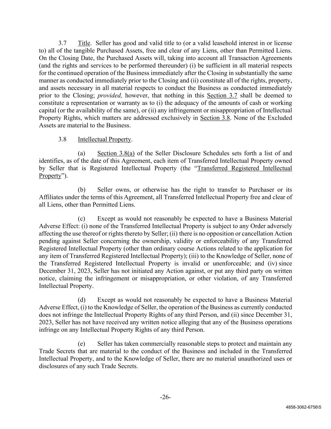 -26- 4858-3062-6756\5 3.7 Title. Seller has good and valid title to (or a valid leasehold interest in or license to) all of the tangible Purchased Assets, free and clear of any Liens, other than Permitted Liens. On the Closing Date, the Purchased Assets will, taking into account all Transaction Agreements (and the rights and services to be performed thereunder) (i) be sufficient in all material respects for the continued operation of the Business immediately after the Closing in substantially the same manner as conducted immediately prior to the Closing and (ii) constitute all of the rights, property, and assets necessary in all material respects to conduct the Business as conducted immediately prior to the Closing; provided, however, that nothing in this Section 3.7 shall be deemed to constitute a representation or warranty as to (i) the adequacy of the amounts of cash or working capital (or the availability of the same), or (ii) any infringement or misappropriation of Intellectual Property Rights, which matters are addressed exclusively in Section 3.8. None of the Excluded Assets are material to the Business. 3.8 Intellectual Property. (a) Section 3.8(a) of the Seller Disclosure Schedules sets forth a list of and identifies, as of the date of this Agreement, each item of Transferred Intellectual Property owned by Seller that is Registered Intellectual Property (the “Transferred Registered Intellectual Property”). (b) Seller owns, or otherwise has the right to transfer to Purchaser or its Affiliates under the terms of this Agreement, all Transferred Intellectual Property free and clear of all Liens, other than Permitted Liens. (c) Except as would not reasonably be expected to have a Business Material Adverse Effect: (i) none of the Transferred Intellectual Property is subject to any Order adversely affecting the use thereof or rights thereto by Seller; (ii) there is no opposition or cancellation Action pending against Seller concerning the ownership, validity or enforceability of any Transferred Registered Intellectual Property (other than ordinary course Actions related to the application for any item of Transferred Registered Intellectual Property); (iii) to the Knowledge of Seller, none of the Transferred Registered Intellectual Property is invalid or unenforceable; and (iv) since December 31, 2023, Seller has not initiated any Action against, or put any third party on written notice, claiming the infringement or misappropriation, or other violation, of any Transferred Intellectual Property. (d) Except as would not reasonably be expected to have a Business Material Adverse Effect, (i) to the Knowledge of Seller, the operation of the Business as currently conducted does not infringe the Intellectual Property Rights of any third Person, and (ii) since December 31, 2023, Seller has not have received any written notice alleging that any of the Business operations infringe on any Intellectual Property Rights of any third Person. (e) Seller has taken commercially reasonable steps to protect and maintain any Trade Secrets that are material to the conduct of the Business and included in the Transferred Intellectual Property, and to the Knowledge of Seller, there are no material unauthorized uses or disclosures of any such Trade Secrets.