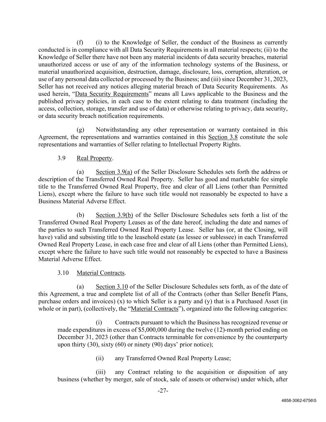 -27- 4858-3062-6756\5 (f) (i) to the Knowledge of Seller, the conduct of the Business as currently conducted is in compliance with all Data Security Requirements in all material respects; (ii) to the Knowledge of Seller there have not been any material incidents of data security breaches, material unauthorized access or use of any of the information technology systems of the Business, or material unauthorized acquisition, destruction, damage, disclosure, loss, corruption, alteration, or use of any personal data collected or processed by the Business; and (iii) since December 31, 2023, Seller has not received any notices alleging material breach of Data Security Requirements. As used herein, “Data Security Requirements” means all Laws applicable to the Business and the published privacy policies, in each case to the extent relating to data treatment (including the access, collection, storage, transfer and use of data) or otherwise relating to privacy, data security, or data security breach notification requirements. (g) Notwithstanding any other representation or warranty contained in this Agreement, the representations and warranties contained in this Section 3.8 constitute the sole representations and warranties of Seller relating to Intellectual Property Rights. 3.9 Real Property. (a) Section 3.9(a) of the Seller Disclosure Schedules sets forth the address or description of the Transferred Owned Real Property. Seller has good and marketable fee simple title to the Transferred Owned Real Property, free and clear of all Liens (other than Permitted Liens), except where the failure to have such title would not reasonably be expected to have a Business Material Adverse Effect. (b) Section 3.9(b) of the Seller Disclosure Schedules sets forth a list of the Transferred Owned Real Property Leases as of the date hereof, including the date and names of the parties to such Transferred Owned Real Property Lease. Seller has (or, at the Closing, will have) valid and subsisting title to the leasehold estate (as lessee or sublessee) in each Transferred Owned Real Property Lease, in each case free and clear of all Liens (other than Permitted Liens), except where the failure to have such title would not reasonably be expected to have a Business Material Adverse Effect. 3.10 Material Contracts. (a) Section 3.10 of the Seller Disclosure Schedules sets forth, as of the date of this Agreement, a true and complete list of all of the Contracts (other than Seller Benefit Plans, purchase orders and invoices) (x) to which Seller is a party and (y) that is a Purchased Asset (in whole or in part), (collectively, the “Material Contracts”), organized into the following categories: (i) Contracts pursuant to which the Business has recognized revenue or made expenditures in excess of $5,000,000 during the twelve (12)-month period ending on December 31, 2023 (other than Contracts terminable for convenience by the counterparty upon thirty (30), sixty (60) or ninety (90) days’ prior notice); (ii) any Transferred Owned Real Property Lease; (iii) any Contract relating to the acquisition or disposition of any business (whether by merger, sale of stock, sale of assets or otherwise) under which, after