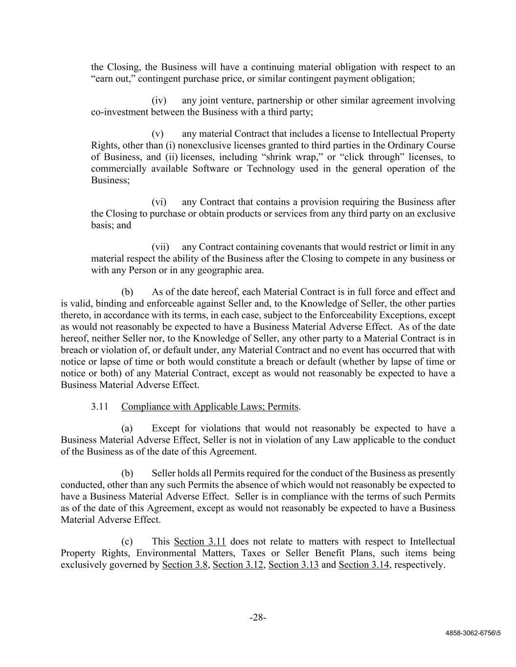 -28- 4858-3062-6756\5 the Closing, the Business will have a continuing material obligation with respect to an “earn out,” contingent purchase price, or similar contingent payment obligation; (iv) any joint venture, partnership or other similar agreement involving co-investment between the Business with a third party; (v) any material Contract that includes a license to Intellectual Property Rights, other than (i) nonexclusive licenses granted to third parties in the Ordinary Course of Business, and (ii) licenses, including “shrink wrap,” or “click through” licenses, to commercially available Software or Technology used in the general operation of the Business; (vi) any Contract that contains a provision requiring the Business after the Closing to purchase or obtain products or services from any third party on an exclusive basis; and (vii) any Contract containing covenants that would restrict or limit in any material respect the ability of the Business after the Closing to compete in any business or with any Person or in any geographic area. (b) As of the date hereof, each Material Contract is in full force and effect and is valid, binding and enforceable against Seller and, to the Knowledge of Seller, the other parties thereto, in accordance with its terms, in each case, subject to the Enforceability Exceptions, except as would not reasonably be expected to have a Business Material Adverse Effect. As of the date hereof, neither Seller nor, to the Knowledge of Seller, any other party to a Material Contract is in breach or violation of, or default under, any Material Contract and no event has occurred that with notice or lapse of time or both would constitute a breach or default (whether by lapse of time or notice or both) of any Material Contract, except as would not reasonably be expected to have a Business Material Adverse Effect. 3.11 Compliance with Applicable Laws; Permits. (a) Except for violations that would not reasonably be expected to have a Business Material Adverse Effect, Seller is not in violation of any Law applicable to the conduct of the Business as of the date of this Agreement. (b) Seller holds all Permits required for the conduct of the Business as presently conducted, other than any such Permits the absence of which would not reasonably be expected to have a Business Material Adverse Effect. Seller is in compliance with the terms of such Permits as of the date of this Agreement, except as would not reasonably be expected to have a Business Material Adverse Effect. (c) This Section 3.11 does not relate to matters with respect to Intellectual Property Rights, Environmental Matters, Taxes or Seller Benefit Plans, such items being exclusively governed by Section 3.8, Section 3.12, Section 3.13 and Section 3.14, respectively.