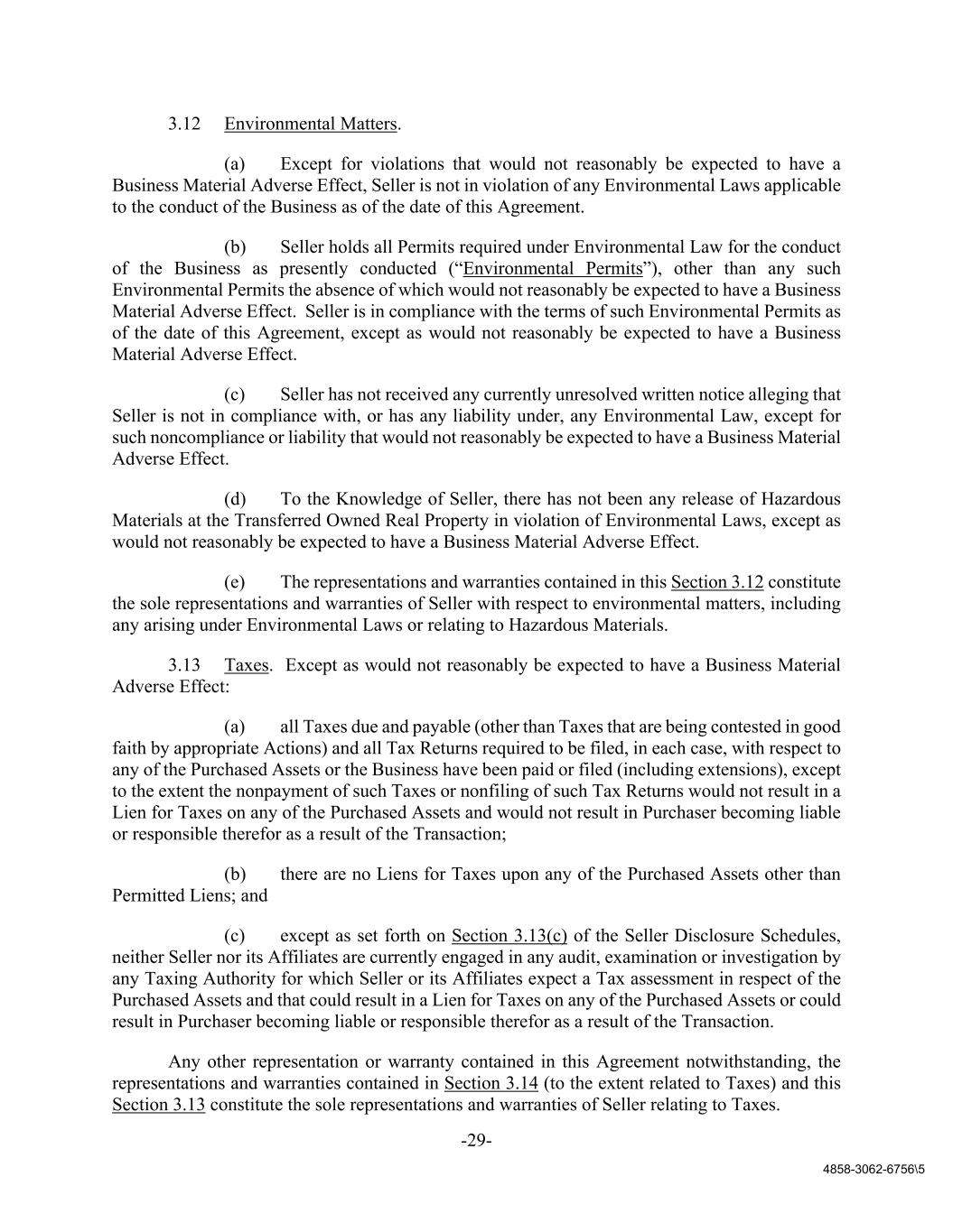 -29- 4858-3062-6756\5 3.12 Environmental Matters. (a) Except for violations that would not reasonably be expected to have a Business Material Adverse Effect, Seller is not in violation of any Environmental Laws applicable to the conduct of the Business as of the date of this Agreement. (b) Seller holds all Permits required under Environmental Law for the conduct of the Business as presently conducted (“Environmental Permits”), other than any such Environmental Permits the absence of which would not reasonably be expected to have a Business Material Adverse Effect. Seller is in compliance with the terms of such Environmental Permits as of the date of this Agreement, except as would not reasonably be expected to have a Business Material Adverse Effect. (c) Seller has not received any currently unresolved written notice alleging that Seller is not in compliance with, or has any liability under, any Environmental Law, except for such noncompliance or liability that would not reasonably be expected to have a Business Material Adverse Effect. (d) To the Knowledge of Seller, there has not been any release of Hazardous Materials at the Transferred Owned Real Property in violation of Environmental Laws, except as would not reasonably be expected to have a Business Material Adverse Effect. (e) The representations and warranties contained in this Section 3.12 constitute the sole representations and warranties of Seller with respect to environmental matters, including any arising under Environmental Laws or relating to Hazardous Materials. 3.13 Taxes. Except as would not reasonably be expected to have a Business Material Adverse Effect: (a) all Taxes due and payable (other than Taxes that are being contested in good faith by appropriate Actions) and all Tax Returns required to be filed, in each case, with respect to any of the Purchased Assets or the Business have been paid or filed (including extensions), except to the extent the nonpayment of such Taxes or nonfiling of such Tax Returns would not result in a Lien for Taxes on any of the Purchased Assets and would not result in Purchaser becoming liable or responsible therefor as a result of the Transaction; (b) there are no Liens for Taxes upon any of the Purchased Assets other than Permitted Liens; and (c) except as set forth on Section 3.13(c) of the Seller Disclosure Schedules, neither Seller nor its Affiliates are currently engaged in any audit, examination or investigation by any Taxing Authority for which Seller or its Affiliates expect a Tax assessment in respect of the Purchased Assets and that could result in a Lien for Taxes on any of the Purchased Assets or could result in Purchaser becoming liable or responsible therefor as a result of the Transaction. Any other representation or warranty contained in this Agreement notwithstanding, the representations and warranties contained in Section 3.14 (to the extent related to Taxes) and this Section 3.13 constitute the sole representations and warranties of Seller relating to Taxes.