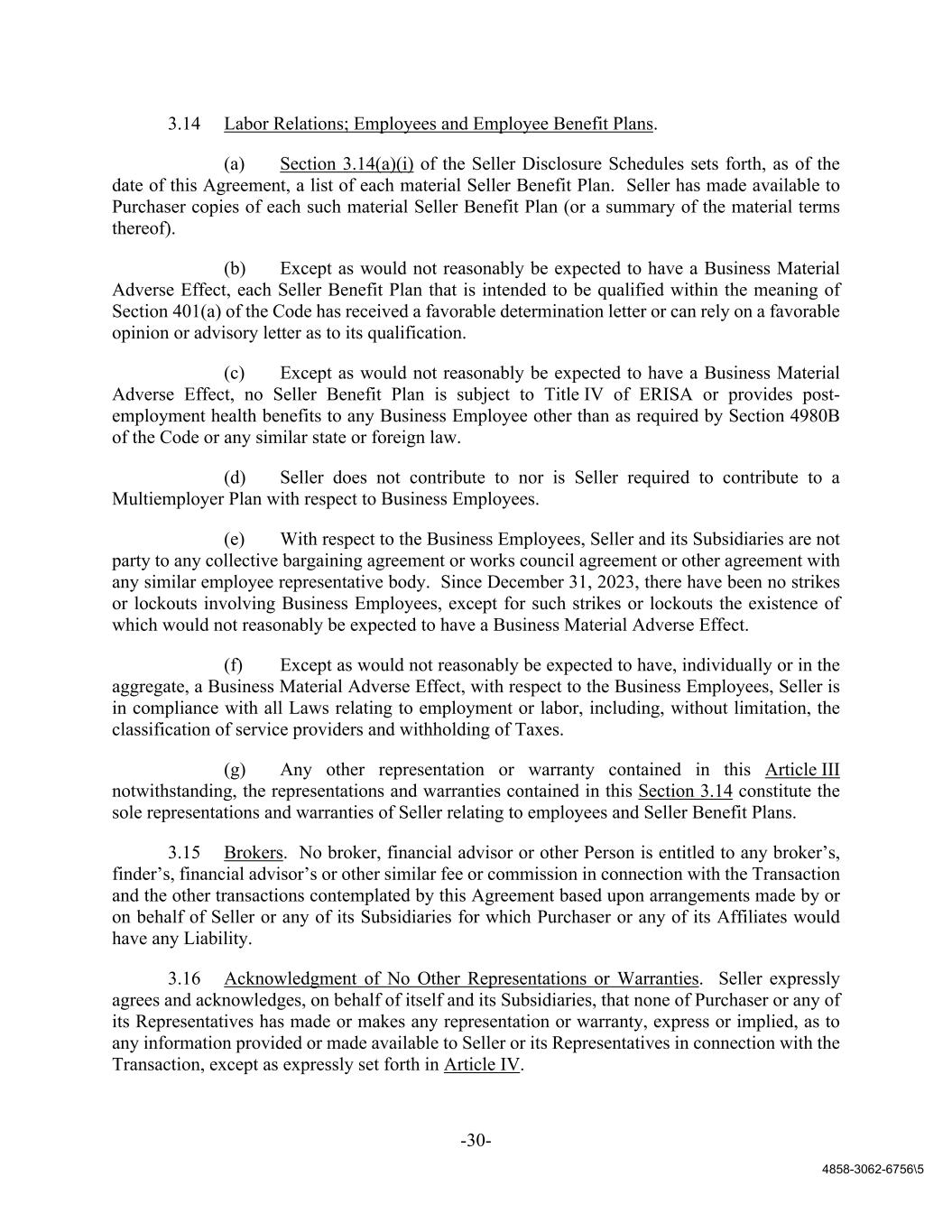 -30- 4858-3062-6756\5 3.14 Labor Relations; Employees and Employee Benefit Plans. (a) Section 3.14(a)(i) of the Seller Disclosure Schedules sets forth, as of the date of this Agreement, a list of each material Seller Benefit Plan. Seller has made available to Purchaser copies of each such material Seller Benefit Plan (or a summary of the material terms thereof). (b) Except as would not reasonably be expected to have a Business Material Adverse Effect, each Seller Benefit Plan that is intended to be qualified within the meaning of Section 401(a) of the Code has received a favorable determination letter or can rely on a favorable opinion or advisory letter as to its qualification. (c) Except as would not reasonably be expected to have a Business Material Adverse Effect, no Seller Benefit Plan is subject to Title IV of ERISA or provides post- employment health benefits to any Business Employee other than as required by Section 4980B of the Code or any similar state or foreign law. (d) Seller does not contribute to nor is Seller required to contribute to a Multiemployer Plan with respect to Business Employees. (e) With respect to the Business Employees, Seller and its Subsidiaries are not party to any collective bargaining agreement or works council agreement or other agreement with any similar employee representative body. Since December 31, 2023, there have been no strikes or lockouts involving Business Employees, except for such strikes or lockouts the existence of which would not reasonably be expected to have a Business Material Adverse Effect. (f) Except as would not reasonably be expected to have, individually or in the aggregate, a Business Material Adverse Effect, with respect to the Business Employees, Seller is in compliance with all Laws relating to employment or labor, including, without limitation, the classification of service providers and withholding of Taxes. (g) Any other representation or warranty contained in this Article III notwithstanding, the representations and warranties contained in this Section 3.14 constitute the sole representations and warranties of Seller relating to employees and Seller Benefit Plans. 3.15 Brokers. No broker, financial advisor or other Person is entitled to any broker’s, finder’s, financial advisor’s or other similar fee or commission in connection with the Transaction and the other transactions contemplated by this Agreement based upon arrangements made by or on behalf of Seller or any of its Subsidiaries for which Purchaser or any of its Affiliates would have any Liability. 3.16 Acknowledgment of No Other Representations or Warranties. Seller expressly agrees and acknowledges, on behalf of itself and its Subsidiaries, that none of Purchaser or any of its Representatives has made or makes any representation or warranty, express or implied, as to any information provided or made available to Seller or its Representatives in connection with the Transaction, except as expressly set forth in Article IV.