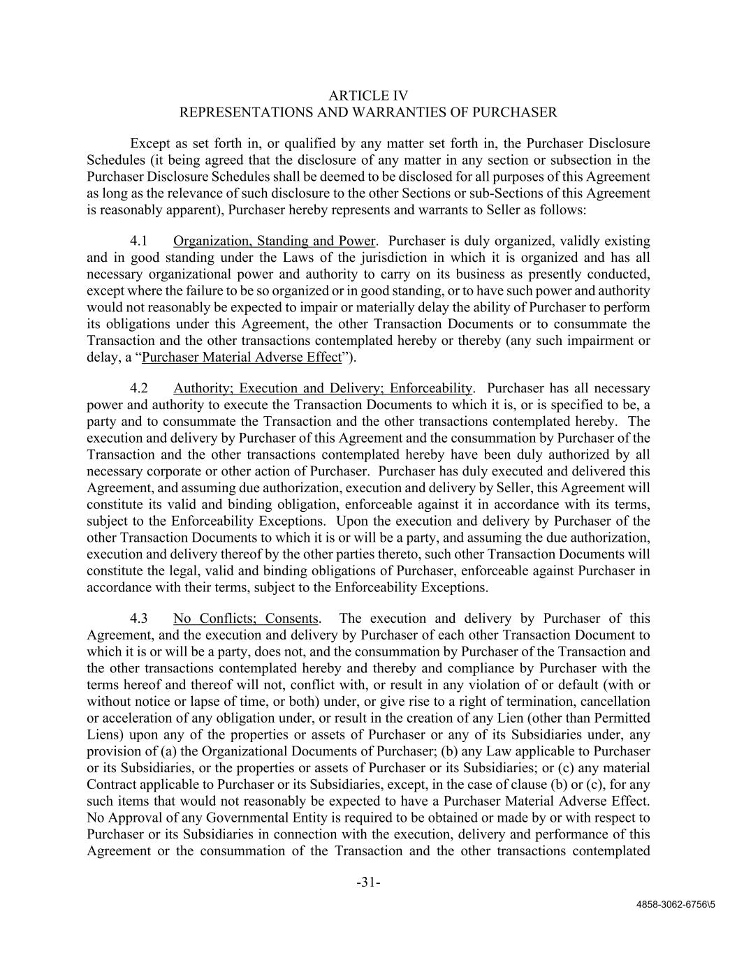 -31- 4858-3062-6756\5 ARTICLE IV REPRESENTATIONS AND WARRANTIES OF PURCHASER Except as set forth in, or qualified by any matter set forth in, the Purchaser Disclosure Schedules (it being agreed that the disclosure of any matter in any section or subsection in the Purchaser Disclosure Schedules shall be deemed to be disclosed for all purposes of this Agreement as long as the relevance of such disclosure to the other Sections or sub-Sections of this Agreement is reasonably apparent), Purchaser hereby represents and warrants to Seller as follows: 4.1 Organization, Standing and Power. Purchaser is duly organized, validly existing and in good standing under the Laws of the jurisdiction in which it is organized and has all necessary organizational power and authority to carry on its business as presently conducted, except where the failure to be so organized or in good standing, or to have such power and authority would not reasonably be expected to impair or materially delay the ability of Purchaser to perform its obligations under this Agreement, the other Transaction Documents or to consummate the Transaction and the other transactions contemplated hereby or thereby (any such impairment or delay, a “Purchaser Material Adverse Effect”). 4.2 Authority; Execution and Delivery; Enforceability. Purchaser has all necessary power and authority to execute the Transaction Documents to which it is, or is specified to be, a party and to consummate the Transaction and the other transactions contemplated hereby. The execution and delivery by Purchaser of this Agreement and the consummation by Purchaser of the Transaction and the other transactions contemplated hereby have been duly authorized by all necessary corporate or other action of Purchaser. Purchaser has duly executed and delivered this Agreement, and assuming due authorization, execution and delivery by Seller, this Agreement will constitute its valid and binding obligation, enforceable against it in accordance with its terms, subject to the Enforceability Exceptions. Upon the execution and delivery by Purchaser of the other Transaction Documents to which it is or will be a party, and assuming the due authorization, execution and delivery thereof by the other parties thereto, such other Transaction Documents will constitute the legal, valid and binding obligations of Purchaser, enforceable against Purchaser in accordance with their terms, subject to the Enforceability Exceptions. 4.3 No Conflicts; Consents. The execution and delivery by Purchaser of this Agreement, and the execution and delivery by Purchaser of each other Transaction Document to which it is or will be a party, does not, and the consummation by Purchaser of the Transaction and the other transactions contemplated hereby and thereby and compliance by Purchaser with the terms hereof and thereof will not, conflict with, or result in any violation of or default (with or without notice or lapse of time, or both) under, or give rise to a right of termination, cancellation or acceleration of any obligation under, or result in the creation of any Lien (other than Permitted Liens) upon any of the properties or assets of Purchaser or any of its Subsidiaries under, any provision of (a) the Organizational Documents of Purchaser; (b) any Law applicable to Purchaser or its Subsidiaries, or the properties or assets of Purchaser or its Subsidiaries; or (c) any material Contract applicable to Purchaser or its Subsidiaries, except, in the case of clause (b) or (c), for any such items that would not reasonably be expected to have a Purchaser Material Adverse Effect. No Approval of any Governmental Entity is required to be obtained or made by or with respect to Purchaser or its Subsidiaries in connection with the execution, delivery and performance of this Agreement or the consummation of the Transaction and the other transactions contemplated