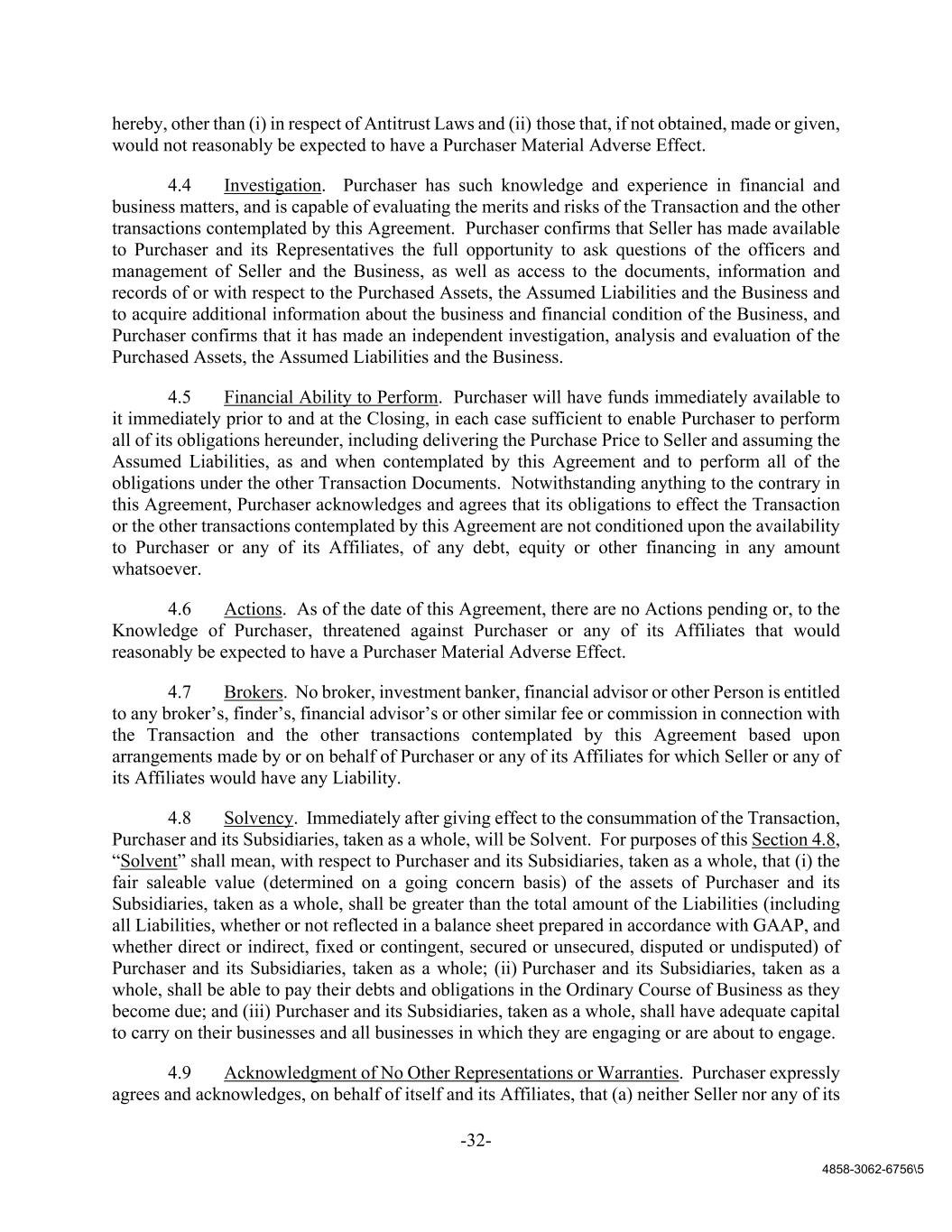 -32- 4858-3062-6756\5 hereby, other than (i) in respect of Antitrust Laws and (ii) those that, if not obtained, made or given, would not reasonably be expected to have a Purchaser Material Adverse Effect. 4.4 Investigation. Purchaser has such knowledge and experience in financial and business matters, and is capable of evaluating the merits and risks of the Transaction and the other transactions contemplated by this Agreement. Purchaser confirms that Seller has made available to Purchaser and its Representatives the full opportunity to ask questions of the officers and management of Seller and the Business, as well as access to the documents, information and records of or with respect to the Purchased Assets, the Assumed Liabilities and the Business and to acquire additional information about the business and financial condition of the Business, and Purchaser confirms that it has made an independent investigation, analysis and evaluation of the Purchased Assets, the Assumed Liabilities and the Business. 4.5 Financial Ability to Perform. Purchaser will have funds immediately available to it immediately prior to and at the Closing, in each case sufficient to enable Purchaser to perform all of its obligations hereunder, including delivering the Purchase Price to Seller and assuming the Assumed Liabilities, as and when contemplated by this Agreement and to perform all of the obligations under the other Transaction Documents. Notwithstanding anything to the contrary in this Agreement, Purchaser acknowledges and agrees that its obligations to effect the Transaction or the other transactions contemplated by this Agreement are not conditioned upon the availability to Purchaser or any of its Affiliates, of any debt, equity or other financing in any amount whatsoever. 4.6 Actions. As of the date of this Agreement, there are no Actions pending or, to the Knowledge of Purchaser, threatened against Purchaser or any of its Affiliates that would reasonably be expected to have a Purchaser Material Adverse Effect. 4.7 Brokers. No broker, investment banker, financial advisor or other Person is entitled to any broker’s, finder’s, financial advisor’s or other similar fee or commission in connection with the Transaction and the other transactions contemplated by this Agreement based upon arrangements made by or on behalf of Purchaser or any of its Affiliates for which Seller or any of its Affiliates would have any Liability. 4.8 Solvency. Immediately after giving effect to the consummation of the Transaction, Purchaser and its Subsidiaries, taken as a whole, will be Solvent. For purposes of this Section 4.8, “Solvent” shall mean, with respect to Purchaser and its Subsidiaries, taken as a whole, that (i) the fair saleable value (determined on a going concern basis) of the assets of Purchaser and its Subsidiaries, taken as a whole, shall be greater than the total amount of the Liabilities (including all Liabilities, whether or not reflected in a balance sheet prepared in accordance with GAAP, and whether direct or indirect, fixed or contingent, secured or unsecured, disputed or undisputed) of Purchaser and its Subsidiaries, taken as a whole; (ii) Purchaser and its Subsidiaries, taken as a whole, shall be able to pay their debts and obligations in the Ordinary Course of Business as they become due; and (iii) Purchaser and its Subsidiaries, taken as a whole, shall have adequate capital to carry on their businesses and all businesses in which they are engaging or are about to engage. 4.9 Acknowledgment of No Other Representations or Warranties. Purchaser expressly agrees and acknowledges, on behalf of itself and its Affiliates, that (a) neither Seller nor any of its
