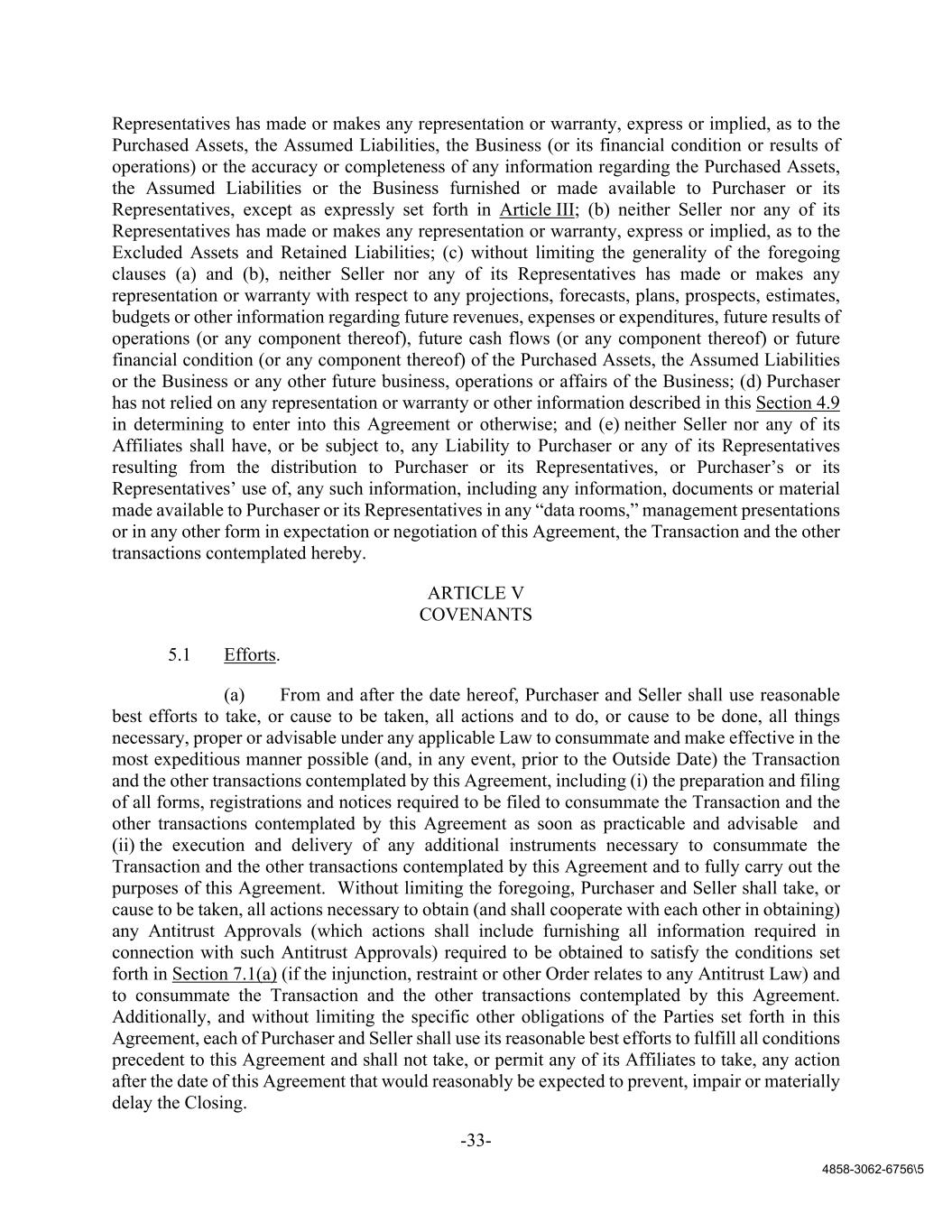 -33- 4858-3062-6756\5 Representatives has made or makes any representation or warranty, express or implied, as to the Purchased Assets, the Assumed Liabilities, the Business (or its financial condition or results of operations) or the accuracy or completeness of any information regarding the Purchased Assets, the Assumed Liabilities or the Business furnished or made available to Purchaser or its Representatives, except as expressly set forth in Article III; (b) neither Seller nor any of its Representatives has made or makes any representation or warranty, express or implied, as to the Excluded Assets and Retained Liabilities; (c) without limiting the generality of the foregoing clauses (a) and (b), neither Seller nor any of its Representatives has made or makes any representation or warranty with respect to any projections, forecasts, plans, prospects, estimates, budgets or other information regarding future revenues, expenses or expenditures, future results of operations (or any component thereof), future cash flows (or any component thereof) or future financial condition (or any component thereof) of the Purchased Assets, the Assumed Liabilities or the Business or any other future business, operations or affairs of the Business; (d) Purchaser has not relied on any representation or warranty or other information described in this Section 4.9 in determining to enter into this Agreement or otherwise; and (e) neither Seller nor any of its Affiliates shall have, or be subject to, any Liability to Purchaser or any of its Representatives resulting from the distribution to Purchaser or its Representatives, or Purchaser’s or its Representatives’ use of, any such information, including any information, documents or material made available to Purchaser or its Representatives in any “data rooms,” management presentations or in any other form in expectation or negotiation of this Agreement, the Transaction and the other transactions contemplated hereby. ARTICLE V COVENANTS 5.1 Efforts. (a) From and after the date hereof, Purchaser and Seller shall use reasonable best efforts to take, or cause to be taken, all actions and to do, or cause to be done, all things necessary, proper or advisable under any applicable Law to consummate and make effective in the most expeditious manner possible (and, in any event, prior to the Outside Date) the Transaction and the other transactions contemplated by this Agreement, including (i) the preparation and filing of all forms, registrations and notices required to be filed to consummate the Transaction and the other transactions contemplated by this Agreement as soon as practicable and advisable and (ii) the execution and delivery of any additional instruments necessary to consummate the Transaction and the other transactions contemplated by this Agreement and to fully carry out the purposes of this Agreement. Without limiting the foregoing, Purchaser and Seller shall take, or cause to be taken, all actions necessary to obtain (and shall cooperate with each other in obtaining) any Antitrust Approvals (which actions shall include furnishing all information required in connection with such Antitrust Approvals) required to be obtained to satisfy the conditions set forth in Section 7.1(a) (if the injunction, restraint or other Order relates to any Antitrust Law) and to consummate the Transaction and the other transactions contemplated by this Agreement. Additionally, and without limiting the specific other obligations of the Parties set forth in this Agreement, each of Purchaser and Seller shall use its reasonable best efforts to fulfill all conditions precedent to this Agreement and shall not take, or permit any of its Affiliates to take, any action after the date of this Agreement that would reasonably be expected to prevent, impair or materially delay the Closing.