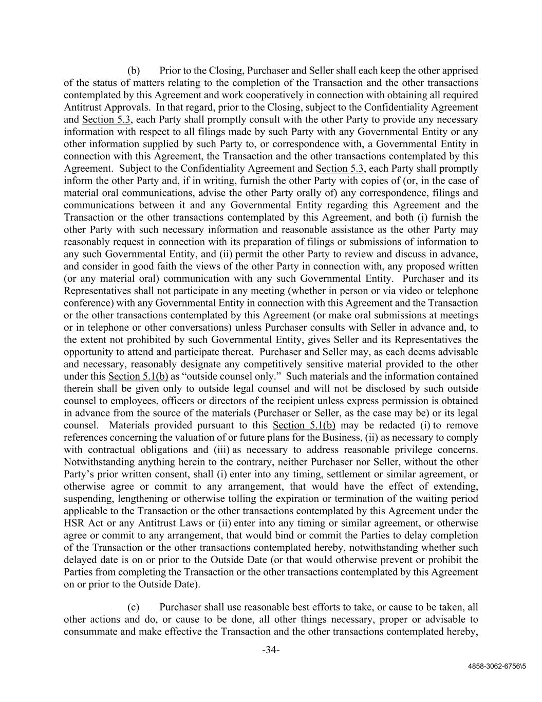 -34- 4858-3062-6756\5 (b) Prior to the Closing, Purchaser and Seller shall each keep the other apprised of the status of matters relating to the completion of the Transaction and the other transactions contemplated by this Agreement and work cooperatively in connection with obtaining all required Antitrust Approvals. In that regard, prior to the Closing, subject to the Confidentiality Agreement and Section 5.3, each Party shall promptly consult with the other Party to provide any necessary information with respect to all filings made by such Party with any Governmental Entity or any other information supplied by such Party to, or correspondence with, a Governmental Entity in connection with this Agreement, the Transaction and the other transactions contemplated by this Agreement. Subject to the Confidentiality Agreement and Section 5.3, each Party shall promptly inform the other Party and, if in writing, furnish the other Party with copies of (or, in the case of material oral communications, advise the other Party orally of) any correspondence, filings and communications between it and any Governmental Entity regarding this Agreement and the Transaction or the other transactions contemplated by this Agreement, and both (i) furnish the other Party with such necessary information and reasonable assistance as the other Party may reasonably request in connection with its preparation of filings or submissions of information to any such Governmental Entity, and (ii) permit the other Party to review and discuss in advance, and consider in good faith the views of the other Party in connection with, any proposed written (or any material oral) communication with any such Governmental Entity. Purchaser and its Representatives shall not participate in any meeting (whether in person or via video or telephone conference) with any Governmental Entity in connection with this Agreement and the Transaction or the other transactions contemplated by this Agreement (or make oral submissions at meetings or in telephone or other conversations) unless Purchaser consults with Seller in advance and, to the extent not prohibited by such Governmental Entity, gives Seller and its Representatives the opportunity to attend and participate thereat. Purchaser and Seller may, as each deems advisable and necessary, reasonably designate any competitively sensitive material provided to the other under this Section 5.1(b) as “outside counsel only.” Such materials and the information contained therein shall be given only to outside legal counsel and will not be disclosed by such outside counsel to employees, officers or directors of the recipient unless express permission is obtained in advance from the source of the materials (Purchaser or Seller, as the case may be) or its legal counsel. Materials provided pursuant to this Section 5.1(b) may be redacted (i) to remove references concerning the valuation of or future plans for the Business, (ii) as necessary to comply with contractual obligations and (iii) as necessary to address reasonable privilege concerns. Notwithstanding anything herein to the contrary, neither Purchaser nor Seller, without the other Party’s prior written consent, shall (i) enter into any timing, settlement or similar agreement, or otherwise agree or commit to any arrangement, that would have the effect of extending, suspending, lengthening or otherwise tolling the expiration or termination of the waiting period applicable to the Transaction or the other transactions contemplated by this Agreement under the HSR Act or any Antitrust Laws or (ii) enter into any timing or similar agreement, or otherwise agree or commit to any arrangement, that would bind or commit the Parties to delay completion of the Transaction or the other transactions contemplated hereby, notwithstanding whether such delayed date is on or prior to the Outside Date (or that would otherwise prevent or prohibit the Parties from completing the Transaction or the other transactions contemplated by this Agreement on or prior to the Outside Date). (c) Purchaser shall use reasonable best efforts to take, or cause to be taken, all other actions and do, or cause to be done, all other things necessary, proper or advisable to consummate and make effective the Transaction and the other transactions contemplated hereby,