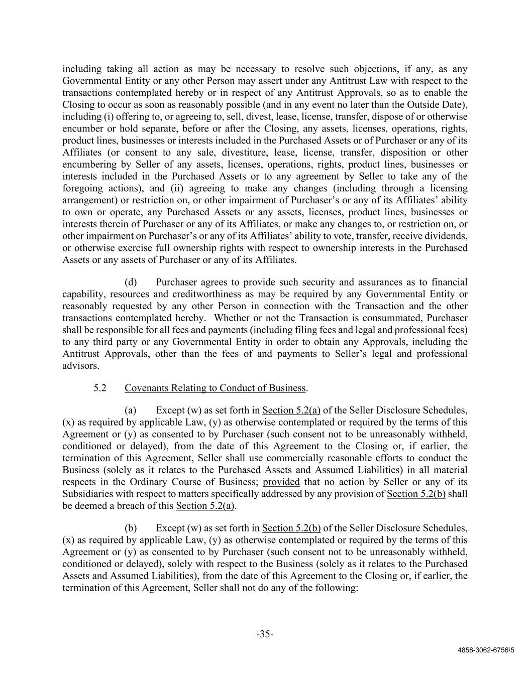 -35- 4858-3062-6756\5 including taking all action as may be necessary to resolve such objections, if any, as any Governmental Entity or any other Person may assert under any Antitrust Law with respect to the transactions contemplated hereby or in respect of any Antitrust Approvals, so as to enable the Closing to occur as soon as reasonably possible (and in any event no later than the Outside Date), including (i) offering to, or agreeing to, sell, divest, lease, license, transfer, dispose of or otherwise encumber or hold separate, before or after the Closing, any assets, licenses, operations, rights, product lines, businesses or interests included in the Purchased Assets or of Purchaser or any of its Affiliates (or consent to any sale, divestiture, lease, license, transfer, disposition or other encumbering by Seller of any assets, licenses, operations, rights, product lines, businesses or interests included in the Purchased Assets or to any agreement by Seller to take any of the foregoing actions), and (ii) agreeing to make any changes (including through a licensing arrangement) or restriction on, or other impairment of Purchaser’s or any of its Affiliates’ ability to own or operate, any Purchased Assets or any assets, licenses, product lines, businesses or interests therein of Purchaser or any of its Affiliates, or make any changes to, or restriction on, or other impairment on Purchaser’s or any of its Affiliates’ ability to vote, transfer, receive dividends, or otherwise exercise full ownership rights with respect to ownership interests in the Purchased Assets or any assets of Purchaser or any of its Affiliates. (d) Purchaser agrees to provide such security and assurances as to financial capability, resources and creditworthiness as may be required by any Governmental Entity or reasonably requested by any other Person in connection with the Transaction and the other transactions contemplated hereby. Whether or not the Transaction is consummated, Purchaser shall be responsible for all fees and payments (including filing fees and legal and professional fees) to any third party or any Governmental Entity in order to obtain any Approvals, including the Antitrust Approvals, other than the fees of and payments to Seller’s legal and professional advisors. 5.2 Covenants Relating to Conduct of Business. (a) Except (w) as set forth in Section 5.2(a) of the Seller Disclosure Schedules, (x) as required by applicable Law, (y) as otherwise contemplated or required by the terms of this Agreement or (y) as consented to by Purchaser (such consent not to be unreasonably withheld, conditioned or delayed), from the date of this Agreement to the Closing or, if earlier, the termination of this Agreement, Seller shall use commercially reasonable efforts to conduct the Business (solely as it relates to the Purchased Assets and Assumed Liabilities) in all material respects in the Ordinary Course of Business; provided that no action by Seller or any of its Subsidiaries with respect to matters specifically addressed by any provision of Section 5.2(b) shall be deemed a breach of this Section 5.2(a). (b) Except (w) as set forth in Section 5.2(b) of the Seller Disclosure Schedules, (x) as required by applicable Law, (y) as otherwise contemplated or required by the terms of this Agreement or (y) as consented to by Purchaser (such consent not to be unreasonably withheld, conditioned or delayed), solely with respect to the Business (solely as it relates to the Purchased Assets and Assumed Liabilities), from the date of this Agreement to the Closing or, if earlier, the termination of this Agreement, Seller shall not do any of the following: