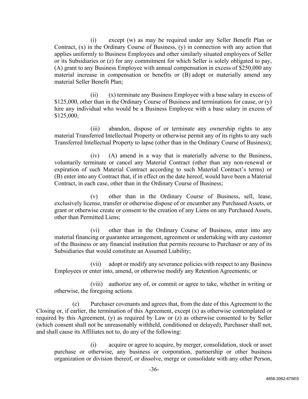 -36- 4858-3062-6756\5 (i) except (w) as may be required under any Seller Benefit Plan or Contract, (x) in the Ordinary Course of Business, (y) in connection with any action that applies uniformly to Business Employees and other similarly situated employees of Seller or its Subsidiaries or (z) for any commitment for which Seller is solely obligated to pay, (A) grant to any Business Employee with annual compensation in excess of $250,000 any material increase in compensation or benefits or (B) adopt or materially amend any material Seller Benefit Plan; (ii) (x) terminate any Business Employee with a base salary in excess of $125,000, other than in the Ordinary Course of Business and terminations for cause, or (y) hire any individual who would be a Business Employee with a base salary in excess of $125,000; (iii) abandon, dispose of or terminate any ownership rights to any material Transferred Intellectual Property or otherwise permit any of its rights to any such Transferred Intellectual Property to lapse (other than in the Ordinary Course of Business); (iv) (A) amend in a way that is materially adverse to the Business, voluntarily terminate or cancel any Material Contract (other than any non-renewal or expiration of such Material Contract according to such Material Contract’s terms) or (B) enter into any Contract that, if in effect on the date hereof, would have been a Material Contract, in each case, other than in the Ordinary Course of Business; (v) other than in the Ordinary Course of Business, sell, lease, exclusively license, transfer or otherwise dispose of or encumber any Purchased Assets, or grant or otherwise create or consent to the creation of any Liens on any Purchased Assets, other than Permitted Liens; (vi) other than in the Ordinary Course of Business, enter into any material financing or guarantee arrangement, agreement or undertaking with any customer of the Business or any financial institution that permits recourse to Purchaser or any of its Subsidiaries that would constitute an Assumed Liability; (vii) adopt or modify any severance policies with respect to any Business Employees or enter into, amend, or otherwise modify any Retention Agreements; or (viii) authorize any of, or commit or agree to take, whether in writing or otherwise, the foregoing actions. (c) Purchaser covenants and agrees that, from the date of this Agreement to the Closing or, if earlier, the termination of this Agreement, except (x) as otherwise contemplated or required by this Agreement, (y) as required by Law or (z) as otherwise consented to by Seller (which consent shall not be unreasonably withheld, conditioned or delayed), Purchaser shall not, and shall cause its Affiliates not to, do any of the following: (i) acquire or agree to acquire, by merger, consolidation, stock or asset purchase or otherwise, any business or corporation, partnership or other business organization or division thereof, or dissolve, merge or consolidate with any other Person,