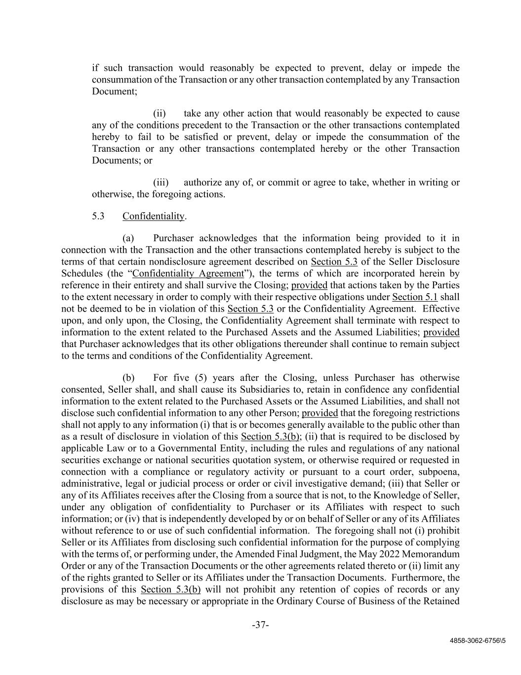 -37- 4858-3062-6756\5 if such transaction would reasonably be expected to prevent, delay or impede the consummation of the Transaction or any other transaction contemplated by any Transaction Document; (ii) take any other action that would reasonably be expected to cause any of the conditions precedent to the Transaction or the other transactions contemplated hereby to fail to be satisfied or prevent, delay or impede the consummation of the Transaction or any other transactions contemplated hereby or the other Transaction Documents; or (iii) authorize any of, or commit or agree to take, whether in writing or otherwise, the foregoing actions. 5.3 Confidentiality. (a) Purchaser acknowledges that the information being provided to it in connection with the Transaction and the other transactions contemplated hereby is subject to the terms of that certain nondisclosure agreement described on Section 5.3 of the Seller Disclosure Schedules (the “Confidentiality Agreement”), the terms of which are incorporated herein by reference in their entirety and shall survive the Closing; provided that actions taken by the Parties to the extent necessary in order to comply with their respective obligations under Section 5.1 shall not be deemed to be in violation of this Section 5.3 or the Confidentiality Agreement. Effective upon, and only upon, the Closing, the Confidentiality Agreement shall terminate with respect to information to the extent related to the Purchased Assets and the Assumed Liabilities; provided that Purchaser acknowledges that its other obligations thereunder shall continue to remain subject to the terms and conditions of the Confidentiality Agreement. (b) For five (5) years after the Closing, unless Purchaser has otherwise consented, Seller shall, and shall cause its Subsidiaries to, retain in confidence any confidential information to the extent related to the Purchased Assets or the Assumed Liabilities, and shall not disclose such confidential information to any other Person; provided that the foregoing restrictions shall not apply to any information (i) that is or becomes generally available to the public other than as a result of disclosure in violation of this Section 5.3(b); (ii) that is required to be disclosed by applicable Law or to a Governmental Entity, including the rules and regulations of any national securities exchange or national securities quotation system, or otherwise required or requested in connection with a compliance or regulatory activity or pursuant to a court order, subpoena, administrative, legal or judicial process or order or civil investigative demand; (iii) that Seller or any of its Affiliates receives after the Closing from a source that is not, to the Knowledge of Seller, under any obligation of confidentiality to Purchaser or its Affiliates with respect to such information; or (iv) that is independently developed by or on behalf of Seller or any of its Affiliates without reference to or use of such confidential information. The foregoing shall not (i) prohibit Seller or its Affiliates from disclosing such confidential information for the purpose of complying with the terms of, or performing under, the Amended Final Judgment, the May 2022 Memorandum Order or any of the Transaction Documents or the other agreements related thereto or (ii) limit any of the rights granted to Seller or its Affiliates under the Transaction Documents. Furthermore, the provisions of this Section 5.3(b) will not prohibit any retention of copies of records or any disclosure as may be necessary or appropriate in the Ordinary Course of Business of the Retained