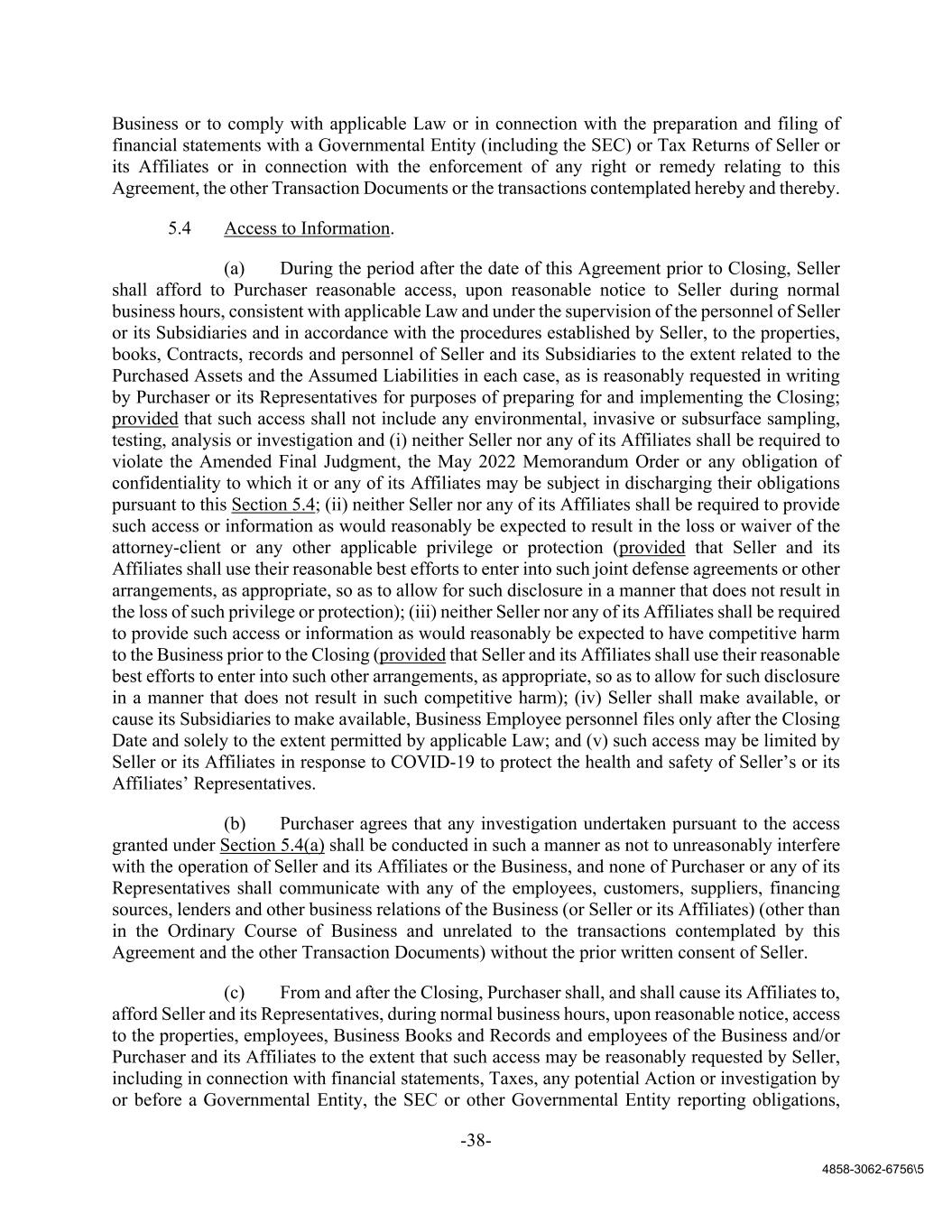 -38- 4858-3062-6756\5 Business or to comply with applicable Law or in connection with the preparation and filing of financial statements with a Governmental Entity (including the SEC) or Tax Returns of Seller or its Affiliates or in connection with the enforcement of any right or remedy relating to this Agreement, the other Transaction Documents or the transactions contemplated hereby and thereby. 5.4 Access to Information. (a) During the period after the date of this Agreement prior to Closing, Seller shall afford to Purchaser reasonable access, upon reasonable notice to Seller during normal business hours, consistent with applicable Law and under the supervision of the personnel of Seller or its Subsidiaries and in accordance with the procedures established by Seller, to the properties, books, Contracts, records and personnel of Seller and its Subsidiaries to the extent related to the Purchased Assets and the Assumed Liabilities in each case, as is reasonably requested in writing by Purchaser or its Representatives for purposes of preparing for and implementing the Closing; provided that such access shall not include any environmental, invasive or subsurface sampling, testing, analysis or investigation and (i) neither Seller nor any of its Affiliates shall be required to violate the Amended Final Judgment, the May 2022 Memorandum Order or any obligation of confidentiality to which it or any of its Affiliates may be subject in discharging their obligations pursuant to this Section 5.4; (ii) neither Seller nor any of its Affiliates shall be required to provide such access or information as would reasonably be expected to result in the loss or waiver of the attorney-client or any other applicable privilege or protection (provided that Seller and its Affiliates shall use their reasonable best efforts to enter into such joint defense agreements or other arrangements, as appropriate, so as to allow for such disclosure in a manner that does not result in the loss of such privilege or protection); (iii) neither Seller nor any of its Affiliates shall be required to provide such access or information as would reasonably be expected to have competitive harm to the Business prior to the Closing (provided that Seller and its Affiliates shall use their reasonable best efforts to enter into such other arrangements, as appropriate, so as to allow for such disclosure in a manner that does not result in such competitive harm); (iv) Seller shall make available, or cause its Subsidiaries to make available, Business Employee personnel files only after the Closing Date and solely to the extent permitted by applicable Law; and (v) such access may be limited by Seller or its Affiliates in response to COVID-19 to protect the health and safety of Seller’s or its Affiliates’ Representatives. (b) Purchaser agrees that any investigation undertaken pursuant to the access granted under Section 5.4(a) shall be conducted in such a manner as not to unreasonably interfere with the operation of Seller and its Affiliates or the Business, and none of Purchaser or any of its Representatives shall communicate with any of the employees, customers, suppliers, financing sources, lenders and other business relations of the Business (or Seller or its Affiliates) (other than in the Ordinary Course of Business and unrelated to the transactions contemplated by this Agreement and the other Transaction Documents) without the prior written consent of Seller. (c) From and after the Closing, Purchaser shall, and shall cause its Affiliates to, afford Seller and its Representatives, during normal business hours, upon reasonable notice, access to the properties, employees, Business Books and Records and employees of the Business and/or Purchaser and its Affiliates to the extent that such access may be reasonably requested by Seller, including in connection with financial statements, Taxes, any potential Action or investigation by or before a Governmental Entity, the SEC or other Governmental Entity reporting obligations,