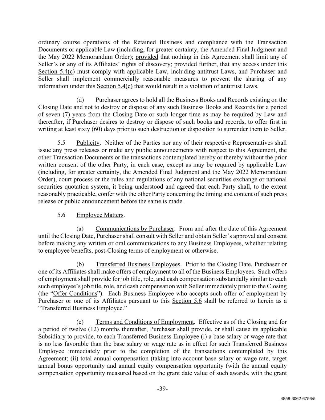 -39- 4858-3062-6756\5 ordinary course operations of the Retained Business and compliance with the Transaction Documents or applicable Law (including, for greater certainty, the Amended Final Judgment and the May 2022 Memorandum Order); provided that nothing in this Agreement shall limit any of Seller’s or any of its Affiliates’ rights of discovery; provided further, that any access under this Section 5.4(c) must comply with applicable Law, including antitrust Laws, and Purchaser and Seller shall implement commercially reasonable measures to prevent the sharing of any information under this Section 5.4(c) that would result in a violation of antitrust Laws. (d) Purchaser agrees to hold all the Business Books and Records existing on the Closing Date and not to destroy or dispose of any such Business Books and Records for a period of seven (7) years from the Closing Date or such longer time as may be required by Law and thereafter, if Purchaser desires to destroy or dispose of such books and records, to offer first in writing at least sixty (60) days prior to such destruction or disposition to surrender them to Seller. 5.5 Publicity. Neither of the Parties nor any of their respective Representatives shall issue any press releases or make any public announcements with respect to this Agreement, the other Transaction Documents or the transactions contemplated hereby or thereby without the prior written consent of the other Party, in each case, except as may be required by applicable Law (including, for greater certainty, the Amended Final Judgment and the May 2022 Memorandum Order), court process or the rules and regulations of any national securities exchange or national securities quotation system, it being understood and agreed that each Party shall, to the extent reasonably practicable, confer with the other Party concerning the timing and content of such press release or public announcement before the same is made. 5.6 Employee Matters. (a) Communications by Purchaser. From and after the date of this Agreement until the Closing Date, Purchaser shall consult with Seller and obtain Seller’s approval and consent before making any written or oral communications to any Business Employees, whether relating to employee benefits, post-Closing terms of employment or otherwise. (b) Transferred Business Employees. Prior to the Closing Date, Purchaser or one of its Affiliates shall make offers of employment to all of the Business Employees. Such offers of employment shall provide for job title, role, and cash compensation substantially similar to each such employee’s job title, role, and cash compensation with Seller immediately prior to the Closing (the “Offer Conditions”). Each Business Employee who accepts such offer of employment by Purchaser or one of its Affiliates pursuant to this Section 5.6 shall be referred to herein as a “Transferred Business Employee.” (c) Terms and Conditions of Employment. Effective as of the Closing and for a period of twelve (12) months thereafter, Purchaser shall provide, or shall cause its applicable Subsidiary to provide, to each Transferred Business Employee (i) a base salary or wage rate that is no less favorable than the base salary or wage rate as in effect for such Transferred Business Employee immediately prior to the completion of the transactions contemplated by this Agreement; (ii) total annual compensation (taking into account base salary or wage rate, target annual bonus opportunity and annual equity compensation opportunity (with the annual equity compensation opportunity measured based on the grant date value of such awards, with the grant