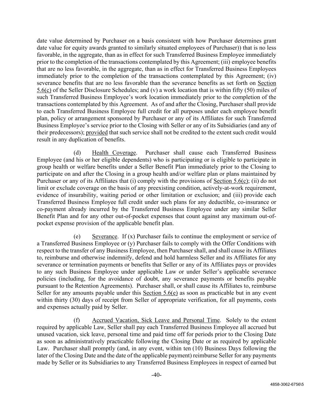 -40- 4858-3062-6756\5 date value determined by Purchaser on a basis consistent with how Purchaser determines grant date value for equity awards granted to similarly situated employees of Purchaser)) that is no less favorable, in the aggregate, than as in effect for such Transferred Business Employee immediately prior to the completion of the transactions contemplated by this Agreement; (iii) employee benefits that are no less favorable, in the aggregate, than as in effect for Transferred Business Employees immediately prior to the completion of the transactions contemplated by this Agreement; (iv) severance benefits that are no less favorable than the severance benefits as set forth on Section 5.6(c) of the Seller Disclosure Schedules; and (v) a work location that is within fifty (50) miles of such Transferred Business Employee’s work location immediately prior to the completion of the transactions contemplated by this Agreement. As of and after the Closing, Purchaser shall provide to each Transferred Business Employee full credit for all purposes under each employee benefit plan, policy or arrangement sponsored by Purchaser or any of its Affiliates for such Transferred Business Employee’s service prior to the Closing with Seller or any of its Subsidiaries (and any of their predecessors); provided that such service shall not be credited to the extent such credit would result in any duplication of benefits. (d) Health Coverage. Purchaser shall cause each Transferred Business Employee (and his or her eligible dependents) who is participating or is eligible to participate in group health or welfare benefits under a Seller Benefit Plan immediately prior to the Closing to participate on and after the Closing in a group health and/or welfare plan or plans maintained by Purchaser or any of its Affiliates that (i) comply with the provisions of Section 5.6(c); (ii) do not limit or exclude coverage on the basis of any preexisting condition, actively-at-work requirement, evidence of insurability, waiting period or other limitation or exclusion; and (iii) provide each Transferred Business Employee full credit under such plans for any deductible, co-insurance or co-payment already incurred by the Transferred Business Employee under any similar Seller Benefit Plan and for any other out-of-pocket expenses that count against any maximum out-of- pocket expense provision of the applicable benefit plan. (e) Severance. If (x) Purchaser fails to continue the employment or service of a Transferred Business Employee or (y) Purchaser fails to comply with the Offer Conditions with respect to the transfer of any Business Employee, then Purchaser shall, and shall cause its Affiliates to, reimburse and otherwise indemnify, defend and hold harmless Seller and its Affiliates for any severance or termination payments or benefits that Seller or any of its Affiliates pays or provides to any such Business Employee under applicable Law or under Seller’s applicable severance policies (including, for the avoidance of doubt, any severance payments or benefits payable pursuant to the Retention Agreements). Purchaser shall, or shall cause its Affiliates to, reimburse Seller for any amounts payable under this Section 5.6(e) as soon as practicable but in any event within thirty (30) days of receipt from Seller of appropriate verification, for all payments, costs and expenses actually paid by Seller. (f) Accrued Vacation, Sick Leave and Personal Time. Solely to the extent required by applicable Law, Seller shall pay each Transferred Business Employee all accrued but unused vacation, sick leave, personal time and paid time off for periods prior to the Closing Date as soon as administratively practicable following the Closing Date or as required by applicable Law. Purchaser shall promptly (and, in any event, within ten (10) Business Days following the later of the Closing Date and the date of the applicable payment) reimburse Seller for any payments made by Seller or its Subsidiaries to any Transferred Business Employees in respect of earned but