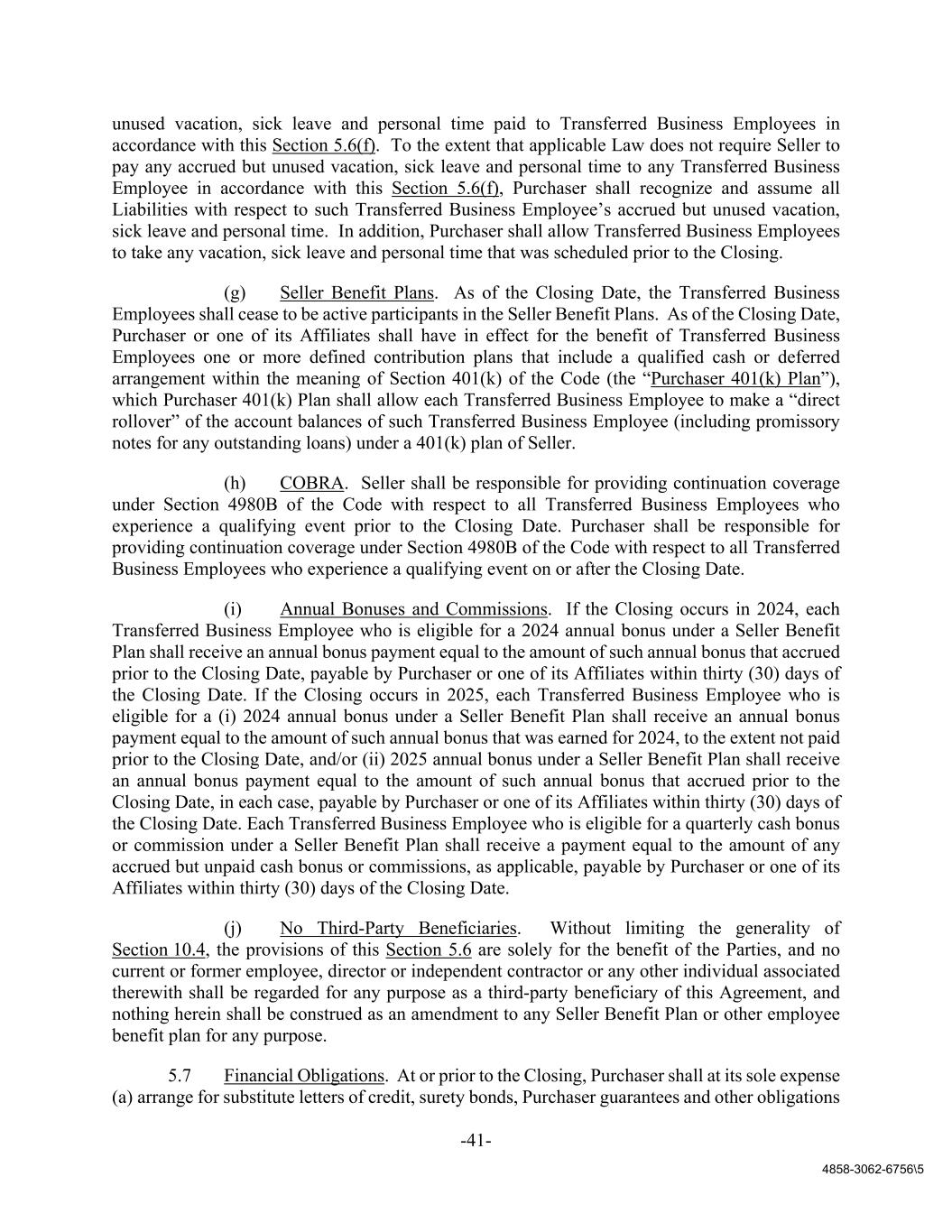 -41- 4858-3062-6756\5 unused vacation, sick leave and personal time paid to Transferred Business Employees in accordance with this Section 5.6(f). To the extent that applicable Law does not require Seller to pay any accrued but unused vacation, sick leave and personal time to any Transferred Business Employee in accordance with this Section 5.6(f), Purchaser shall recognize and assume all Liabilities with respect to such Transferred Business Employee’s accrued but unused vacation, sick leave and personal time. In addition, Purchaser shall allow Transferred Business Employees to take any vacation, sick leave and personal time that was scheduled prior to the Closing. (g) Seller Benefit Plans. As of the Closing Date, the Transferred Business Employees shall cease to be active participants in the Seller Benefit Plans. As of the Closing Date, Purchaser or one of its Affiliates shall have in effect for the benefit of Transferred Business Employees one or more defined contribution plans that include a qualified cash or deferred arrangement within the meaning of Section 401(k) of the Code (the “Purchaser 401(k) Plan”), which Purchaser 401(k) Plan shall allow each Transferred Business Employee to make a “direct rollover” of the account balances of such Transferred Business Employee (including promissory notes for any outstanding loans) under a 401(k) plan of Seller. (h) COBRA. Seller shall be responsible for providing continuation coverage under Section 4980B of the Code with respect to all Transferred Business Employees who experience a qualifying event prior to the Closing Date. Purchaser shall be responsible for providing continuation coverage under Section 4980B of the Code with respect to all Transferred Business Employees who experience a qualifying event on or after the Closing Date. (i) Annual Bonuses and Commissions. If the Closing occurs in 2024, each Transferred Business Employee who is eligible for a 2024 annual bonus under a Seller Benefit Plan shall receive an annual bonus payment equal to the amount of such annual bonus that accrued prior to the Closing Date, payable by Purchaser or one of its Affiliates within thirty (30) days of the Closing Date. If the Closing occurs in 2025, each Transferred Business Employee who is eligible for a (i) 2024 annual bonus under a Seller Benefit Plan shall receive an annual bonus payment equal to the amount of such annual bonus that was earned for 2024, to the extent not paid prior to the Closing Date, and/or (ii) 2025 annual bonus under a Seller Benefit Plan shall receive an annual bonus payment equal to the amount of such annual bonus that accrued prior to the Closing Date, in each case, payable by Purchaser or one of its Affiliates within thirty (30) days of the Closing Date. Each Transferred Business Employee who is eligible for a quarterly cash bonus or commission under a Seller Benefit Plan shall receive a payment equal to the amount of any accrued but unpaid cash bonus or commissions, as applicable, payable by Purchaser or one of its Affiliates within thirty (30) days of the Closing Date. (j) No Third-Party Beneficiaries. Without limiting the generality of Section 10.4, the provisions of this Section 5.6 are solely for the benefit of the Parties, and no current or former employee, director or independent contractor or any other individual associated therewith shall be regarded for any purpose as a third-party beneficiary of this Agreement, and nothing herein shall be construed as an amendment to any Seller Benefit Plan or other employee benefit plan for any purpose. 5.7 Financial Obligations. At or prior to the Closing, Purchaser shall at its sole expense (a) arrange for substitute letters of credit, surety bonds, Purchaser guarantees and other obligations