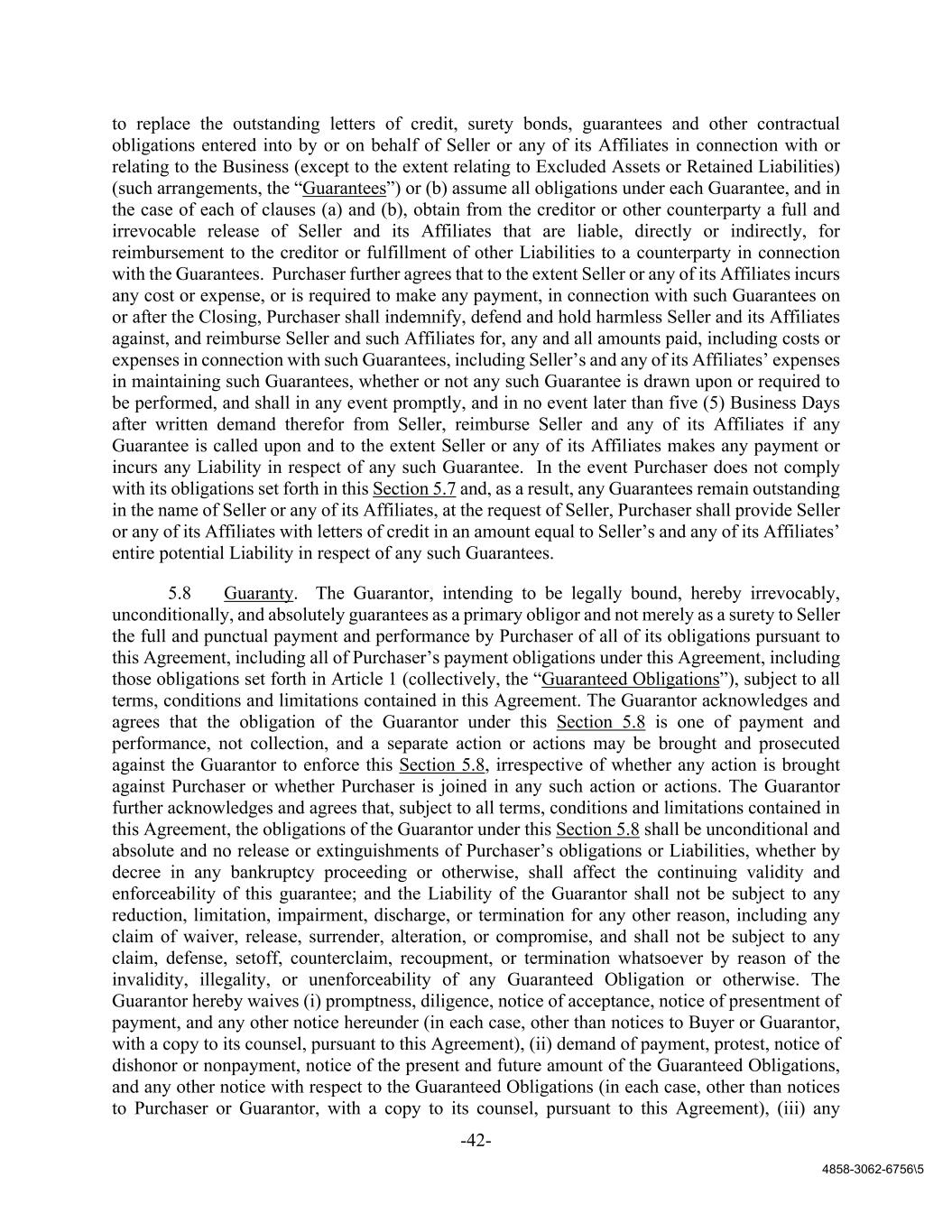 -42- 4858-3062-6756\5 to replace the outstanding letters of credit, surety bonds, guarantees and other contractual obligations entered into by or on behalf of Seller or any of its Affiliates in connection with or relating to the Business (except to the extent relating to Excluded Assets or Retained Liabilities) (such arrangements, the “Guarantees”) or (b) assume all obligations under each Guarantee, and in the case of each of clauses (a) and (b), obtain from the creditor or other counterparty a full and irrevocable release of Seller and its Affiliates that are liable, directly or indirectly, for reimbursement to the creditor or fulfillment of other Liabilities to a counterparty in connection with the Guarantees. Purchaser further agrees that to the extent Seller or any of its Affiliates incurs any cost or expense, or is required to make any payment, in connection with such Guarantees on or after the Closing, Purchaser shall indemnify, defend and hold harmless Seller and its Affiliates against, and reimburse Seller and such Affiliates for, any and all amounts paid, including costs or expenses in connection with such Guarantees, including Seller’s and any of its Affiliates’ expenses in maintaining such Guarantees, whether or not any such Guarantee is drawn upon or required to be performed, and shall in any event promptly, and in no event later than five (5) Business Days after written demand therefor from Seller, reimburse Seller and any of its Affiliates if any Guarantee is called upon and to the extent Seller or any of its Affiliates makes any payment or incurs any Liability in respect of any such Guarantee. In the event Purchaser does not comply with its obligations set forth in this Section 5.7 and, as a result, any Guarantees remain outstanding in the name of Seller or any of its Affiliates, at the request of Seller, Purchaser shall provide Seller or any of its Affiliates with letters of credit in an amount equal to Seller’s and any of its Affiliates’ entire potential Liability in respect of any such Guarantees. 5.8 Guaranty. The Guarantor, intending to be legally bound, hereby irrevocably, unconditionally, and absolutely guarantees as a primary obligor and not merely as a surety to Seller the full and punctual payment and performance by Purchaser of all of its obligations pursuant to this Agreement, including all of Purchaser’s payment obligations under this Agreement, including those obligations set forth in Article 1 (collectively, the “Guaranteed Obligations”), subject to all terms, conditions and limitations contained in this Agreement. The Guarantor acknowledges and agrees that the obligation of the Guarantor under this Section 5.8 is one of payment and performance, not collection, and a separate action or actions may be brought and prosecuted against the Guarantor to enforce this Section 5.8, irrespective of whether any action is brought against Purchaser or whether Purchaser is joined in any such action or actions. The Guarantor further acknowledges and agrees that, subject to all terms, conditions and limitations contained in this Agreement, the obligations of the Guarantor under this Section 5.8 shall be unconditional and absolute and no release or extinguishments of Purchaser’s obligations or Liabilities, whether by decree in any bankruptcy proceeding or otherwise, shall affect the continuing validity and enforceability of this guarantee; and the Liability of the Guarantor shall not be subject to any reduction, limitation, impairment, discharge, or termination for any other reason, including any claim of waiver, release, surrender, alteration, or compromise, and shall not be subject to any claim, defense, setoff, counterclaim, recoupment, or termination whatsoever by reason of the invalidity, illegality, or unenforceability of any Guaranteed Obligation or otherwise. The Guarantor hereby waives (i) promptness, diligence, notice of acceptance, notice of presentment of payment, and any other notice hereunder (in each case, other than notices to Buyer or Guarantor, with a copy to its counsel, pursuant to this Agreement), (ii) demand of payment, protest, notice of dishonor or nonpayment, notice of the present and future amount of the Guaranteed Obligations, and any other notice with respect to the Guaranteed Obligations (in each case, other than notices to Purchaser or Guarantor, with a copy to its counsel, pursuant to this Agreement), (iii) any