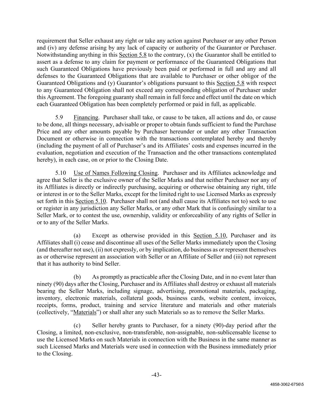 -43- 4858-3062-6756\5 requirement that Seller exhaust any right or take any action against Purchaser or any other Person and (iv) any defense arising by any lack of capacity or authority of the Guarantor or Purchaser. Notwithstanding anything in this Section 5.8 to the contrary, (x) the Guarantor shall be entitled to assert as a defense to any claim for payment or performance of the Guaranteed Obligations that such Guaranteed Obligations have previously been paid or performed in full and any and all defenses to the Guaranteed Obligations that are available to Purchaser or other obligor of the Guaranteed Obligations and (y) Guarantor’s obligations pursuant to this Section 5.8 with respect to any Guaranteed Obligation shall not exceed any corresponding obligation of Purchaser under this Agreement. The foregoing guaranty shall remain in full force and effect until the date on which each Guaranteed Obligation has been completely performed or paid in full, as applicable. 5.9 Financing. Purchaser shall take, or cause to be taken, all actions and do, or cause to be done, all things necessary, advisable or proper to obtain funds sufficient to fund the Purchase Price and any other amounts payable by Purchaser hereunder or under any other Transaction Document or otherwise in connection with the transactions contemplated hereby and thereby (including the payment of all of Purchaser’s and its Affiliates’ costs and expenses incurred in the evaluation, negotiation and execution of the Transaction and the other transactions contemplated hereby), in each case, on or prior to the Closing Date. 5.10 Use of Names Following Closing. Purchaser and its Affiliates acknowledge and agree that Seller is the exclusive owner of the Seller Marks and that neither Purchaser nor any of its Affiliates is directly or indirectly purchasing, acquiring or otherwise obtaining any right, title or interest in or to the Seller Marks, except for the limited right to use Licensed Marks as expressly set forth in this Section 5.10. Purchaser shall not (and shall cause its Affiliates not to) seek to use or register in any jurisdiction any Seller Marks, or any other Mark that is confusingly similar to a Seller Mark, or to contest the use, ownership, validity or enforceability of any rights of Seller in or to any of the Seller Marks. (a) Except as otherwise provided in this Section 5.10, Purchaser and its Affiliates shall (i) cease and discontinue all uses of the Seller Marks immediately upon the Closing (and thereafter not use), (ii) not expressly, or by implication, do business as or represent themselves as or otherwise represent an association with Seller or an Affiliate of Seller and (iii) not represent that it has authority to bind Seller. (b) As promptly as practicable after the Closing Date, and in no event later than ninety (90) days after the Closing, Purchaser and its Affiliates shall destroy or exhaust all materials bearing the Seller Marks, including signage, advertising, promotional materials, packaging, inventory, electronic materials, collateral goods, business cards, website content, invoices, receipts, forms, product, training and service literature and materials and other materials (collectively, “Materials”) or shall alter any such Materials so as to remove the Seller Marks. (c) Seller hereby grants to Purchaser, for a ninety (90)-day period after the Closing, a limited, non-exclusive, non-transferable, non-assignable, non-sublicensable license to use the Licensed Marks on such Materials in connection with the Business in the same manner as such Licensed Marks and Materials were used in connection with the Business immediately prior to the Closing.