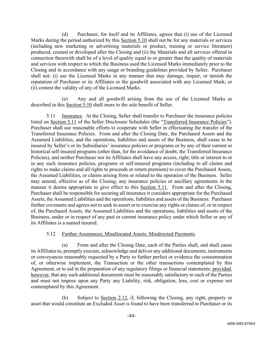 -44- 4858-3062-6756\5 (d) Purchaser, for itself and its Affiliates, agrees that (i) use of the Licensed Marks during the period authorized by this Section 5.10 shall not be for any materials or services (including new marketing or advertising materials or product, training or service literature) produced, created or developed after the Closing and (ii) the Materials and all services offered in connection therewith shall be of a level of quality equal to or greater than the quality of materials and services with respect to which the Business used the Licensed Marks immediately prior to the Closing and in accordance with any usage or branding guidelines provided by Seller. Purchaser shall not: (i) use the Licensed Marks in any manner that may damage, impair, or tarnish the reputation of Purchaser or its Affiliates or the goodwill associated with any Licensed Mark; or (ii) contest the validity of any of the Licensed Marks. (e) Any and all goodwill arising from the use of the Licensed Marks as described in this Section 5.10 shall inure to the sole benefit of Seller. 5.11 Insurance. At the Closing, Seller shall transfer to Purchaser the insurance policies listed on Section 5.11 of the Seller Disclosure Schedules (the “Transferred Insurance Policies”). Purchaser shall use reasonable efforts to cooperate with Seller in effectuating the transfer of the Transferred Insurance Policies. From and after the Closing Date, the Purchased Assets and the Assumed Liabilities, and the operations, liabilities and assets of the Business, shall cease to be insured by Seller’s or its Subsidiaries’ insurance policies or programs or by any of their current or historical self-insured programs (other than, for the avoidance of doubt, the Transferred Insurance Policies), and neither Purchaser nor its Affiliates shall have any access, right, title or interest to or in any such insurance policies, programs or self-insured programs (including to all claims and rights to make claims and all rights to proceeds or return premium) to cover the Purchased Assets, the Assumed Liabilities, or claims arising from or related to the operation of the Business. Seller may amend, effective as of the Closing, any insurance policies or ancillary agreements in the manner it deems appropriate to give effect to this Section 5.11. From and after the Closing, Purchaser shall be responsible for securing all insurance it considers appropriate for the Purchased Assets, the Assumed Liabilities and the operations, liabilities and assets of the Business. Purchaser further covenants and agrees not to seek to assert or to exercise any rights or claims of, or in respect of, the Purchased Assets, the Assumed Liabilities and the operations, liabilities and assets of the Business, under or in respect of any past or current insurance policy under which Seller or any of its Affiliates is a named insured. 5.12 Further Assurances; Misallocated Assets; Misdirected Payments. (a) From and after the Closing Date, each of the Parties shall, and shall cause its Affiliates to, promptly execute, acknowledge and deliver any additional documents, instruments or conveyances reasonably requested by a Party to further perfect or evidence the consummation of, or otherwise implement, the Transaction or the other transactions contemplated by this Agreement, or to aid in the preparation of any regulatory filings or financial statements; provided, however, that any such additional documents must be reasonably satisfactory to each of the Parties and must not impose upon any Party any Liability, risk, obligation, loss, cost or expense not contemplated by this Agreement. (b) Subject to Section 2.12, if, following the Closing, any right, property or asset that would constitute an Excluded Asset is found to have been transferred to Purchaser or its