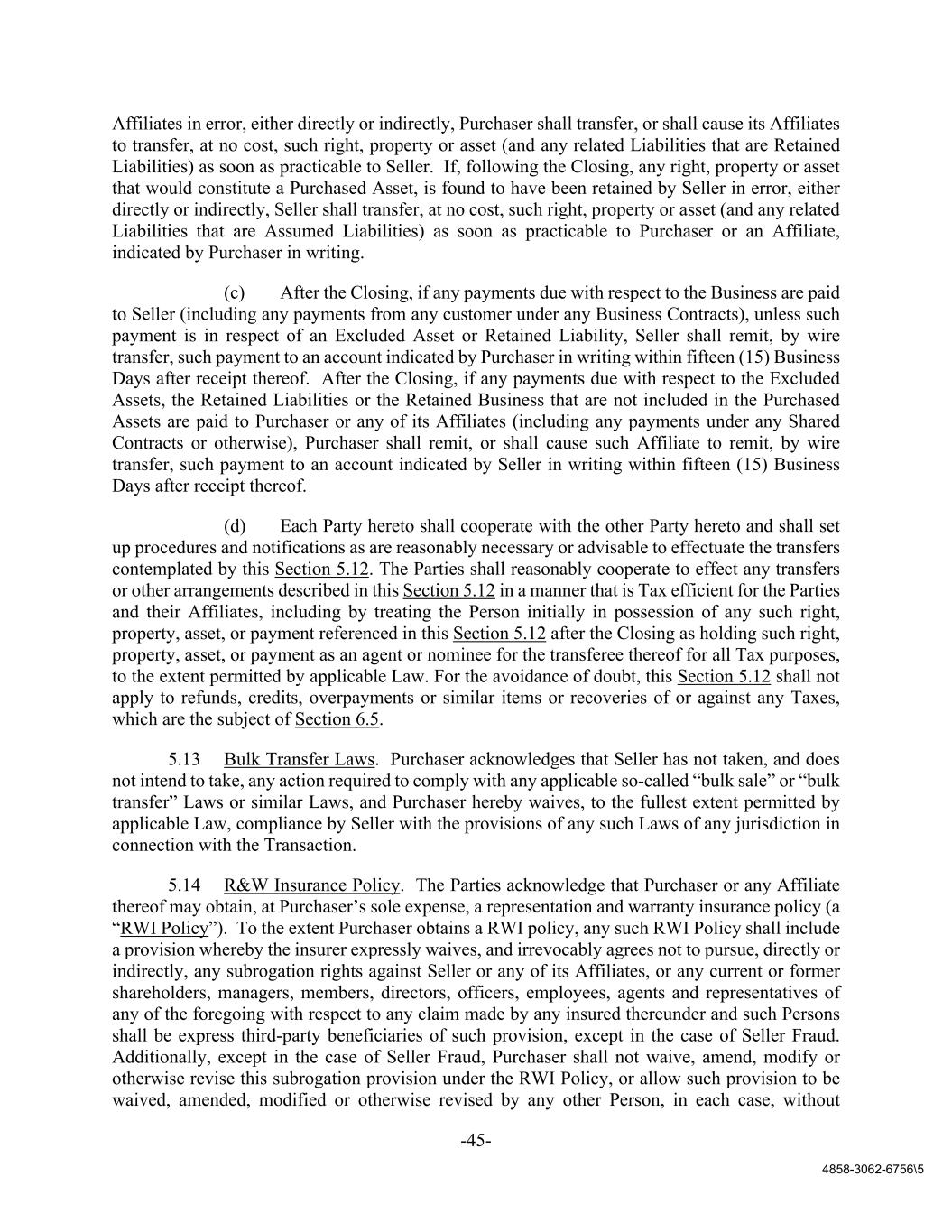 -45- 4858-3062-6756\5 Affiliates in error, either directly or indirectly, Purchaser shall transfer, or shall cause its Affiliates to transfer, at no cost, such right, property or asset (and any related Liabilities that are Retained Liabilities) as soon as practicable to Seller. If, following the Closing, any right, property or asset that would constitute a Purchased Asset, is found to have been retained by Seller in error, either directly or indirectly, Seller shall transfer, at no cost, such right, property or asset (and any related Liabilities that are Assumed Liabilities) as soon as practicable to Purchaser or an Affiliate, indicated by Purchaser in writing. (c) After the Closing, if any payments due with respect to the Business are paid to Seller (including any payments from any customer under any Business Contracts), unless such payment is in respect of an Excluded Asset or Retained Liability, Seller shall remit, by wire transfer, such payment to an account indicated by Purchaser in writing within fifteen (15) Business Days after receipt thereof. After the Closing, if any payments due with respect to the Excluded Assets, the Retained Liabilities or the Retained Business that are not included in the Purchased Assets are paid to Purchaser or any of its Affiliates (including any payments under any Shared Contracts or otherwise), Purchaser shall remit, or shall cause such Affiliate to remit, by wire transfer, such payment to an account indicated by Seller in writing within fifteen (15) Business Days after receipt thereof. (d) Each Party hereto shall cooperate with the other Party hereto and shall set up procedures and notifications as are reasonably necessary or advisable to effectuate the transfers contemplated by this Section 5.12. The Parties shall reasonably cooperate to effect any transfers or other arrangements described in this Section 5.12 in a manner that is Tax efficient for the Parties and their Affiliates, including by treating the Person initially in possession of any such right, property, asset, or payment referenced in this Section 5.12 after the Closing as holding such right, property, asset, or payment as an agent or nominee for the transferee thereof for all Tax purposes, to the extent permitted by applicable Law. For the avoidance of doubt, this Section 5.12 shall not apply to refunds, credits, overpayments or similar items or recoveries of or against any Taxes, which are the subject of Section 6.5. 5.13 Bulk Transfer Laws. Purchaser acknowledges that Seller has not taken, and does not intend to take, any action required to comply with any applicable so-called “bulk sale” or “bulk transfer” Laws or similar Laws, and Purchaser hereby waives, to the fullest extent permitted by applicable Law, compliance by Seller with the provisions of any such Laws of any jurisdiction in connection with the Transaction. 5.14 R&W Insurance Policy. The Parties acknowledge that Purchaser or any Affiliate thereof may obtain, at Purchaser’s sole expense, a representation and warranty insurance policy (a “RWI Policy”). To the extent Purchaser obtains a RWI policy, any such RWI Policy shall include a provision whereby the insurer expressly waives, and irrevocably agrees not to pursue, directly or indirectly, any subrogation rights against Seller or any of its Affiliates, or any current or former shareholders, managers, members, directors, officers, employees, agents and representatives of any of the foregoing with respect to any claim made by any insured thereunder and such Persons shall be express third-party beneficiaries of such provision, except in the case of Seller Fraud. Additionally, except in the case of Seller Fraud, Purchaser shall not waive, amend, modify or otherwise revise this subrogation provision under the RWI Policy, or allow such provision to be waived, amended, modified or otherwise revised by any other Person, in each case, without