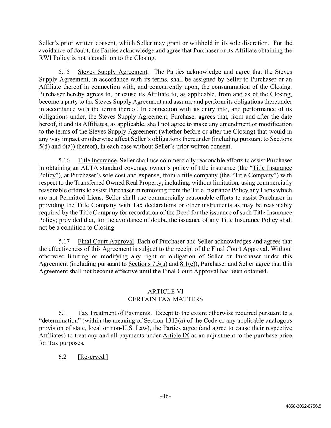 -46- 4858-3062-6756\5 Seller’s prior written consent, which Seller may grant or withhold in its sole discretion. For the avoidance of doubt, the Parties acknowledge and agree that Purchaser or its Affiliate obtaining the RWI Policy is not a condition to the Closing. 5.15 Steves Supply Agreement. The Parties acknowledge and agree that the Steves Supply Agreement, in accordance with its terms, shall be assigned by Seller to Purchaser or an Affiliate thereof in connection with, and concurrently upon, the consummation of the Closing. Purchaser hereby agrees to, or cause its Affiliate to, as applicable, from and as of the Closing, become a party to the Steves Supply Agreement and assume and perform its obligations thereunder in accordance with the terms thereof. In connection with its entry into, and performance of its obligations under, the Steves Supply Agreement, Purchaser agrees that, from and after the date hereof, it and its Affiliates, as applicable, shall not agree to make any amendment or modification to the terms of the Steves Supply Agreement (whether before or after the Closing) that would in any way impact or otherwise affect Seller’s obligations thereunder (including pursuant to Sections 5(d) and 6(a)) thereof), in each case without Seller’s prior written consent. 5.16 Title Insurance. Seller shall use commercially reasonable efforts to assist Purchaser in obtaining an ALTA standard coverage owner’s policy of title insurance (the “Title Insurance Policy”), at Purchaser’s sole cost and expense, from a title company (the “Title Company”) with respect to the Transferred Owned Real Property, including, without limitation, using commercially reasonable efforts to assist Purchaser in removing from the Title Insurance Policy any Liens which are not Permitted Liens. Seller shall use commercially reasonable efforts to assist Purchaser in providing the Title Company with Tax declarations or other instruments as may be reasonably required by the Title Company for recordation of the Deed for the issuance of such Title Insurance Policy; provided that, for the avoidance of doubt, the issuance of any Title Insurance Policy shall not be a condition to Closing. 5.17 Final Court Approval. Each of Purchaser and Seller acknowledges and agrees that the effectiveness of this Agreement is subject to the receipt of the Final Court Approval. Without otherwise limiting or modifying any right or obligation of Seller or Purchaser under this Agreement (including pursuant to Sections 7.3(a) and 8.1(e)), Purchaser and Seller agree that this Agreement shall not become effective until the Final Court Approval has been obtained. ARTICLE VI CERTAIN TAX MATTERS 6.1 Tax Treatment of Payments. Except to the extent otherwise required pursuant to a “determination” (within the meaning of Section 1313(a) of the Code or any applicable analogous provision of state, local or non-U.S. Law), the Parties agree (and agree to cause their respective Affiliates) to treat any and all payments under Article IX as an adjustment to the purchase price for Tax purposes. 6.2 [Reserved.]