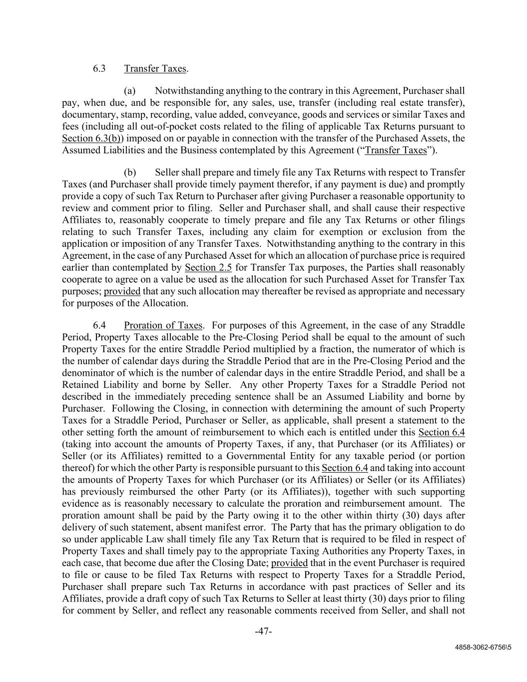 -47- 4858-3062-6756\5 6.3 Transfer Taxes. (a) Notwithstanding anything to the contrary in this Agreement, Purchaser shall pay, when due, and be responsible for, any sales, use, transfer (including real estate transfer), documentary, stamp, recording, value added, conveyance, goods and services or similar Taxes and fees (including all out-of-pocket costs related to the filing of applicable Tax Returns pursuant to Section 6.3(b)) imposed on or payable in connection with the transfer of the Purchased Assets, the Assumed Liabilities and the Business contemplated by this Agreement (“Transfer Taxes”). (b) Seller shall prepare and timely file any Tax Returns with respect to Transfer Taxes (and Purchaser shall provide timely payment therefor, if any payment is due) and promptly provide a copy of such Tax Return to Purchaser after giving Purchaser a reasonable opportunity to review and comment prior to filing. Seller and Purchaser shall, and shall cause their respective Affiliates to, reasonably cooperate to timely prepare and file any Tax Returns or other filings relating to such Transfer Taxes, including any claim for exemption or exclusion from the application or imposition of any Transfer Taxes. Notwithstanding anything to the contrary in this Agreement, in the case of any Purchased Asset for which an allocation of purchase price is required earlier than contemplated by Section 2.5 for Transfer Tax purposes, the Parties shall reasonably cooperate to agree on a value be used as the allocation for such Purchased Asset for Transfer Tax purposes; provided that any such allocation may thereafter be revised as appropriate and necessary for purposes of the Allocation. 6.4 Proration of Taxes. For purposes of this Agreement, in the case of any Straddle Period, Property Taxes allocable to the Pre-Closing Period shall be equal to the amount of such Property Taxes for the entire Straddle Period multiplied by a fraction, the numerator of which is the number of calendar days during the Straddle Period that are in the Pre-Closing Period and the denominator of which is the number of calendar days in the entire Straddle Period, and shall be a Retained Liability and borne by Seller. Any other Property Taxes for a Straddle Period not described in the immediately preceding sentence shall be an Assumed Liability and borne by Purchaser. Following the Closing, in connection with determining the amount of such Property Taxes for a Straddle Period, Purchaser or Seller, as applicable, shall present a statement to the other setting forth the amount of reimbursement to which each is entitled under this Section 6.4 (taking into account the amounts of Property Taxes, if any, that Purchaser (or its Affiliates) or Seller (or its Affiliates) remitted to a Governmental Entity for any taxable period (or portion thereof) for which the other Party is responsible pursuant to this Section 6.4 and taking into account the amounts of Property Taxes for which Purchaser (or its Affiliates) or Seller (or its Affiliates) has previously reimbursed the other Party (or its Affiliates)), together with such supporting evidence as is reasonably necessary to calculate the proration and reimbursement amount. The proration amount shall be paid by the Party owing it to the other within thirty (30) days after delivery of such statement, absent manifest error. The Party that has the primary obligation to do so under applicable Law shall timely file any Tax Return that is required to be filed in respect of Property Taxes and shall timely pay to the appropriate Taxing Authorities any Property Taxes, in each case, that become due after the Closing Date; provided that in the event Purchaser is required to file or cause to be filed Tax Returns with respect to Property Taxes for a Straddle Period, Purchaser shall prepare such Tax Returns in accordance with past practices of Seller and its Affiliates, provide a draft copy of such Tax Returns to Seller at least thirty (30) days prior to filing for comment by Seller, and reflect any reasonable comments received from Seller, and shall not