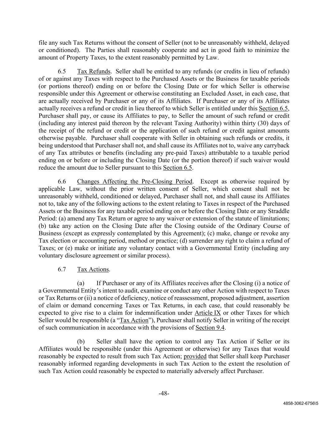 -48- 4858-3062-6756\5 file any such Tax Returns without the consent of Seller (not to be unreasonably withheld, delayed or conditioned). The Parties shall reasonably cooperate and act in good faith to minimize the amount of Property Taxes, to the extent reasonably permitted by Law. 6.5 Tax Refunds. Seller shall be entitled to any refunds (or credits in lieu of refunds) of or against any Taxes with respect to the Purchased Assets or the Business for taxable periods (or portions thereof) ending on or before the Closing Date or for which Seller is otherwise responsible under this Agreement or otherwise constituting an Excluded Asset, in each case, that are actually received by Purchaser or any of its Affiliates. If Purchaser or any of its Affiliates actually receives a refund or credit in lieu thereof to which Seller is entitled under this Section 6.5, Purchaser shall pay, or cause its Affiliates to pay, to Seller the amount of such refund or credit (including any interest paid thereon by the relevant Taxing Authority) within thirty (30) days of the receipt of the refund or credit or the application of such refund or credit against amounts otherwise payable. Purchaser shall cooperate with Seller in obtaining such refunds or credits, it being understood that Purchaser shall not, and shall cause its Affiliates not to, waive any carryback of any Tax attributes or benefits (including any pre-paid Taxes) attributable to a taxable period ending on or before or including the Closing Date (or the portion thereof) if such waiver would reduce the amount due to Seller pursuant to this Section 6.5. 6.6 Changes Affecting the Pre-Closing Period. Except as otherwise required by applicable Law, without the prior written consent of Seller, which consent shall not be unreasonably withheld, conditioned or delayed, Purchaser shall not, and shall cause its Affiliates not to, take any of the following actions to the extent relating to Taxes in respect of the Purchased Assets or the Business for any taxable period ending on or before the Closing Date or any Straddle Period: (a) amend any Tax Return or agree to any waiver or extension of the statute of limitations; (b) take any action on the Closing Date after the Closing outside of the Ordinary Course of Business (except as expressly contemplated by this Agreement); (c) make, change or revoke any Tax election or accounting period, method or practice; (d) surrender any right to claim a refund of Taxes; or (e) make or initiate any voluntary contact with a Governmental Entity (including any voluntary disclosure agreement or similar process). 6.7 Tax Actions. (a) If Purchaser or any of its Affiliates receives after the Closing (i) a notice of a Governmental Entity’s intent to audit, examine or conduct any other Action with respect to Taxes or Tax Returns or (ii) a notice of deficiency, notice of reassessment, proposed adjustment, assertion of claim or demand concerning Taxes or Tax Returns, in each case, that could reasonably be expected to give rise to a claim for indemnification under Article IX or other Taxes for which Seller would be responsible (a “Tax Action”), Purchaser shall notify Seller in writing of the receipt of such communication in accordance with the provisions of Section 9.4. (b) Seller shall have the option to control any Tax Action if Seller or its Affiliates would be responsible (under this Agreement or otherwise) for any Taxes that would reasonably be expected to result from such Tax Action; provided that Seller shall keep Purchaser reasonably informed regarding developments in such Tax Action to the extent the resolution of such Tax Action could reasonably be expected to materially adversely affect Purchaser.